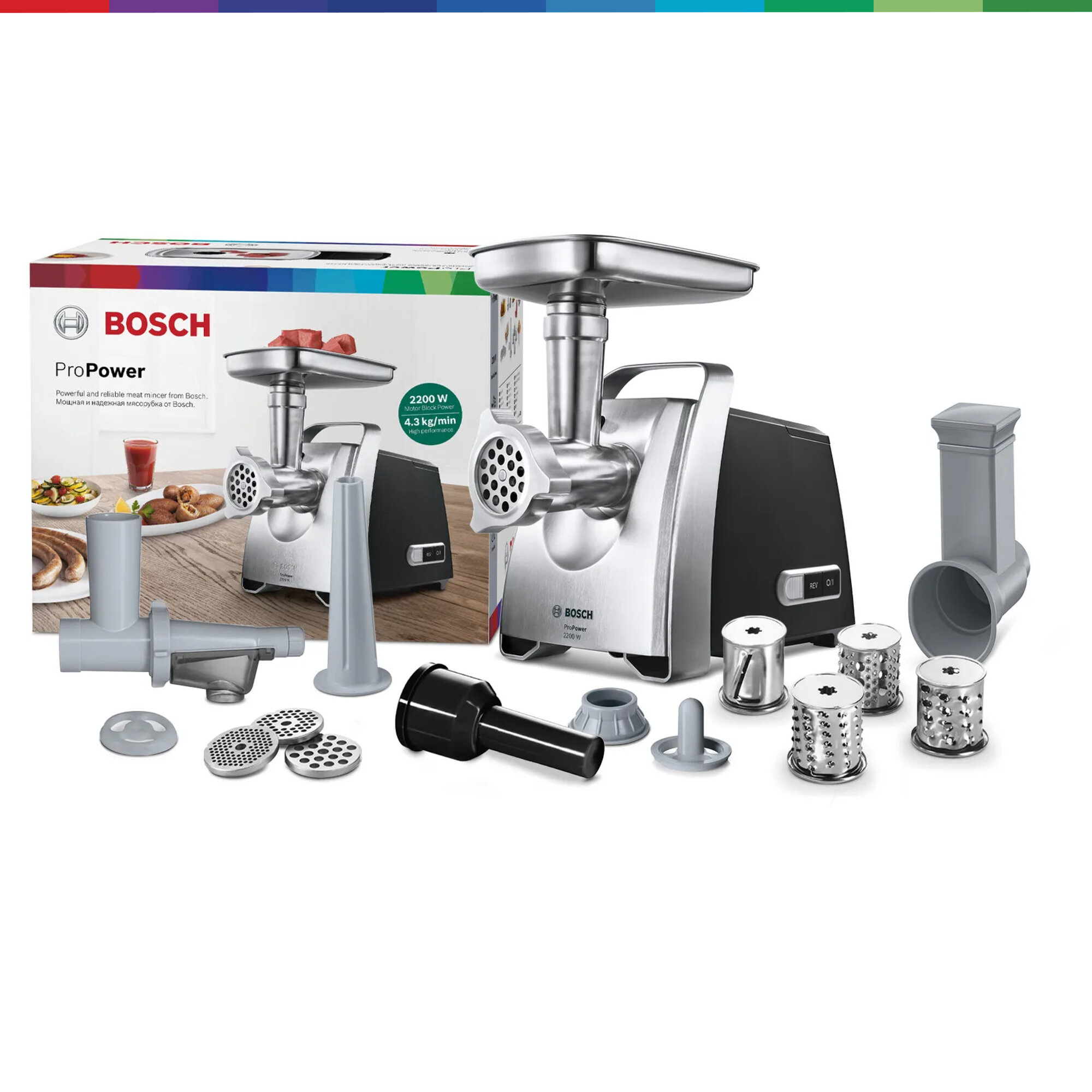 • Размеры прибора: 254 x 199 x 295 мм • Размеры прибора в упаковке: 328 x 283 x 398 мм • Уровень шума: 80 дБ (A) при 1 пВт • Возможности: Приготовление фарша / Формирование кеббе / Формирование колбас / Шинковка и резка / Нарезка слайсами