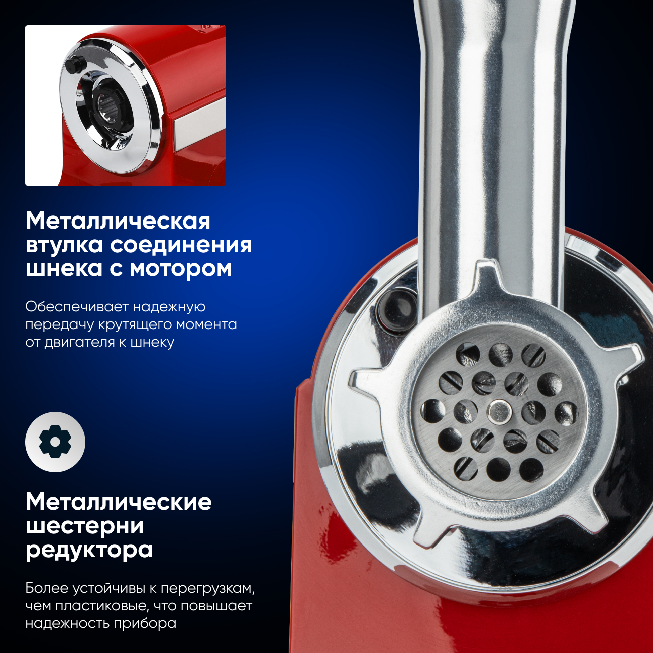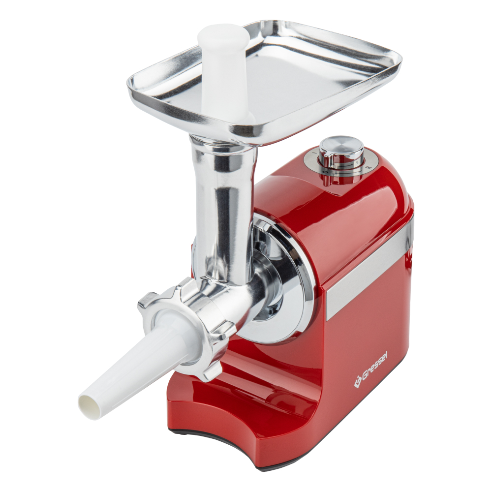 Мясорубка Gressel оснащена металлическими шестернями, что повышает её надежность и устойчивость к перегрузкам, а также обеспечивает долгий срок службы. Две скорости работы и дополнительная функция реверса позволяют эффективно обрабатывать как жесткое, так и мягкое мясо. Удобный реверс помогает легко освободить шнек от застреваний.