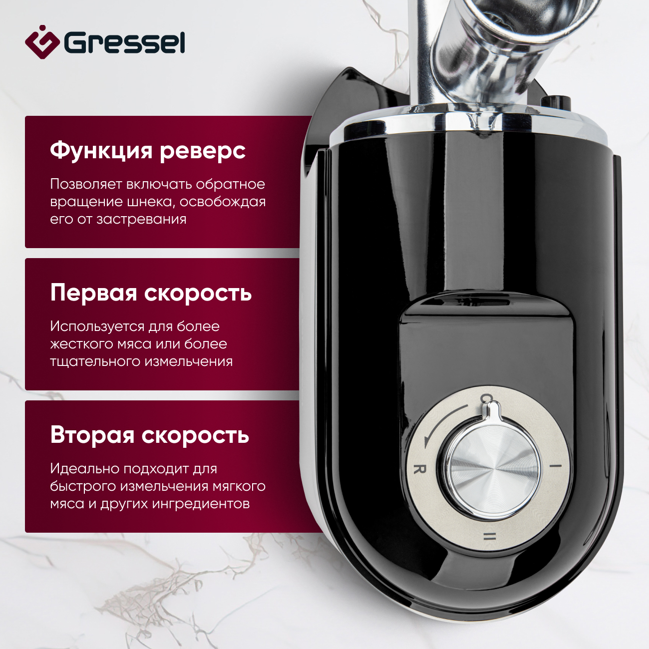Мясорубка Gressel оснащена металлическими шестернями, что повышает её надежность и устойчивость к перегрузкам, а также обеспечивает долгий срок службы. Две скорости работы и дополнительная функция реверса позволяют эффективно обрабатывать как жесткое, так и мягкое мясо. Удобный реверс помогает легко освободить шнек от застреваний.
