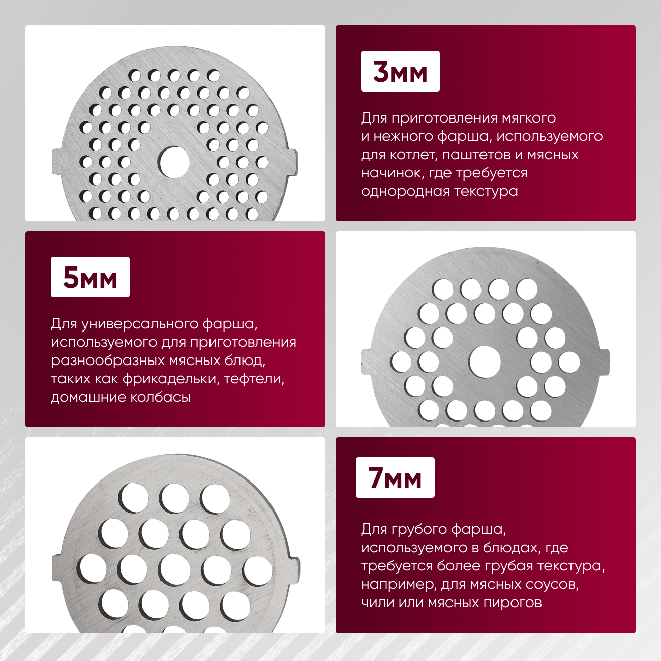 Комплектация включает насадки для приготовления колбасок и кеббе, а также три решетки разного диаметра для идеальной текстуры фарша — от нежного паштета до грубых мясных соусов. Технология PowerSafe Pro защищает двигатель от перегрева и перегрузок, автоматически останавливая его при обнаружении препятствий, что значительно увеличивает срок службы устройства.