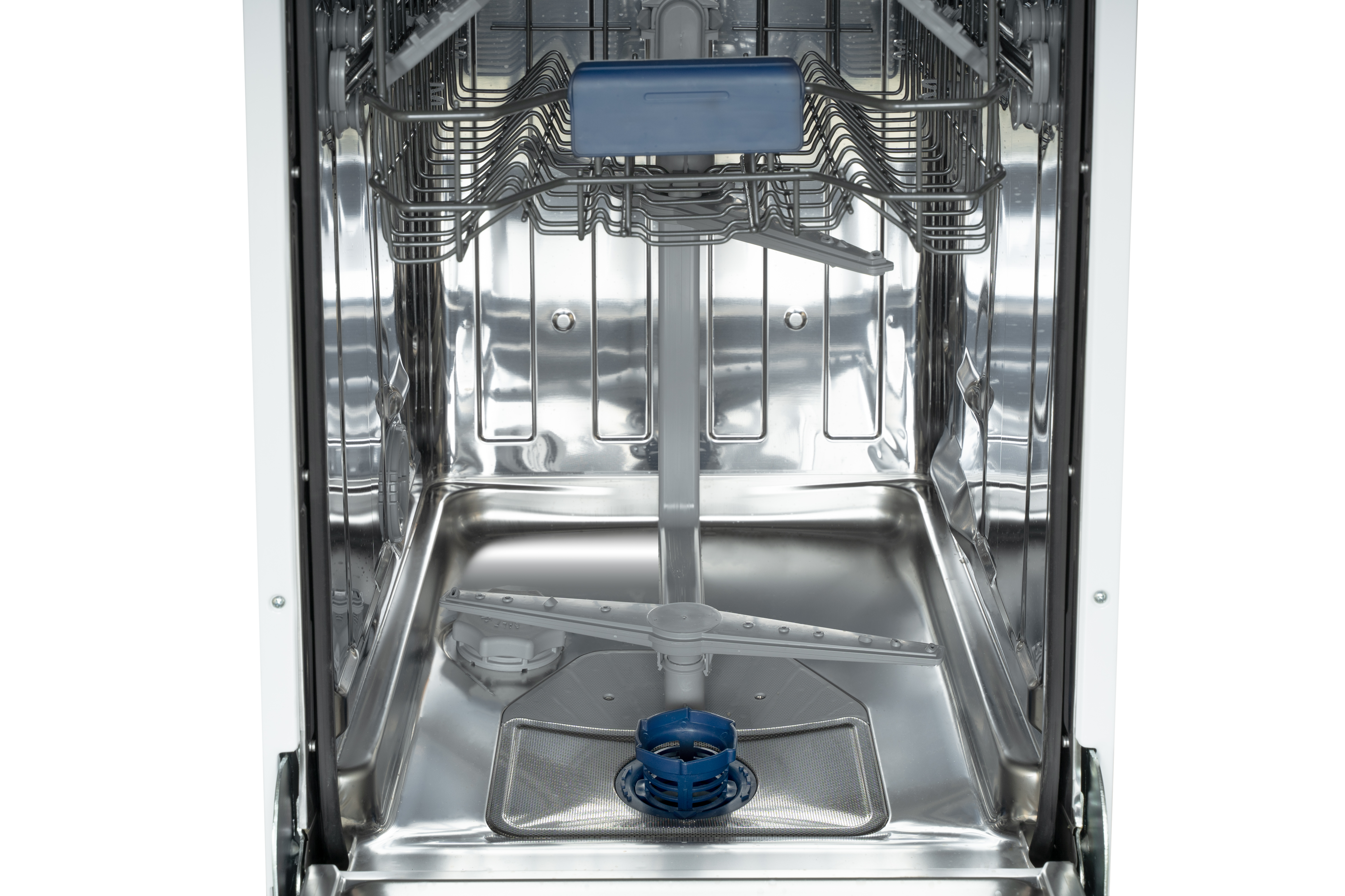3) Компактность: ширина 45 см, вместимость 10 комплектов, Две корзины+лоток для столовых приборов
