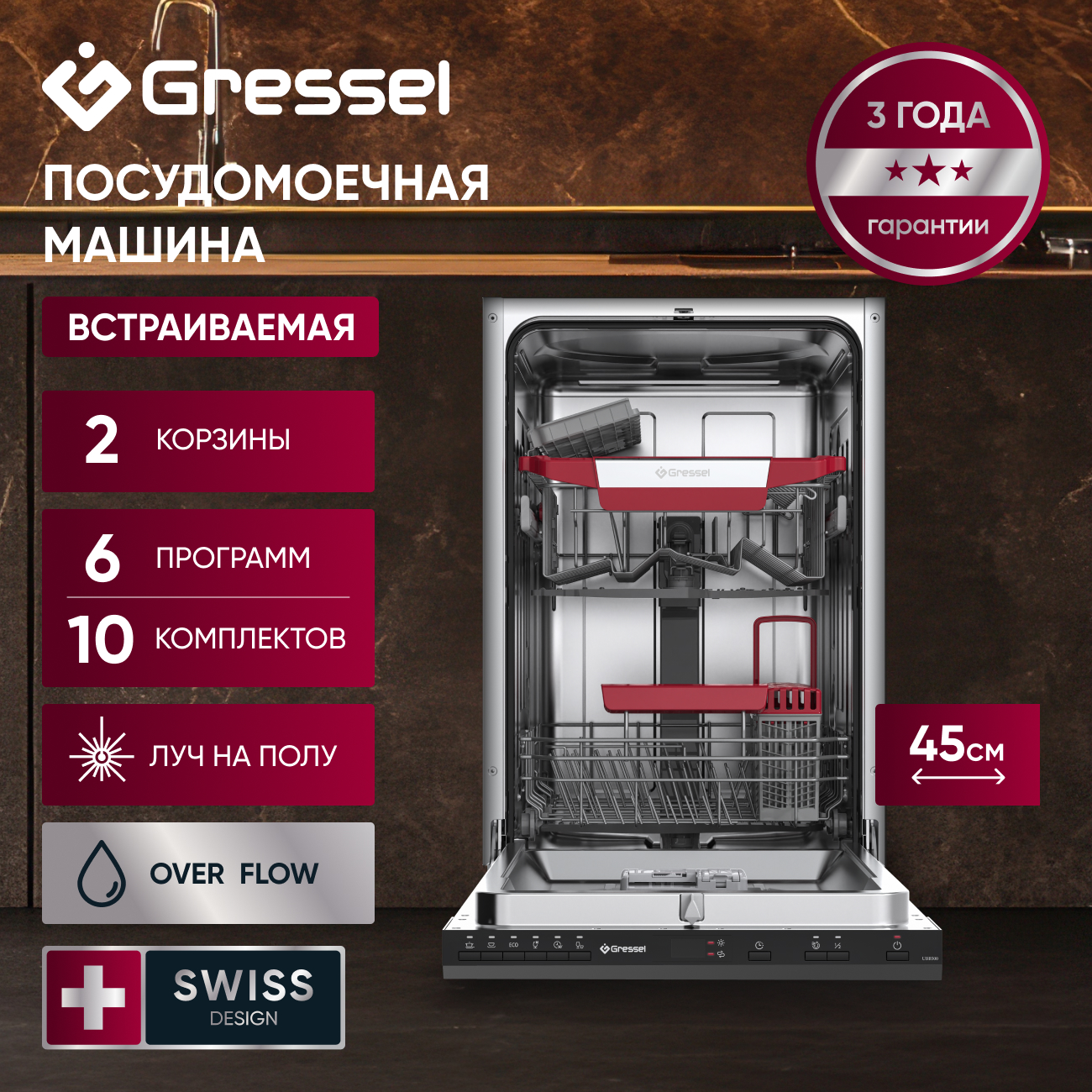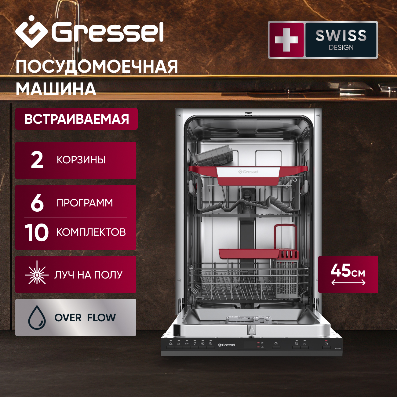 Элегантный черный цвет панели управления делает технику незаметной за фасадом шкафа, а современный интерфейс с кнопочным управлением интуитивно понятен. Корзины легко перестраиваются под разную посуду — от мелких чашек до больших кастрюль. Если вы хотите оптимизировать кухонное пространство и при этом не жертвовать качеством мытья, Gressel UBB500 станет отличным решением.
