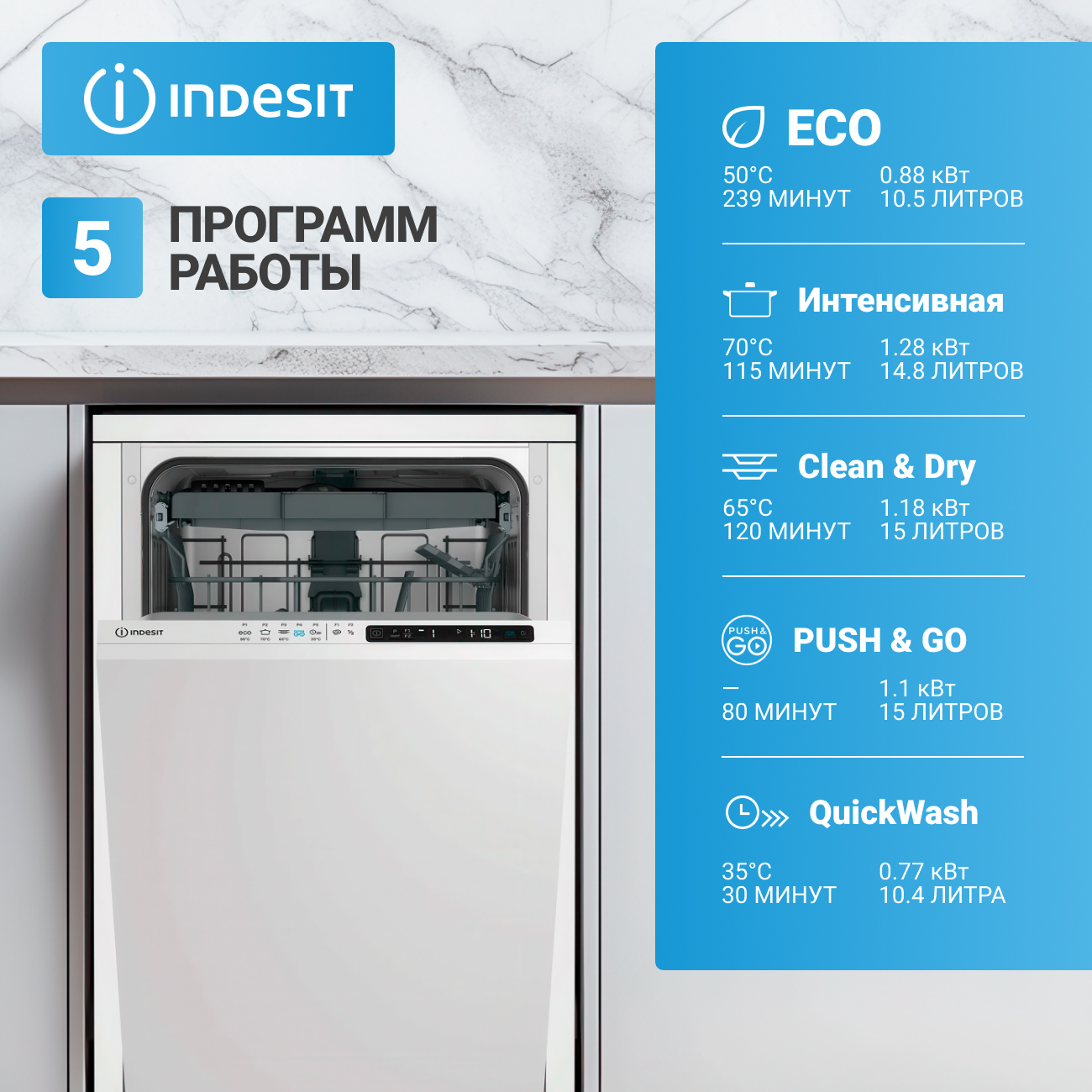 Посудомоечная машина Indesit DIS 2C50 встраивается в кухонные шкафы, что позволяет сохранить гармоничный внешний вид кухни. Она вмещает до 9 комплектов посуды и подойдет для семейного использования. Устройство потребляет 10.5 литров воды на один цикл, а значит экономично расходует ресурсы. Энергопотребление составляет 880 Вт*ч за цикл, что позволяет снизить затраты на электроэнергию. Модель оснащена дисплеем для удобного управления и мониторинга процесса мойки. Встроенная защита от протечек защитит от непредвиденной утечки воды. Таймер отсрочки запуска позволяет планировать начало работы машины в удобное время. Indesit DIS 2C50 включает экспресс-программу, которая позволяет быстро завершить цикл мойки, что удобно для срочного использования посуды. Конденсационный тип сушки не оставляет влаги на посуде. Корзина для столовых приборов идет в комплекте и упрощает организацию посуды в машине.