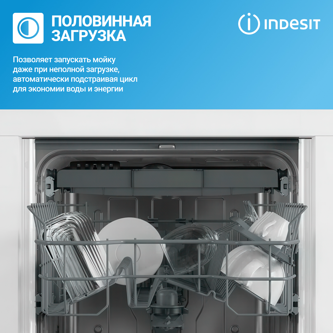 Функция «Половинная загрузка» - Экономьте время, воду и электроэнергию с функцией половинной загрузки, если вы не привыкли ждать заполнения всех корзин посудомоечной машины для ее запуска. Функция работает совместно со всеми основными программами.