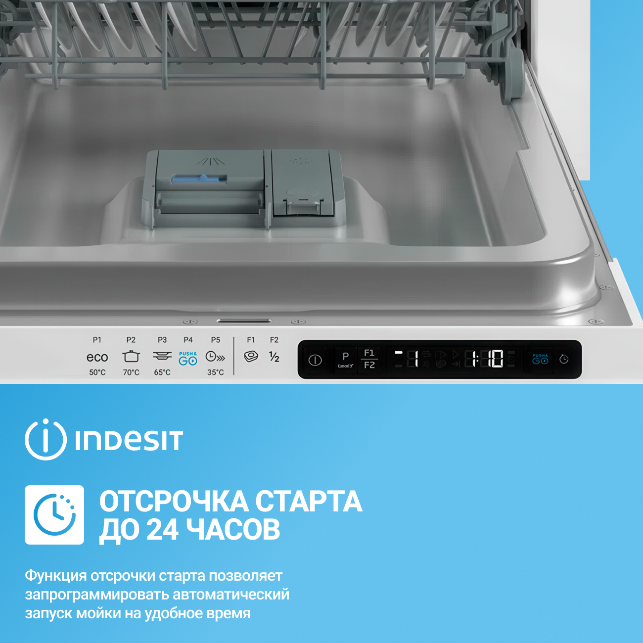 Пусть посудомоечная машина работает тогда, когда удобно вам. Установите время отложенного старта и спокойно занимайтесь своими делами, отдыхайте или отправляйтесь на работу.