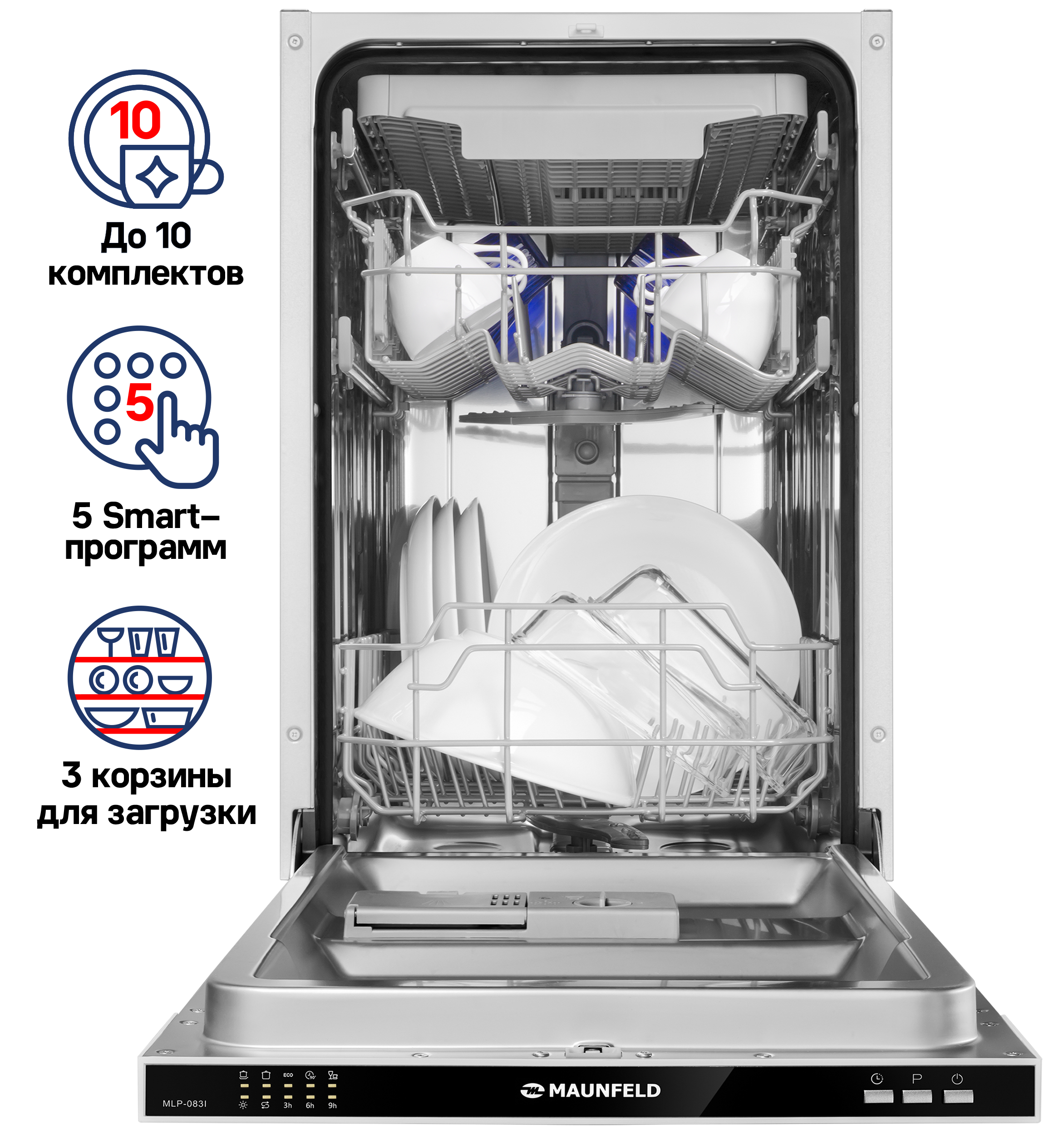 Благодаря использованию специально разработанных корзин MLP-083I позволяет вымыть 10 комплектов посуды.