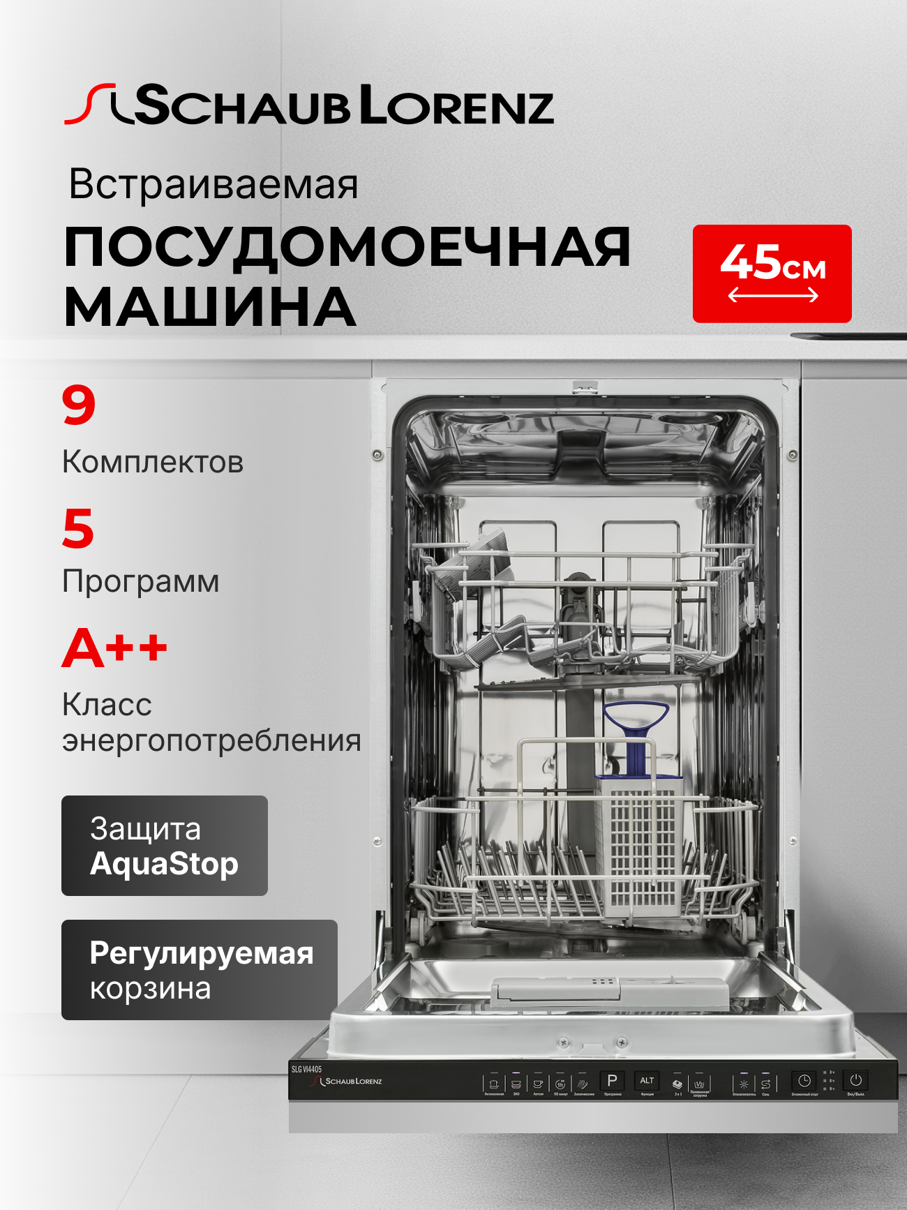 Schaub Lorenz SLG VI4405 — встраиваемая посудомоечная машина шириной 45 см, идеально подходящая для небольших кухонь. При компактных размерах она вмещает до 9 комплектов посуды, что делает её отличным выбором для семьи из 2–3 человек. Модель оснащена пятью программами мойки, включая интенсивную, эко-режим, быструю и деликатную мойку, что позволяет подобрать оптимальный вариант для любой степени загрязнения.