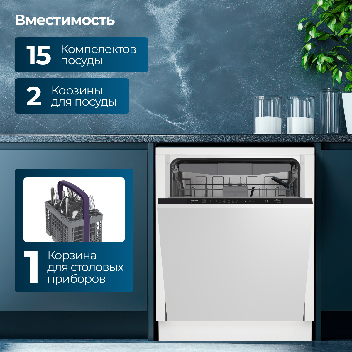 Вместительная и производительная посудомоечная машина шириной 60 см с загрузкой на 15 комплектов посуды. Оснащена тремя корзинами и технологией AquaIntense - в нижней корзине установлен дополнительный подвижный разбрызгиватель, позволяющий эффективно отмывать особо загрязненную посуду, например, сковороды. Данная посудомоечная машина идеальна для большой семьи: благодаря тихому инверторному мотору ProSmart ее можно включать ночью, не боясь разбудить домочадцев. Имеет 6 программ мытья, в том числе особо бережный режим GlassCare для мытья стекла. Машинка также быстро сушит посуду за счет встроенного вентилятора. Система смягчения воды позволяет избежать появления известкового налета, а световые индикаторы вовремя предупредят о протечке, отсутствии соли или ополаскивателя. Световой индикатор на полу LedSpot сообщит о завершении цикла мойки.