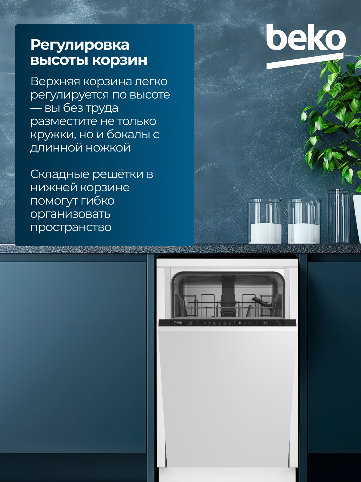 2 полки в верхней корзине, 2складных держателя в нижней корзине, 3-х позиционная регулировка высоты верхней корзины, LЕD дисплей