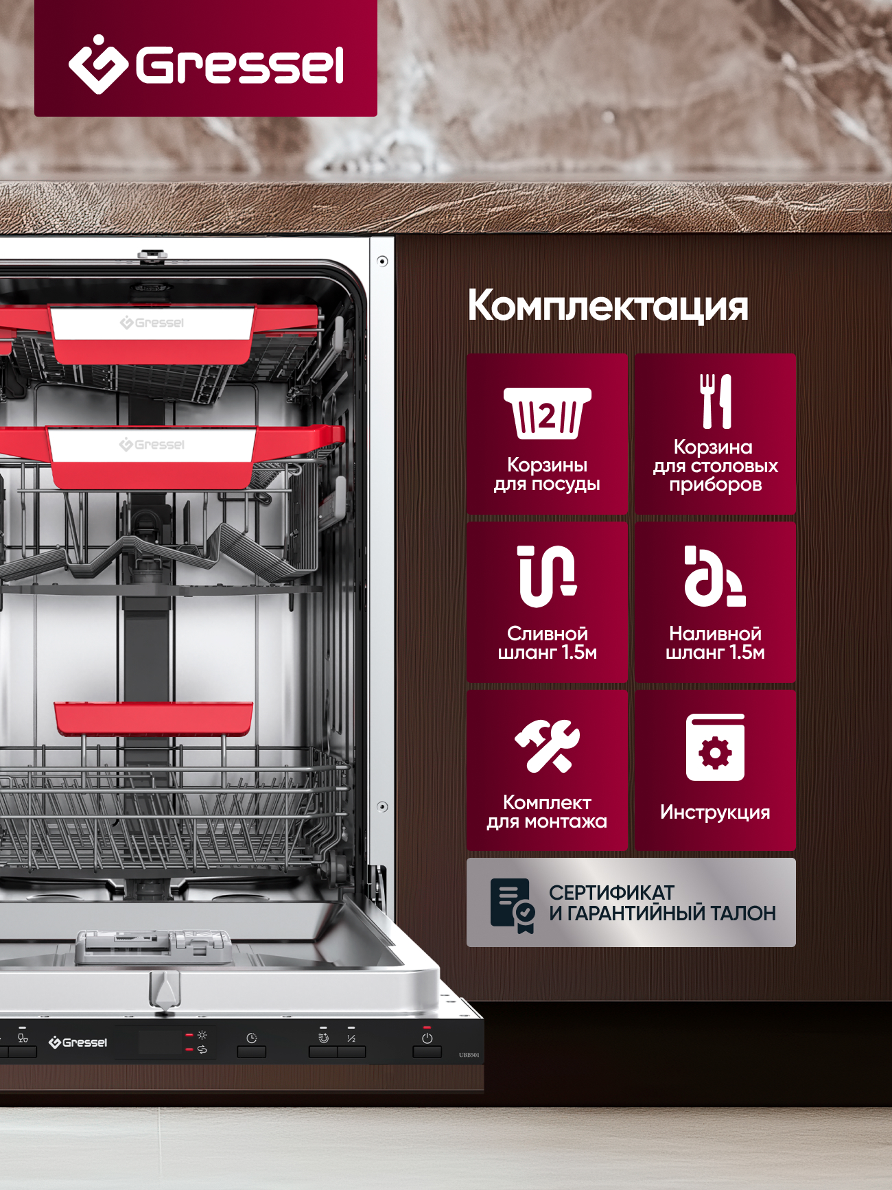 Посудомоечная машина, инструкция, гарантийный талон, сертификат дополнительной гарантии, шнур питания (с вилкой)