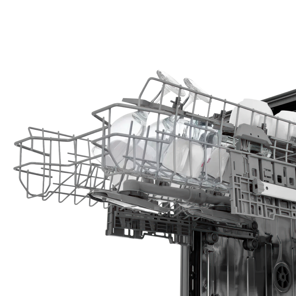 Регулировка высоты: Верхняя корзина легко регулируется, а складные элементы в нижней корзине обеспечивают гибкость размещения посуды.