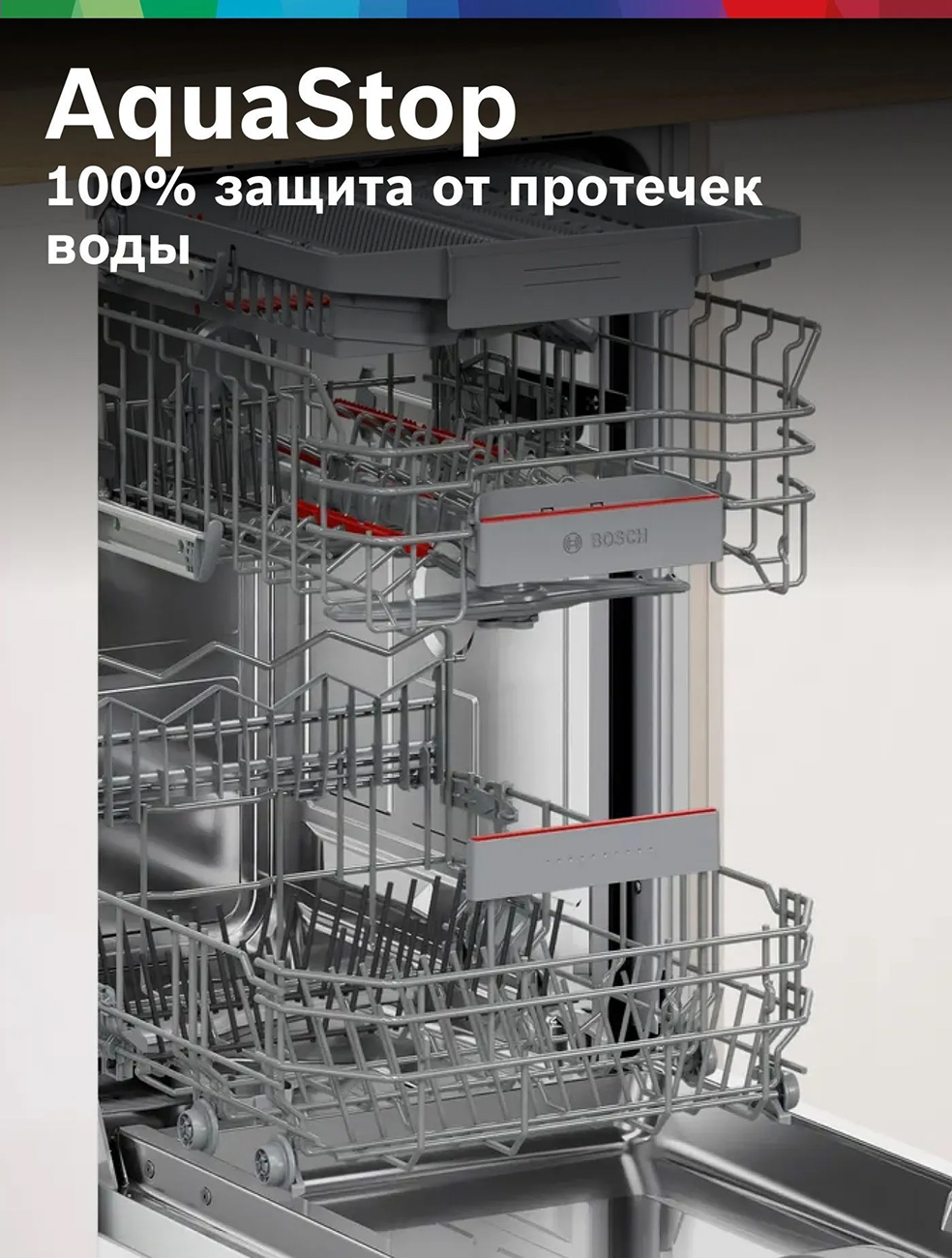 Трудно представить себе случайное повреждение стиральной или посудомоечной машины Bosch. Даже для нарушения целостности наливного шланга потребуются немалые механические усилия. Но, если подобная аварийная ситуация все-таки произойдет, сработает система АquaStop («ВодаСтоп»): при достижении определенного уровня воды в страховочной емкости срабатывает поплавковый выключатель, и клапаны перекрывают водоснабжение агрегата.