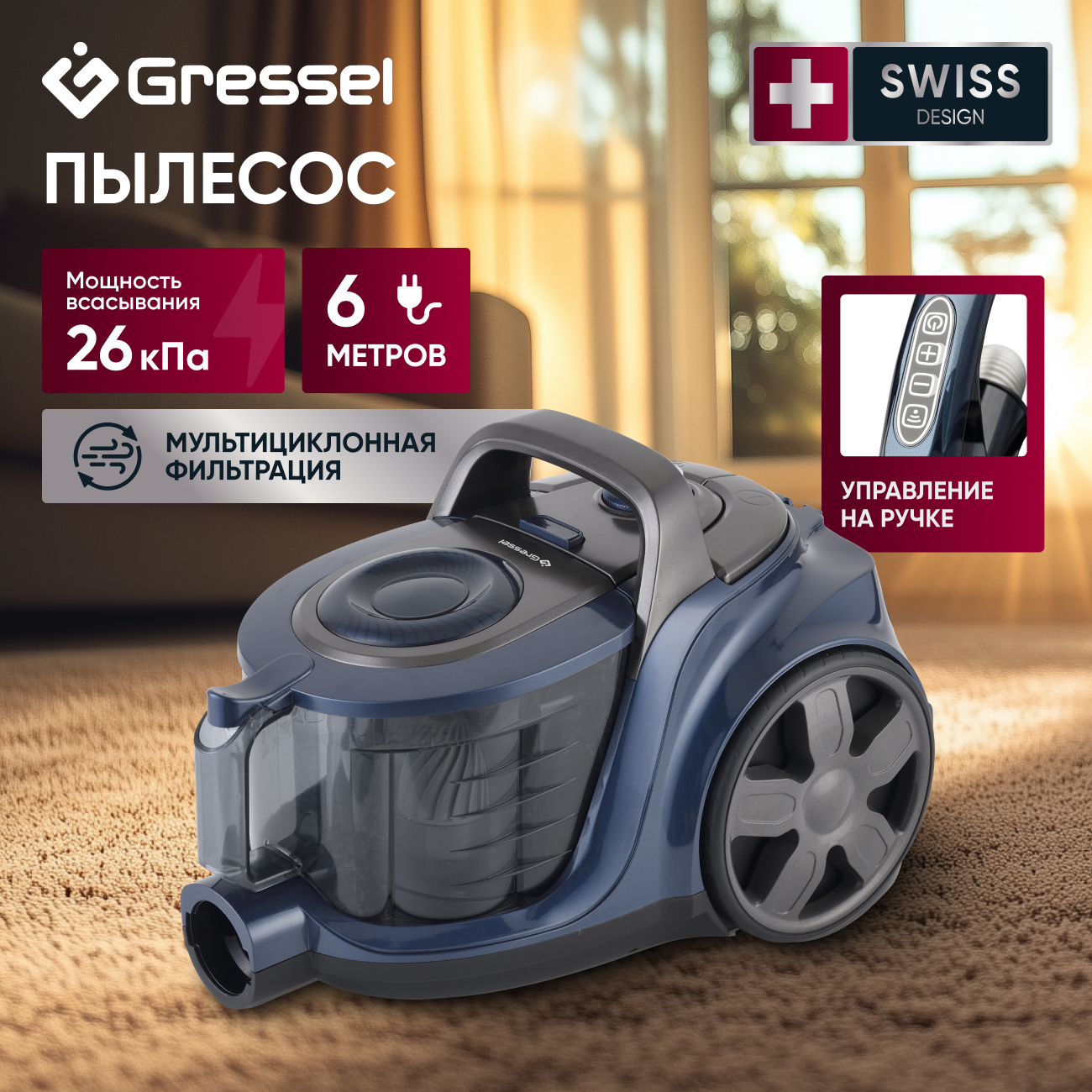 Бытовой пылесос Gressel GVC-6202 с мультициклонной фильтрацией и регулятором мощности на ручке