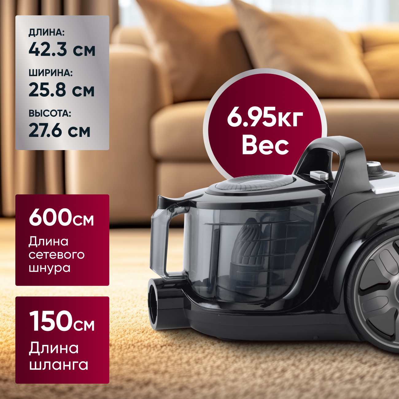 Регулятор мощности удобно размещён на ручке и дублируется на корпусе, при этом индикатор сообщит, когда активировано беспроводное управление. Контейнер объёмом 3 литра освобождается за считанные секунды, а прорезинённые колёса и вес всего 6,95 кг помогают без труда передвигать пылесос по квартире. Телескопическая труба (54–90 см) адаптируется под ваш рост, а шнур длиной 6 м и гибкий шланг 150 см дают возможность убирать в радиусе до нескольких метров, не меняя розетку.