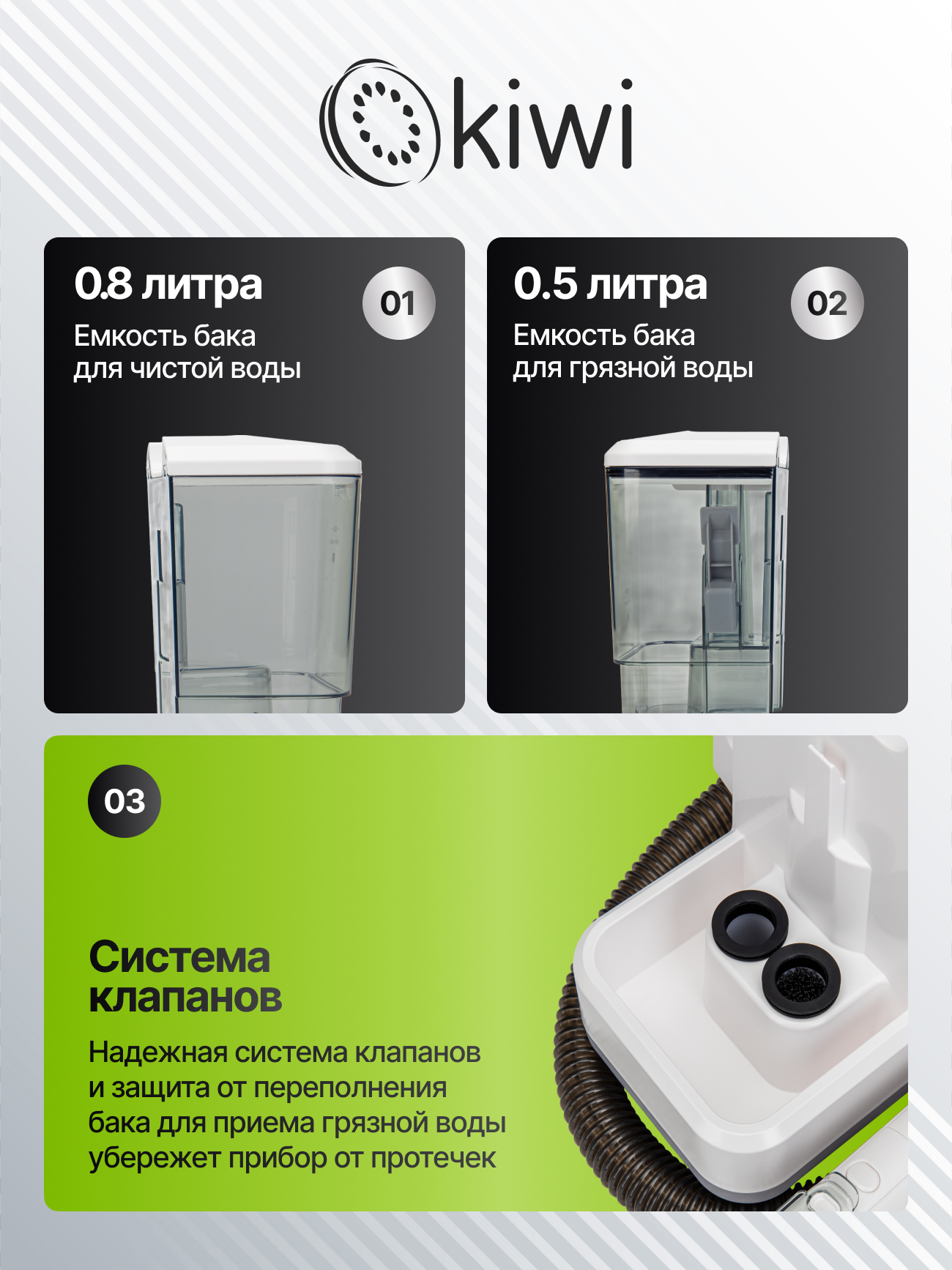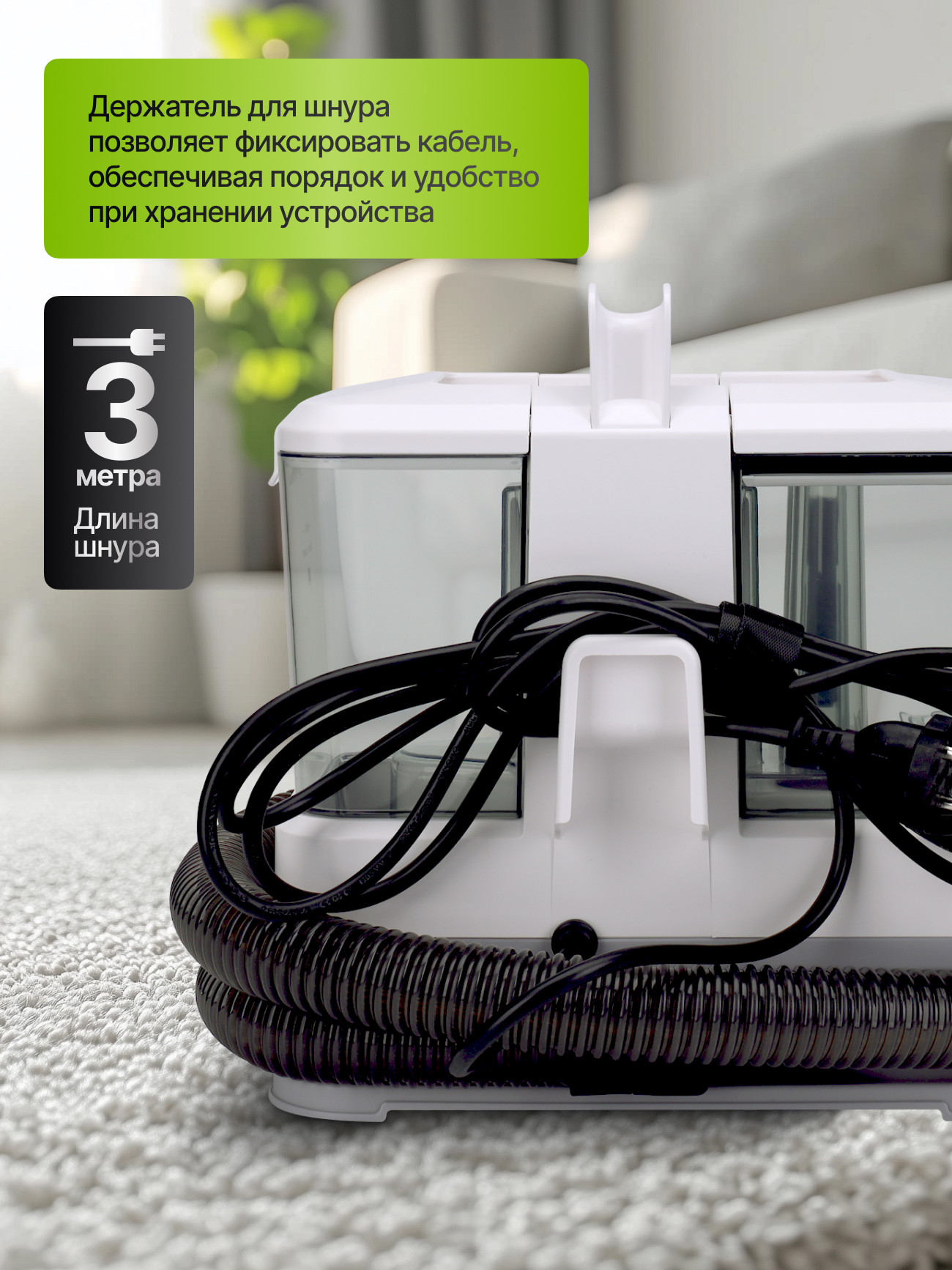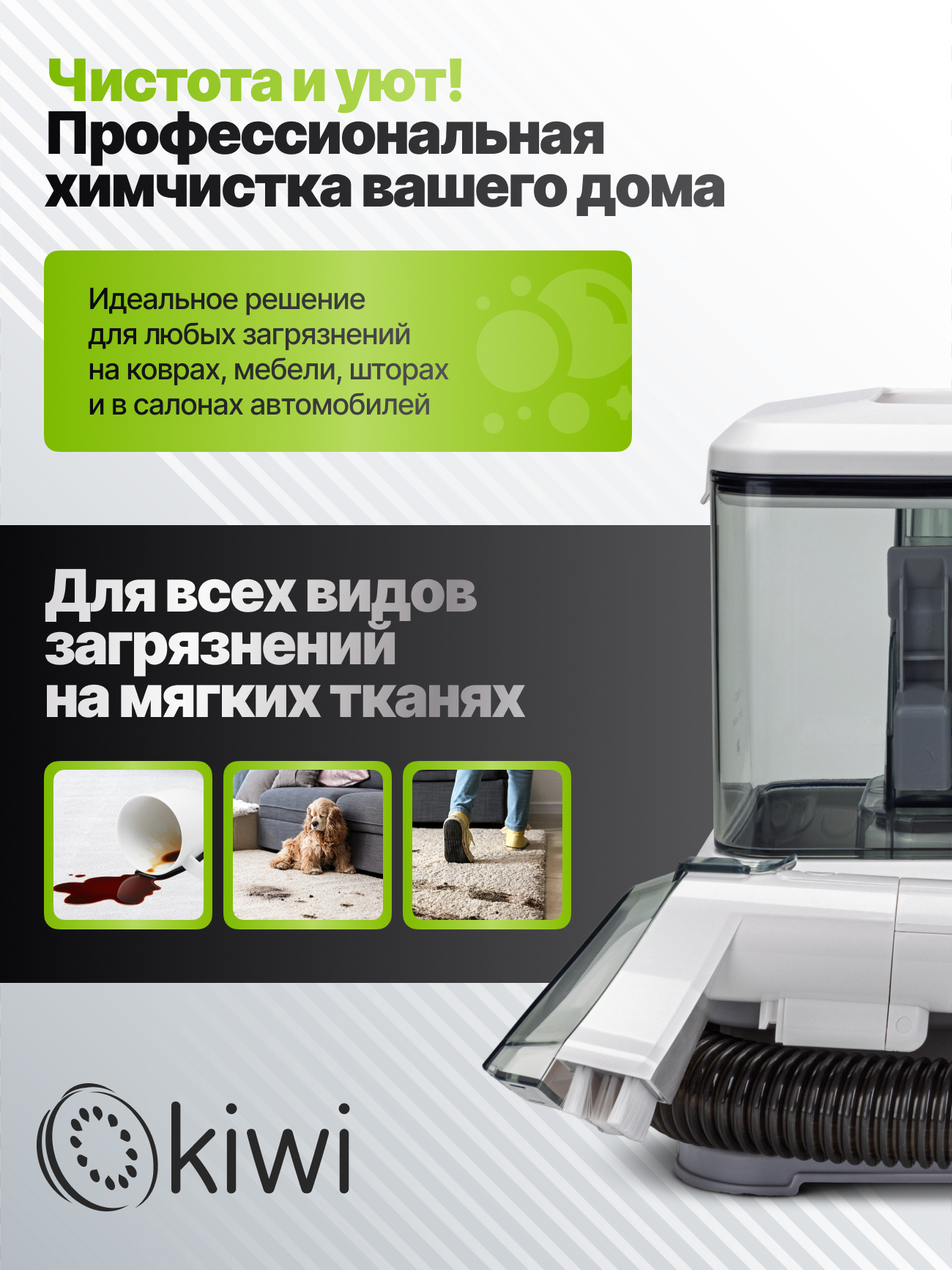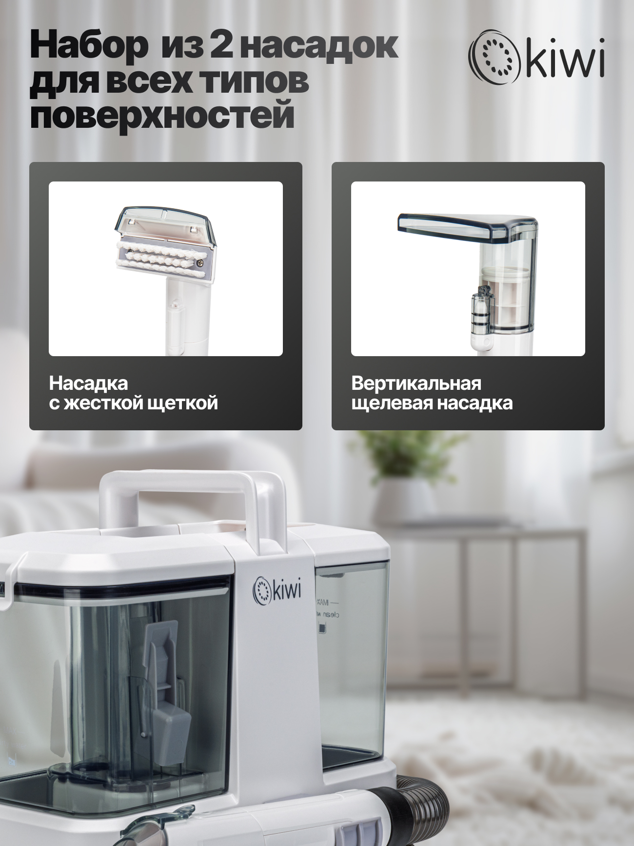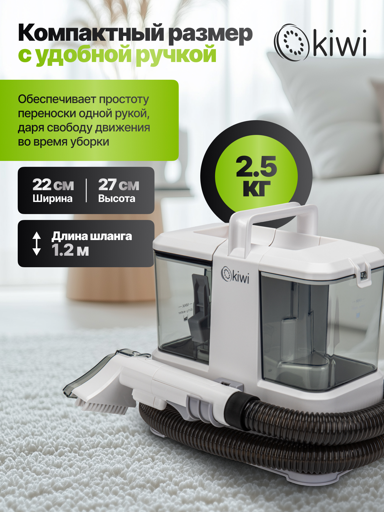 Моющий пылесос Kiwi KCC-4318 создан для эффективной влажной уборки дома и станет надежным помощником в уходе за чистотой. Компактная и удобная модель сочетает в себе функциональность и простоту использования. Благодаря мощности 350 Вт и силе всасывания 150 Вт пылесос легко справляется с пылью, шерстью домашних животных и въевшимися загрязнениями. Устройство оснащено двумя резервуарами: бак для чистой воды объемом 0,8 литра и бак для грязной воды на 0,5 литра, что позволяет производить полноценную влажную уборку без постоянной остановки для опорожнения. Моющий пылесос оснащен набором насадок, среди которых жесткая щетка для глубокой очистки пятен и вертикальная насадка для труднодоступных мест и щелей. Удобная длина шланга 1,2 м и сетевого шнура 3 м обеспечивает свободу перемещений во время уборки, а пластиковый корпус отличается легкостью и прочностью. Уровень шума не превышает 82 дБ, что делает работу менее утомительной. Моющий пылесос Kiwi KCC-4318 подойдет для влажной уборки твердых полов, ковровых покрытий и мягкой мебели, сохраняя свежесть и чистоту в доме. Модель оснащена системой защиты от перегрева и соответствует классу защиты IPX4, что гарантирует безопасное использование. Надежный и компактный пылесос станет отличным выбором для квартиры, дома или офиса, где важна быстрая и качественная уборка.