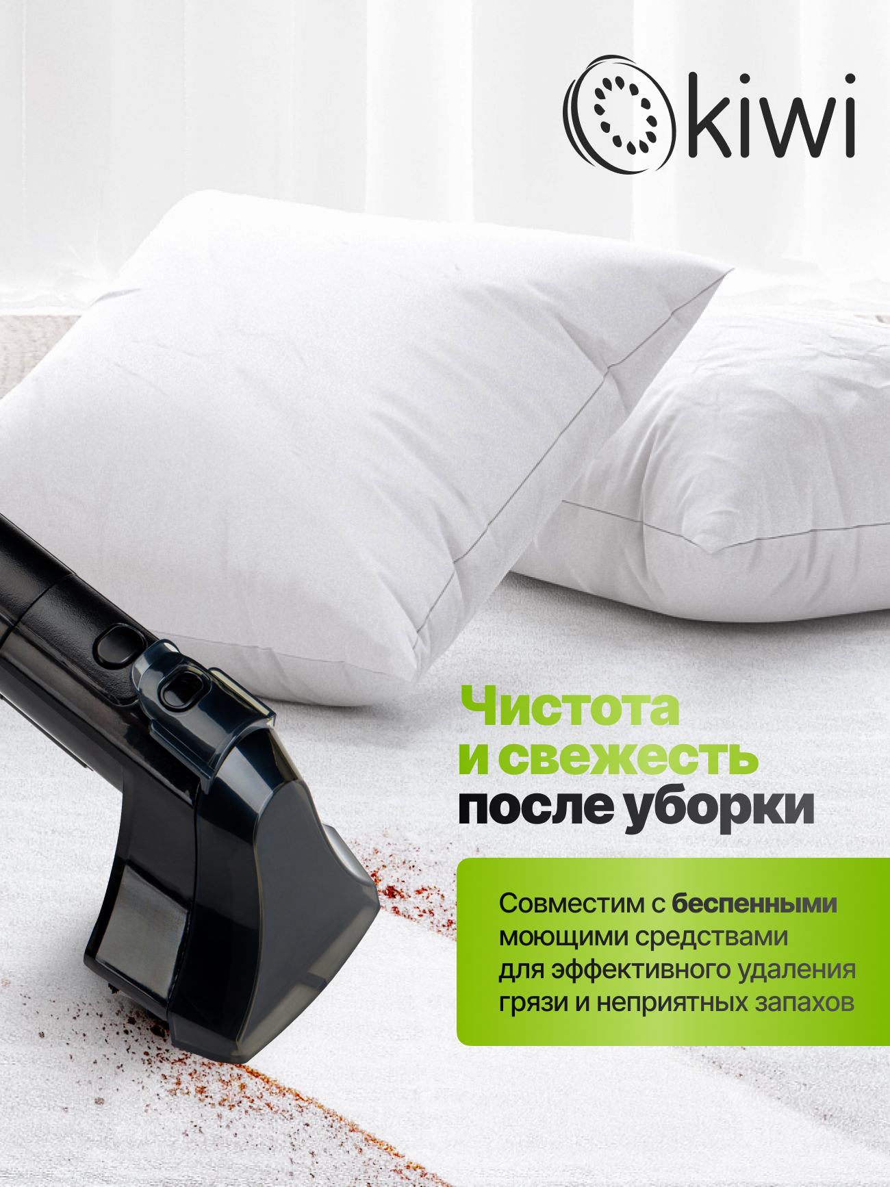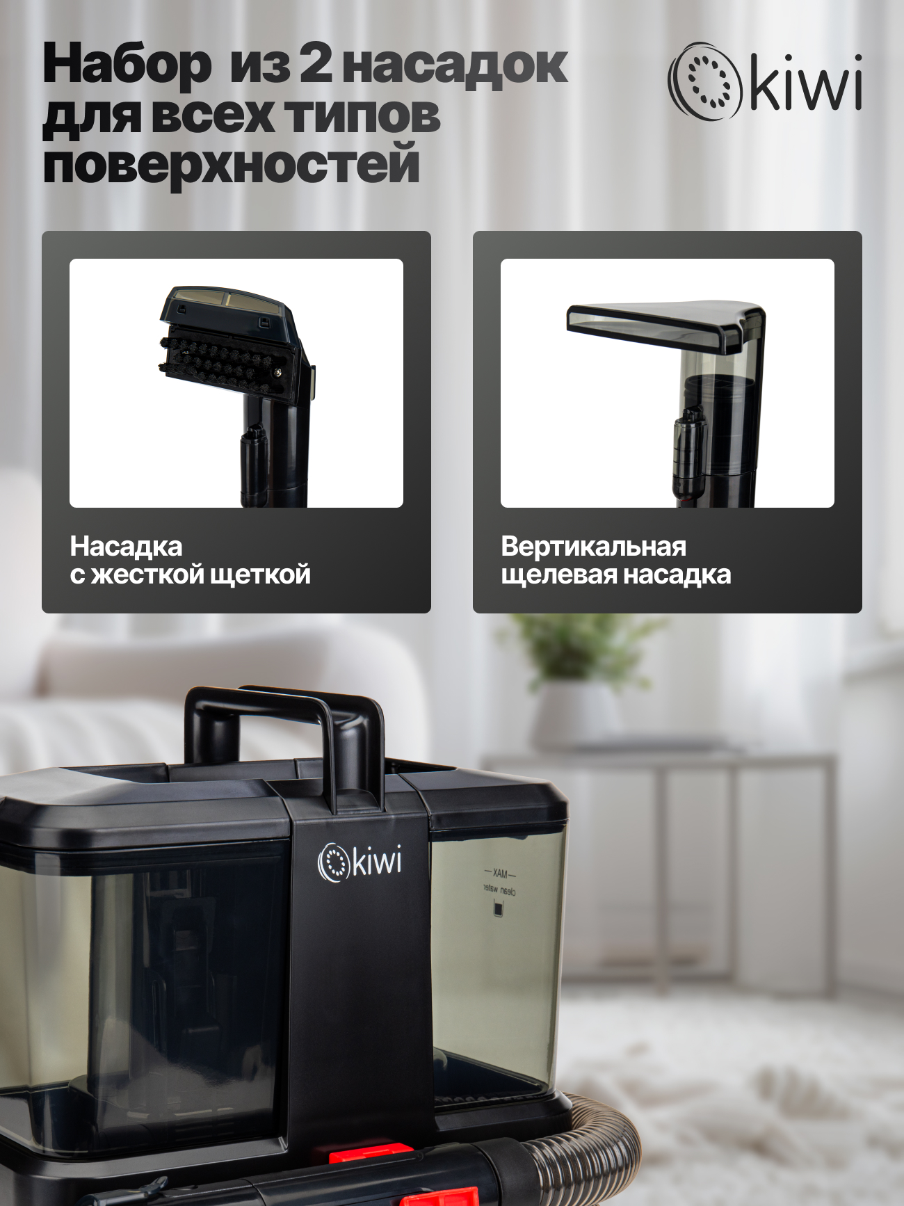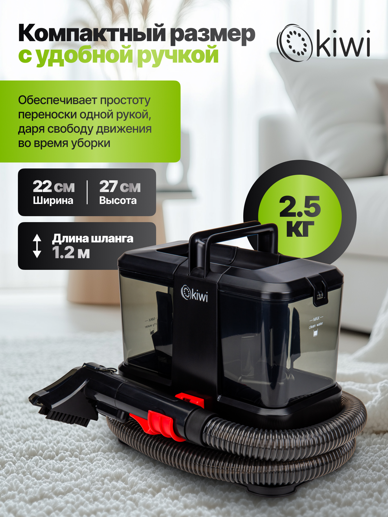 Моющий пылесос Kiwi KCC-4318B создан для эффективной влажной уборки дома и станет надежным помощником в уходе за чистотой. Компактная и удобная модель сочетает в себе функциональность и простоту использования. Благодаря мощности 350 Вт и силе всасывания 150 Вт пылесос легко справляется с пылью, шерстью домашних животных и въевшимися загрязнениями. Устройство оснащено двумя резервуарами: бак для чистой воды объемом 0,8 литра и бак для грязной воды на 0,5 литра, что позволяет производить полноценную влажную уборку без постоянной остановки для опорожнения. Моющий пылесос оснащен набором насадок, среди которых жесткая щетка для глубокой очистки пятен и вертикальная насадка для труднодоступных мест и щелей. Удобная длина шланга 1,2 м и сетевого шнура 3 м обеспечивает свободу перемещений во время уборки, а пластиковый корпус отличается легкостью и прочностью. Уровень шума не превышает 82 дБ, что делает работу менее утомительной. Моющий пылесос Kiwi KCC-4318 подойдет для влажной уборки твердых полов, ковровых покрытий и мягкой мебели, сохраняя свежесть и чистоту в доме. Модель оснащена системой защиты от перегрева и соответствует классу защиты IPX4, что гарантирует безопасное использование. Надежный и компактный пылесос станет отличным выбором для квартиры, дома или офиса, где важна быстрая и качественная уборка.