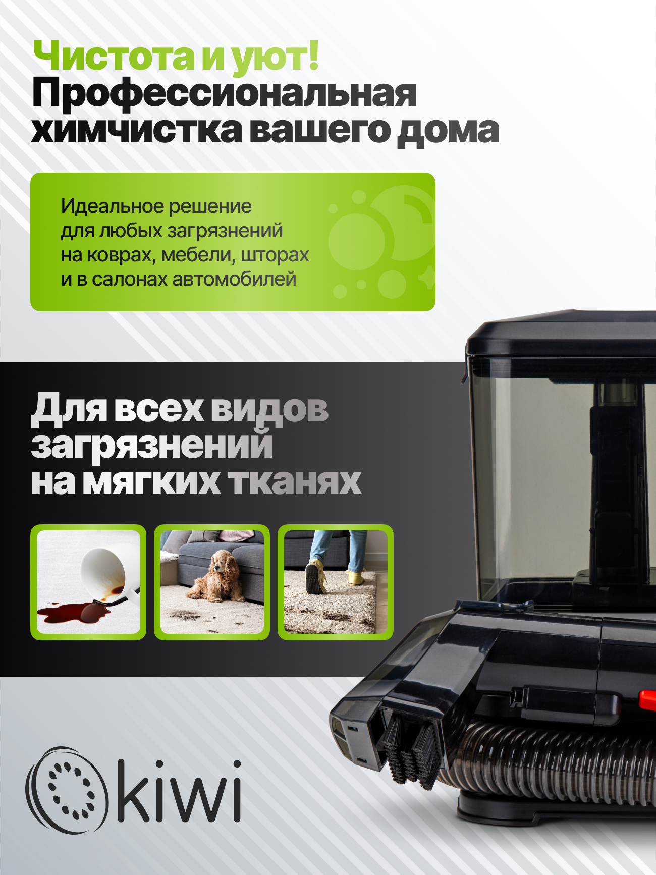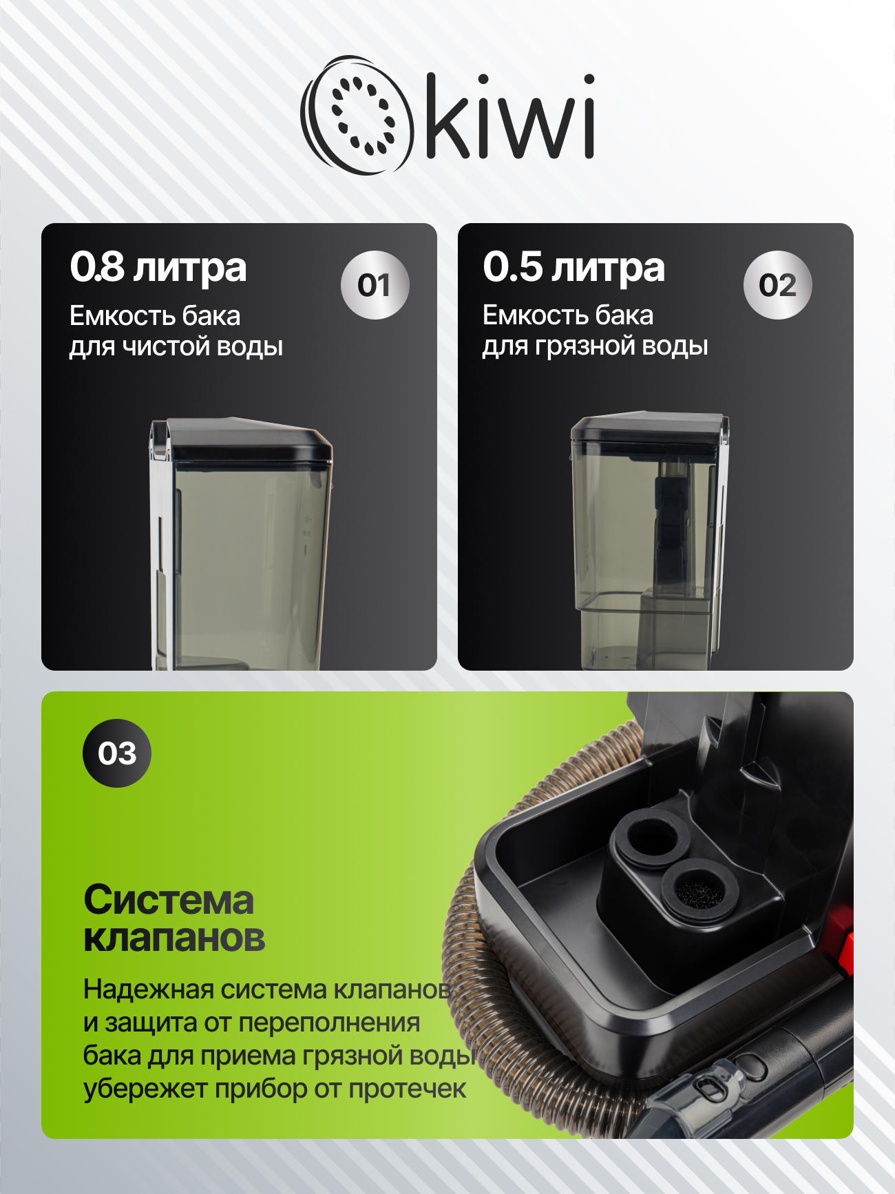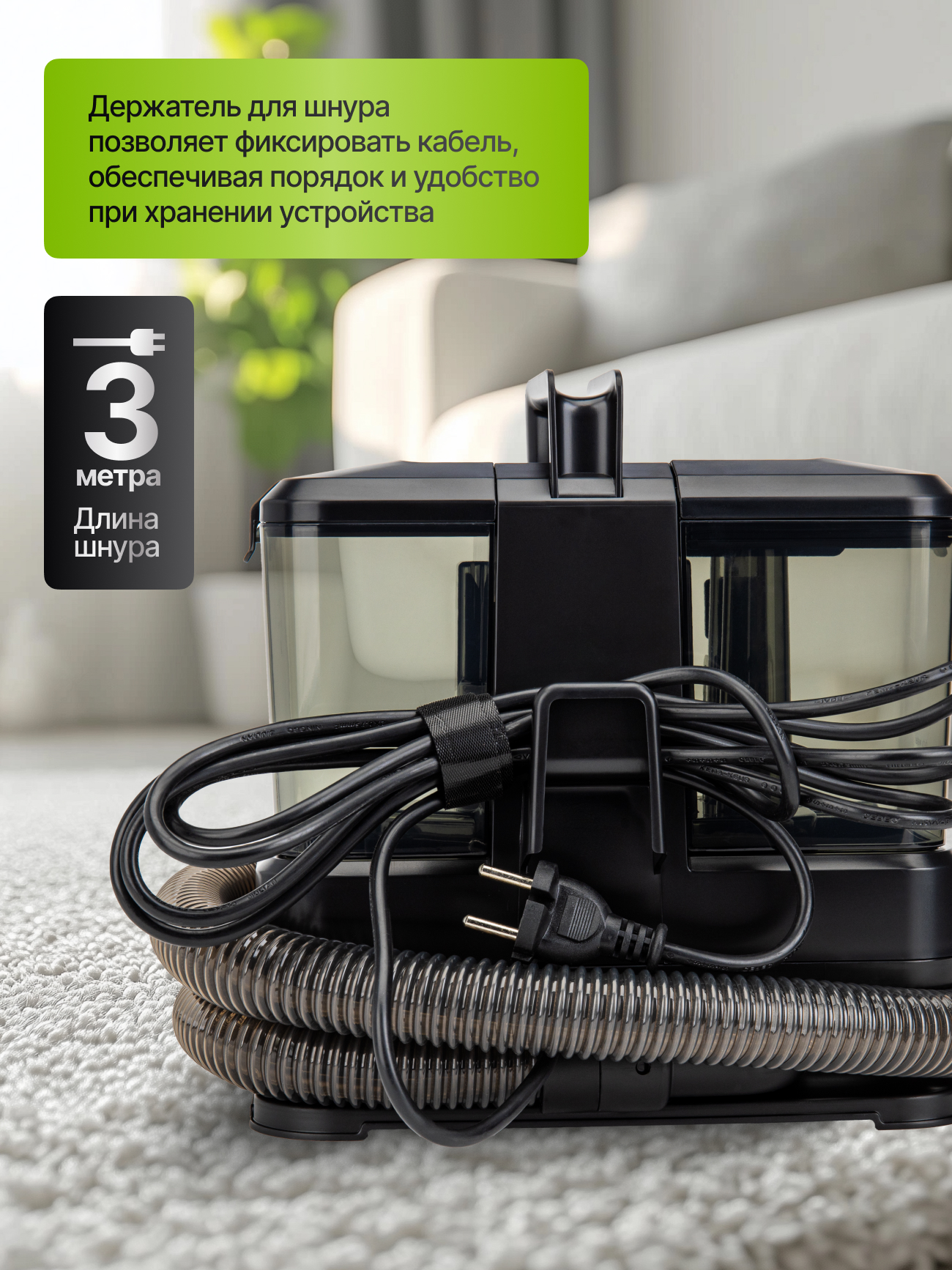 Моющий пылесос Kiwi KCC-4318B создан для эффективной влажной уборки дома и станет надежным помощником в уходе за чистотой. Компактная и удобная модель сочетает в себе функциональность и простоту использования. Благодаря мощности 350 Вт и силе всасывания 150 Вт пылесос легко справляется с пылью, шерстью домашних животных и въевшимися загрязнениями. Устройство оснащено двумя резервуарами: бак для чистой воды объемом 0,8 литра и бак для грязной воды на 0,5 литра, что позволяет производить полноценную влажную уборку без постоянной остановки для опорожнения. Моющий пылесос оснащен набором насадок, среди которых жесткая щетка для глубокой очистки пятен и вертикальная насадка для труднодоступных мест и щелей. Удобная длина шланга 1,2 м и сетевого шнура 3 м обеспечивает свободу перемещений во время уборки, а пластиковый корпус отличается легкостью и прочностью. Уровень шума не превышает 82 дБ, что делает работу менее утомительной. Моющий пылесос Kiwi KCC-4318 подойдет для влажной уборки твердых полов, ковровых покрытий и мягкой мебели, сохраняя свежесть и чистоту в доме. Модель оснащена системой защиты от перегрева и соответствует классу защиты IPX4, что гарантирует безопасное использование. Надежный и компактный пылесос станет отличным выбором для квартиры, дома или офиса, где важна быстрая и качественная уборка.