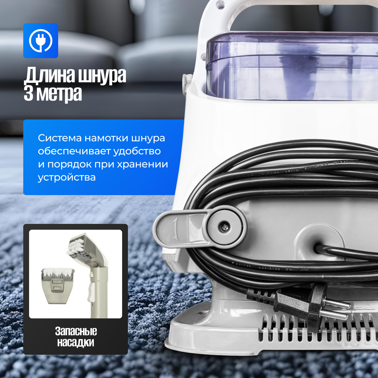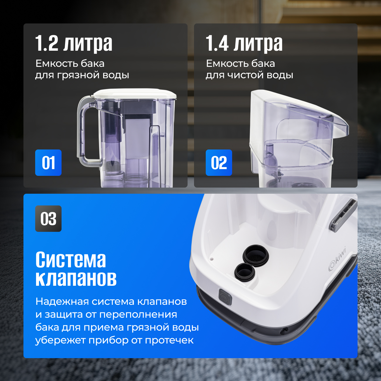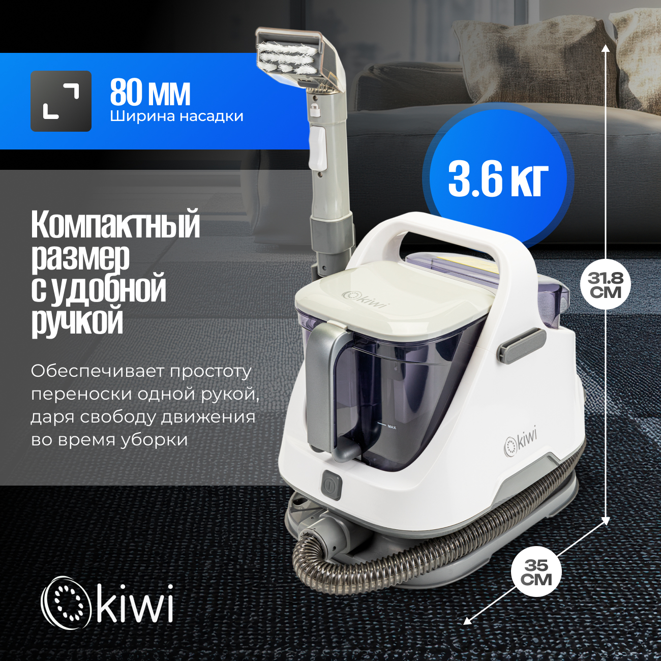 Моющий пылесос KIWI KCC-4320S - мощный инструмент для глубокой чистки ковров, мебели и автомобильных салонов. С мощностью всасывания 12 000 Па и двумя отдельными баками для чистой и грязной воды (1,4 л и 1,2 л соответственно), этот пылесос способен удалить даже самые стойкие пятна и загрязнения, оставляя поверхности чистыми и свежими. Благодаря компактному размеру и удобной ручке, KCC-4320S легко перемещать и хранить, что делает его идеальным выбором для домашнего использования. Надежная система клапанов и защита от переполнения предотвращают протечки, обеспечивая бесперебойную и эффективную работу устройства.