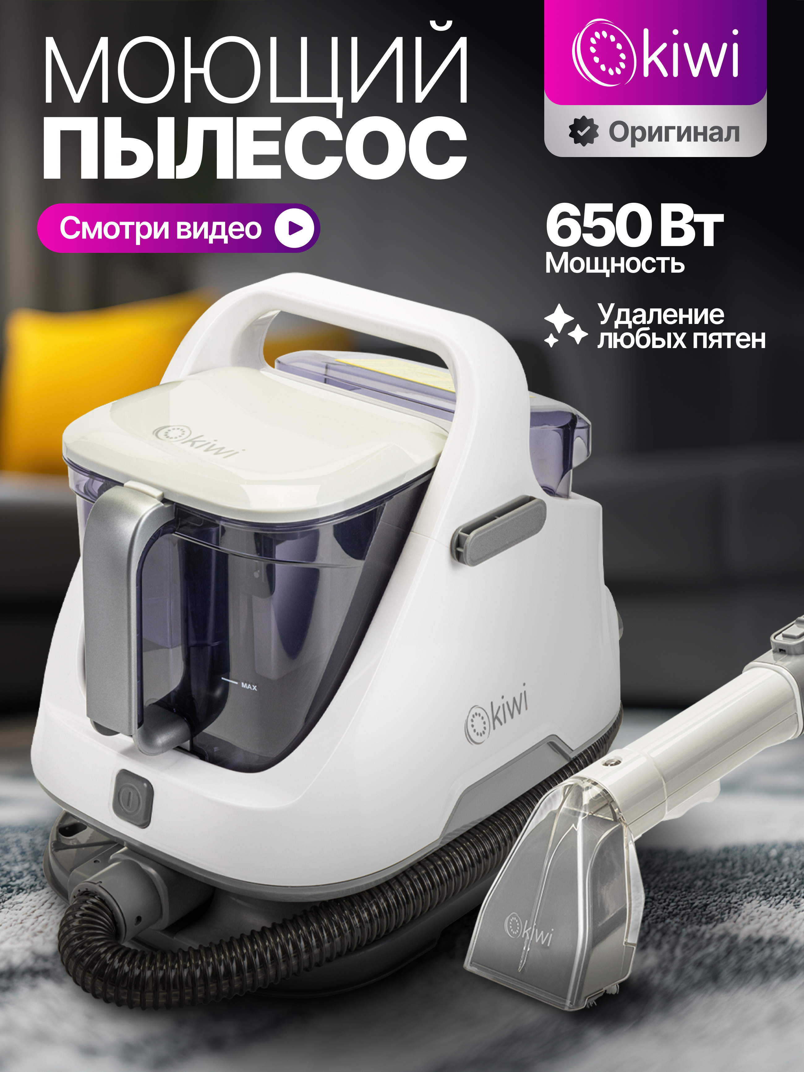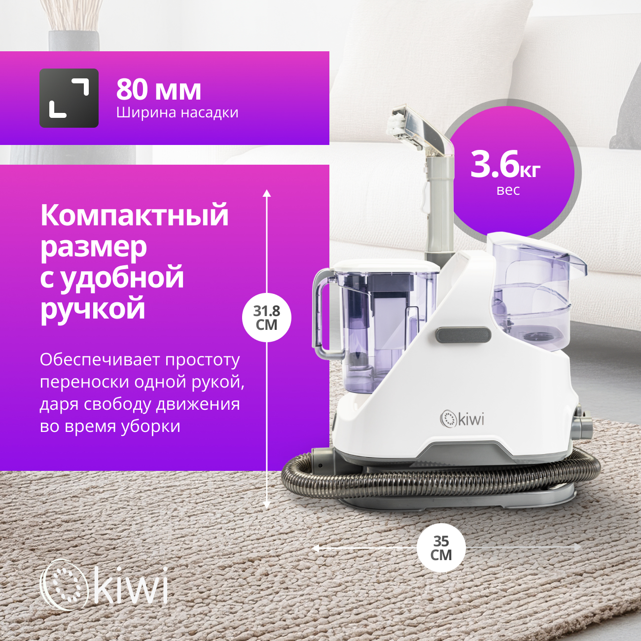 Моющий пылесос KIWI KCC-4320W - мощный инструмент для глубокой чистки ковров, мебели и автомобильных салонов. С мощностью всасывания 12 000 Па и двумя отдельными баками для чистой и грязной воды (1,4 л и 1,2 л соответственно), этот пылесос способен удалить даже самые стойкие пятна и загрязнения, оставляя поверхности чистыми и свежими. Благодаря компактному размеру и удобной ручке, KCC-4320W легко перемещать и хранить, что делает его идеальным выбором для домашнего использования. Надежная система клапанов и защита от переполнения предотвращают протечки, обеспечивая бесперебойную и эффективную работу устройства.