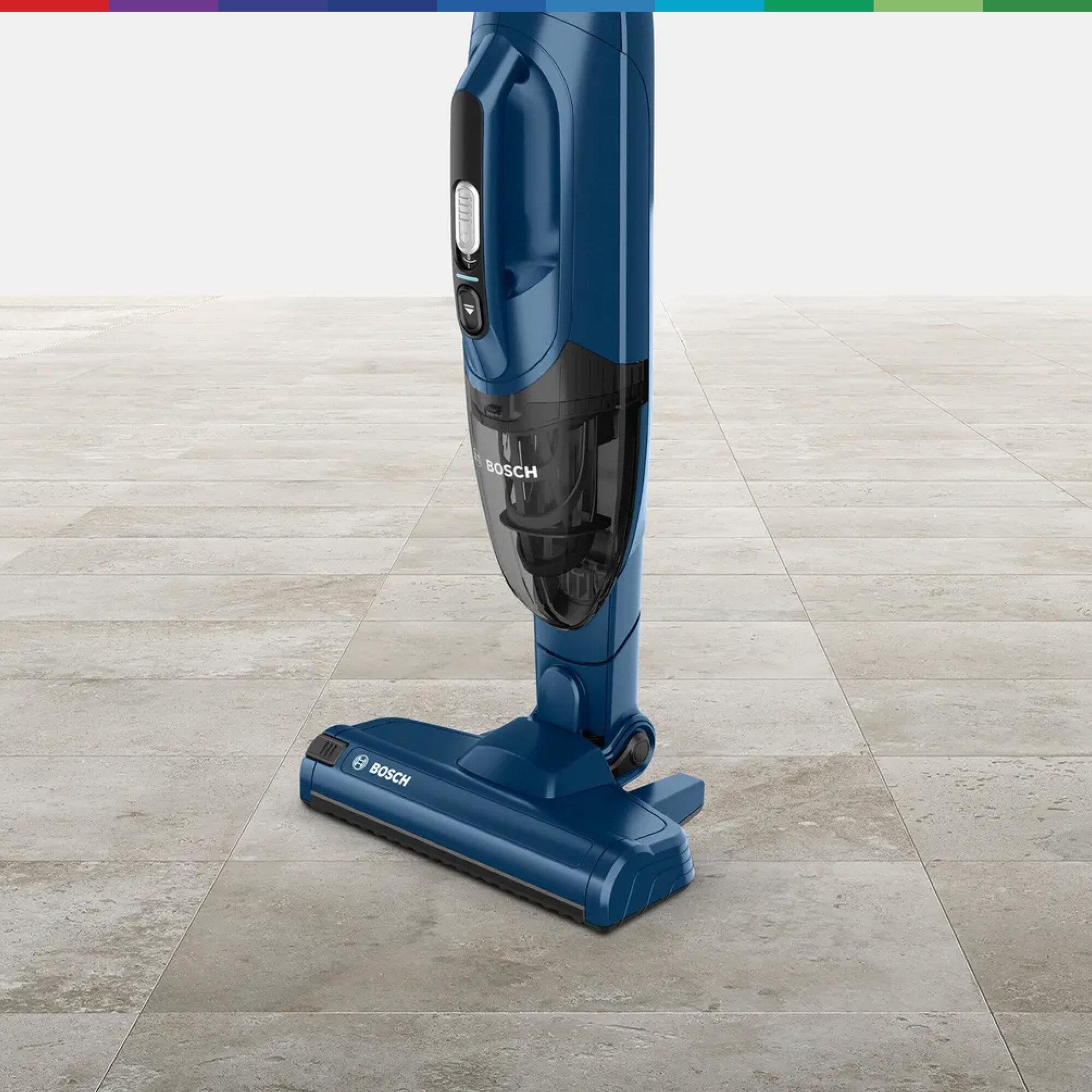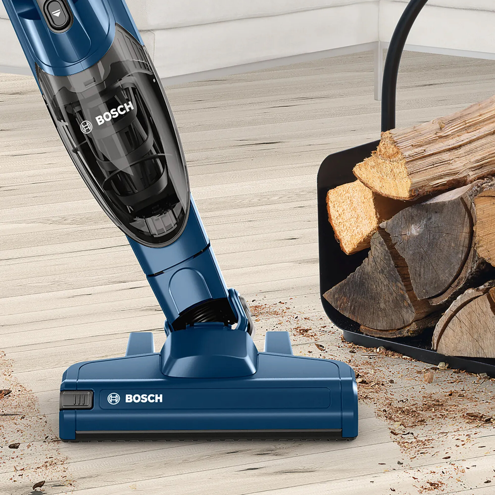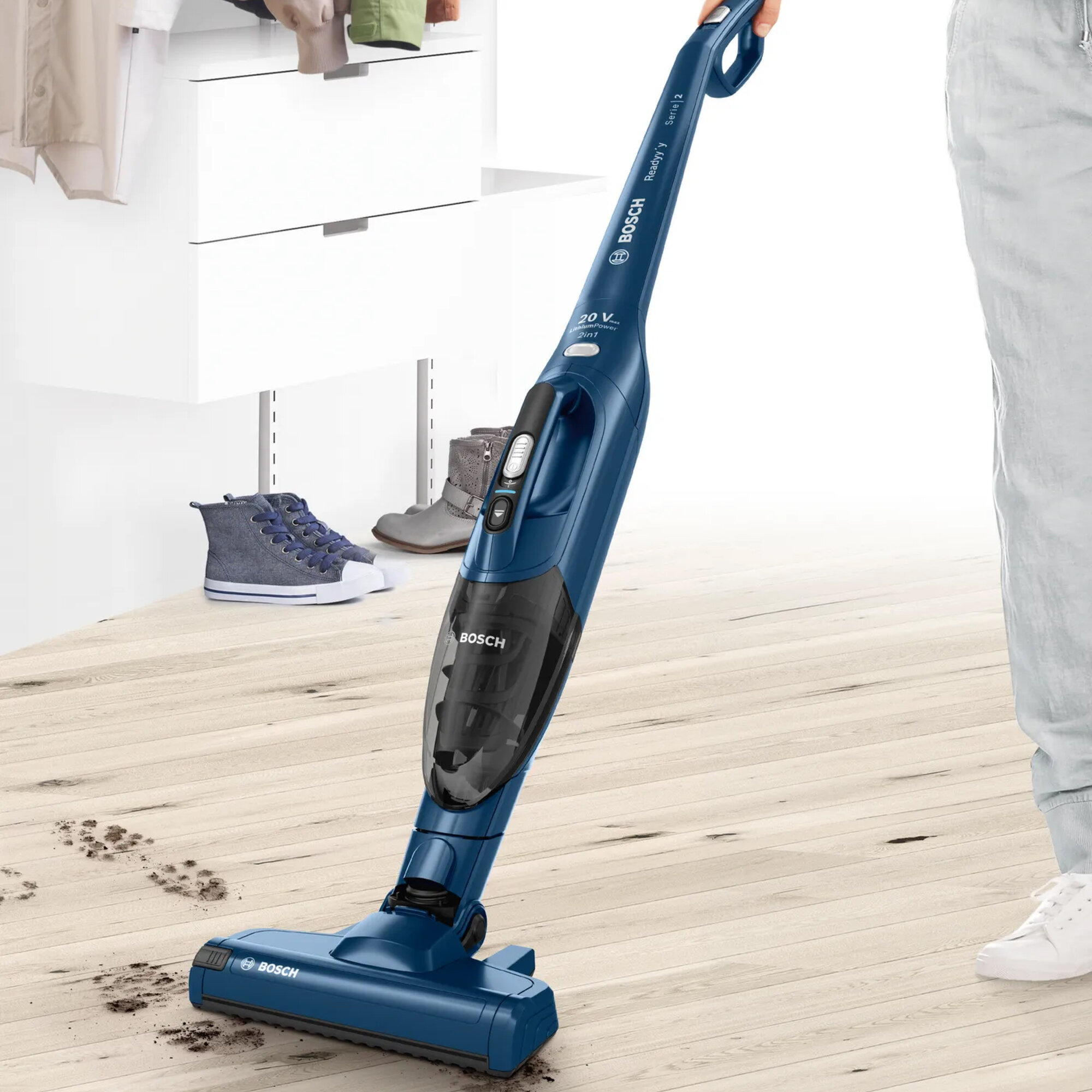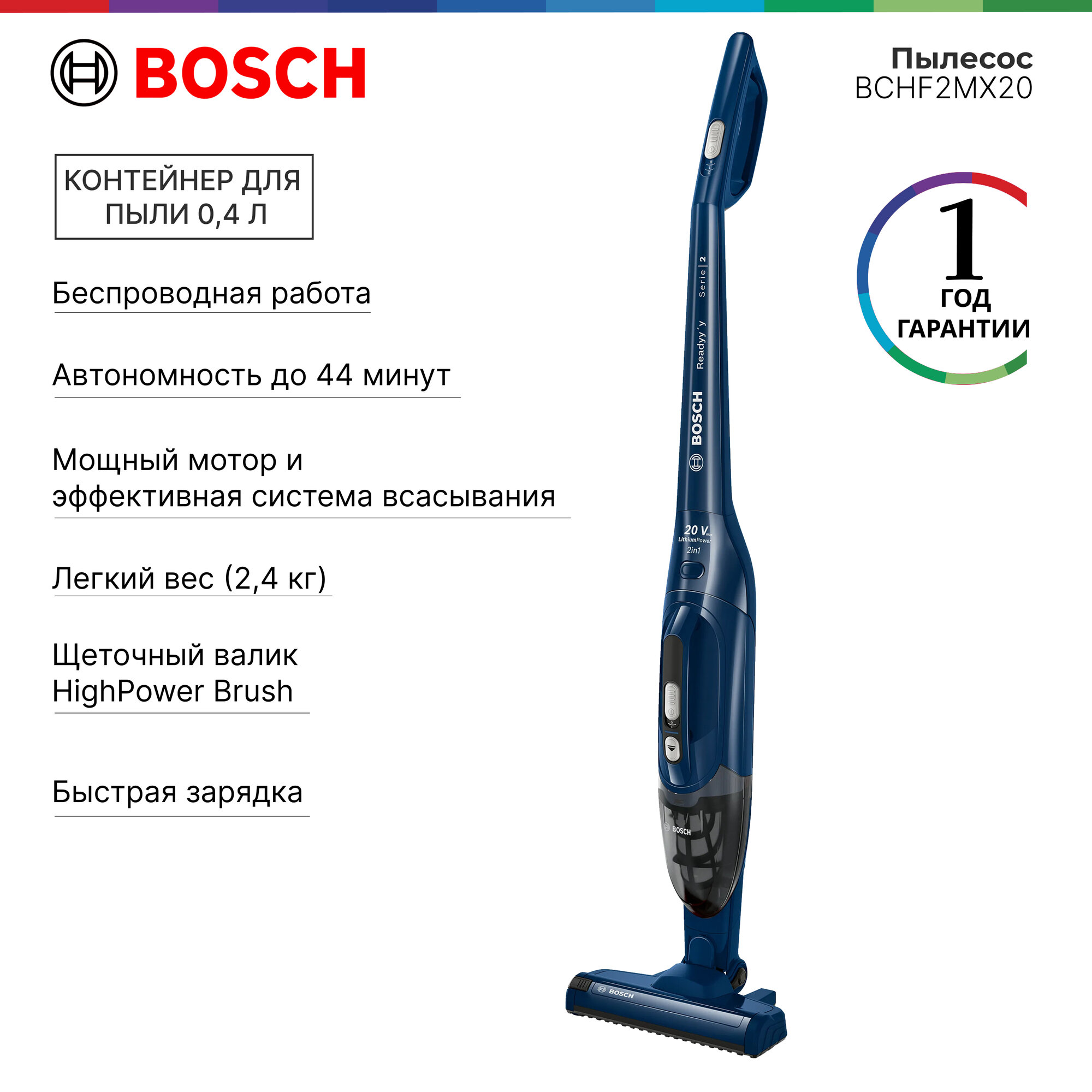 Вертикальный пылесос Bosch Bchf2Mx20 2 в 1 с возможностью вертикальной парковки и турбощеткой AllFloor Brush. Сам валик турбощётки легко вынимается одним нажатие, поэтому при необходимости его очень легко очистить от скопившейся пыли, волос или шерсти. Надежный аккумулятор Li-Ion гарантирует до 45 минут работы, а зарядка занимает около 5 часов. Подходит для различных типов напольных покрытий. Общий вес пылесоса Bosch Bchf2Mx20 2 в 1 составляет 2.5 кг. Информация с сайта производителя. Характеристики: Тип пылесоса: 2 в 1 (вертикальный + ручной) Тип уборки: сухая Тип пылесборника: контейнер Источник питания: аккумулятор Регулятор мощности: на рукоятке Объём пылесборника: 0.4 л Электрощетка в комплекте: да Телескопическая трубка: нет Вертикальная парковка: да Автоматическая смотка шнура: нет Тип аккумулятора в комплекте: Li-Ion Время работы от аккумулятора: 44 мин Пульт управления: нет Голосовое меню на русском языке: нет Программирование графика уборки: нет Дисплей: нет Уровень шума: 81 дБ Цвет: синий Подсветка зоны уборки: нет Габариты: 116х26.5х16.5 см Вес: 2.5 кг Страна производства: Китай Гарантия: 24 мес EAN: 4242005183296