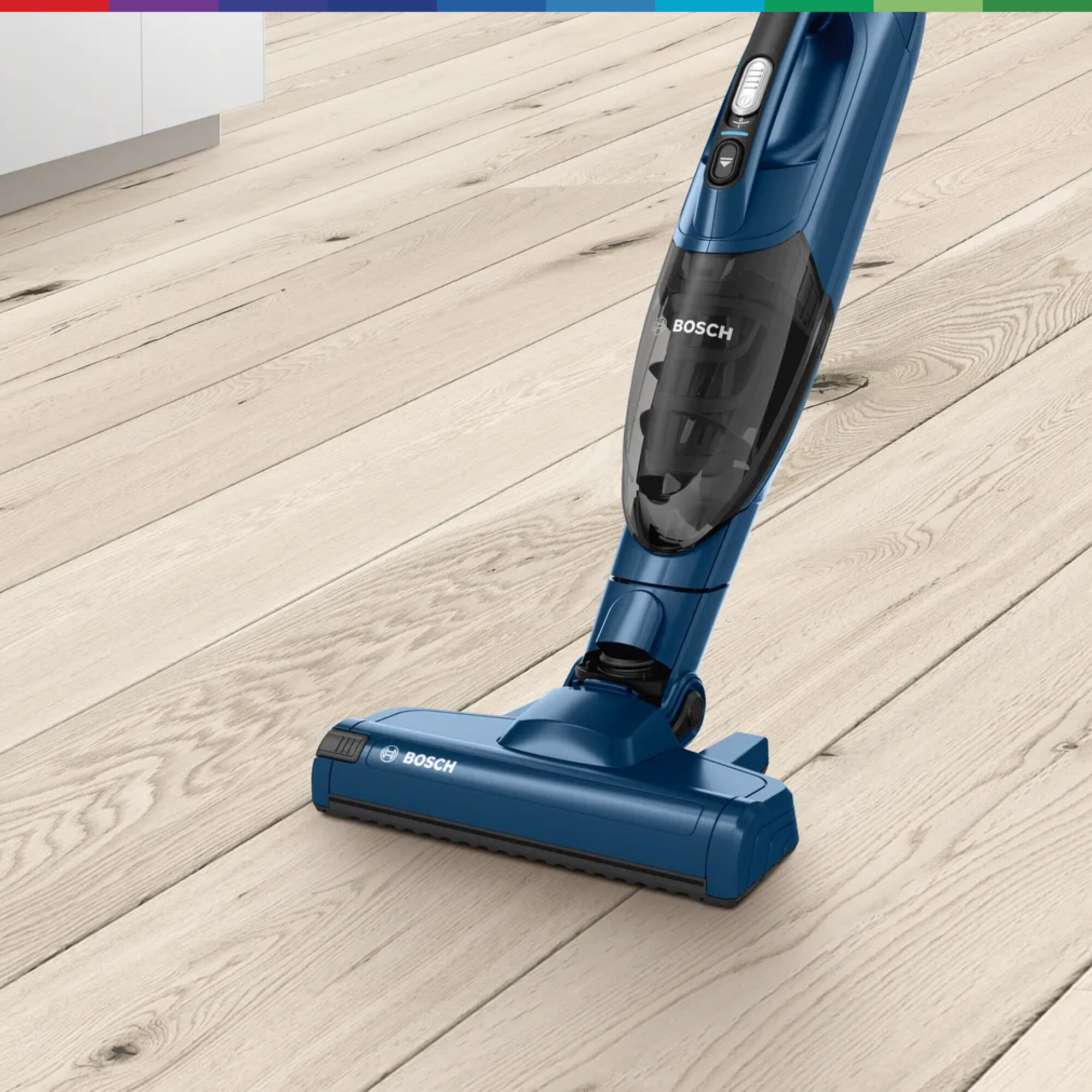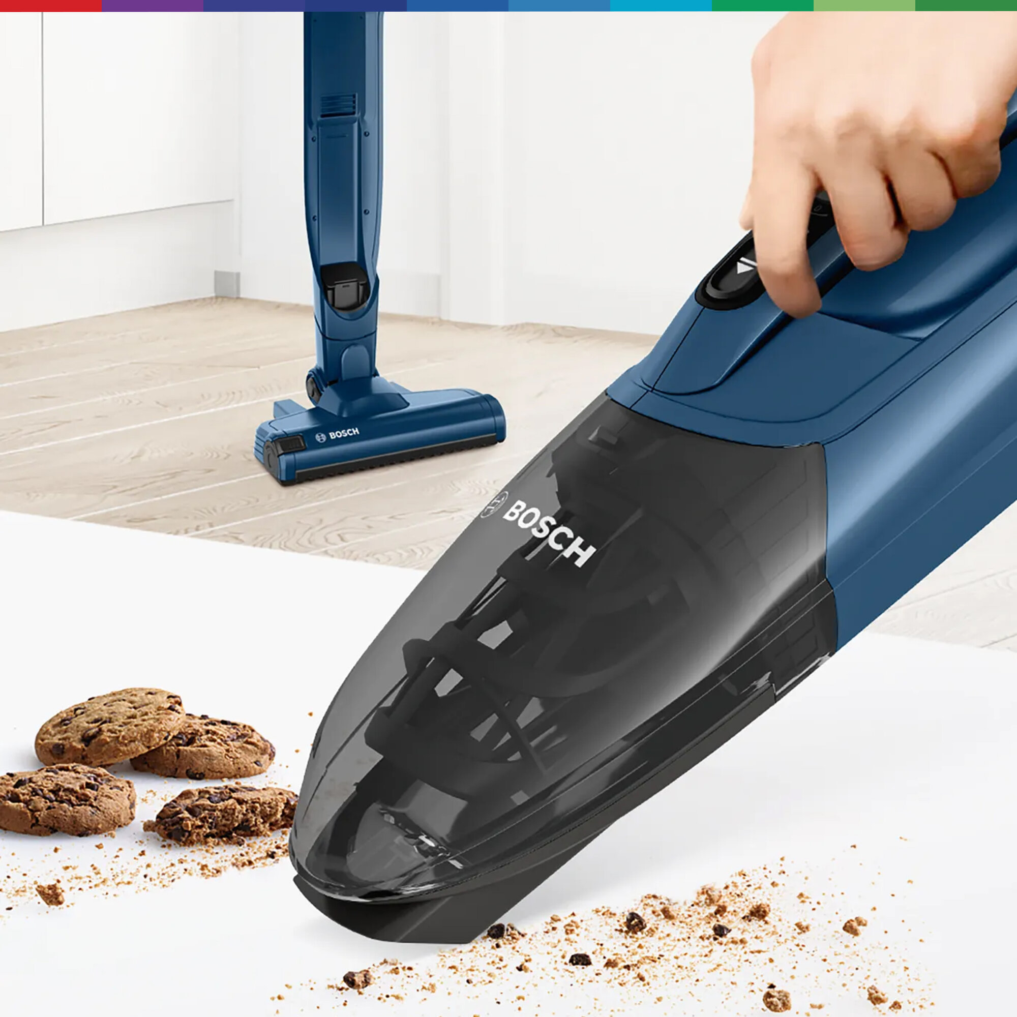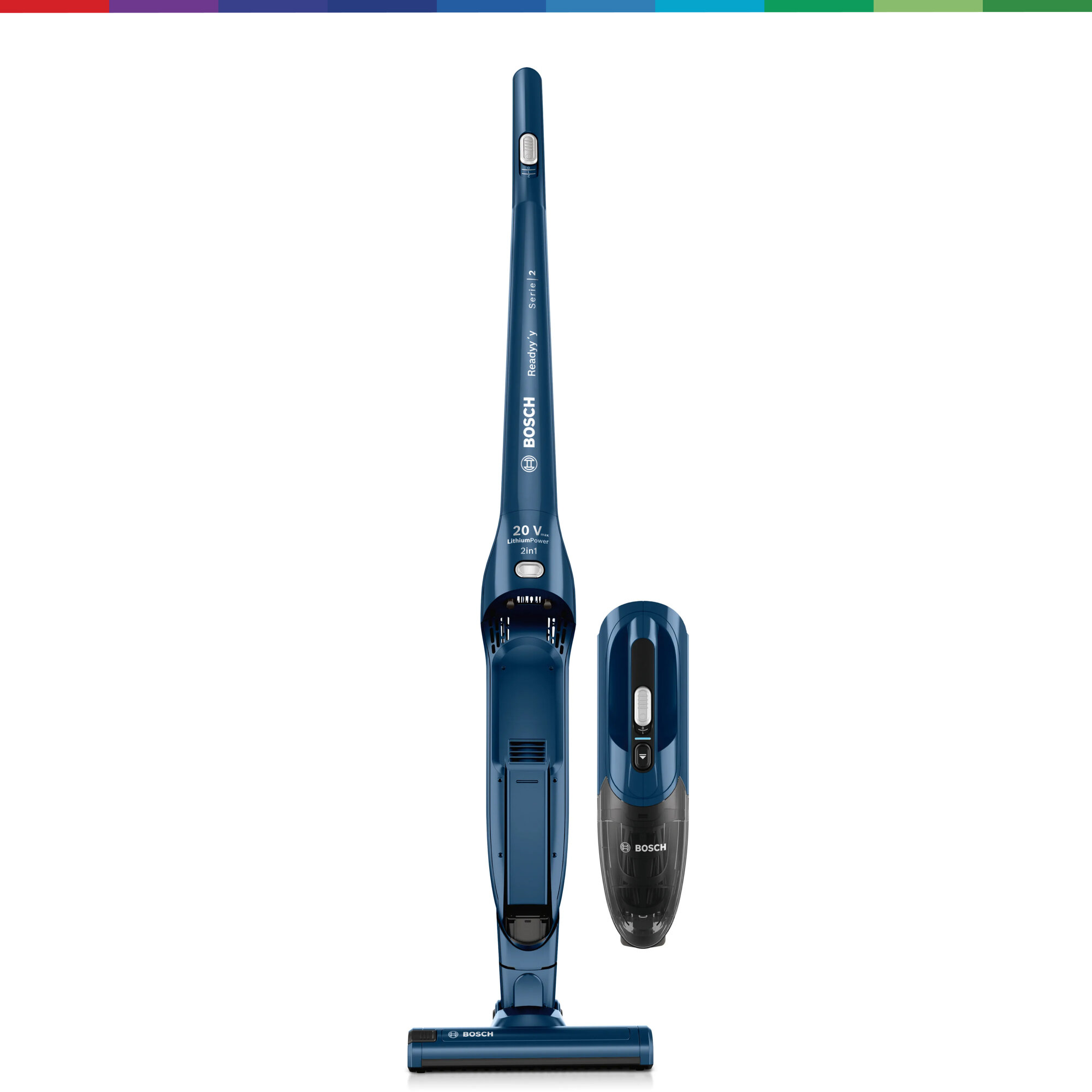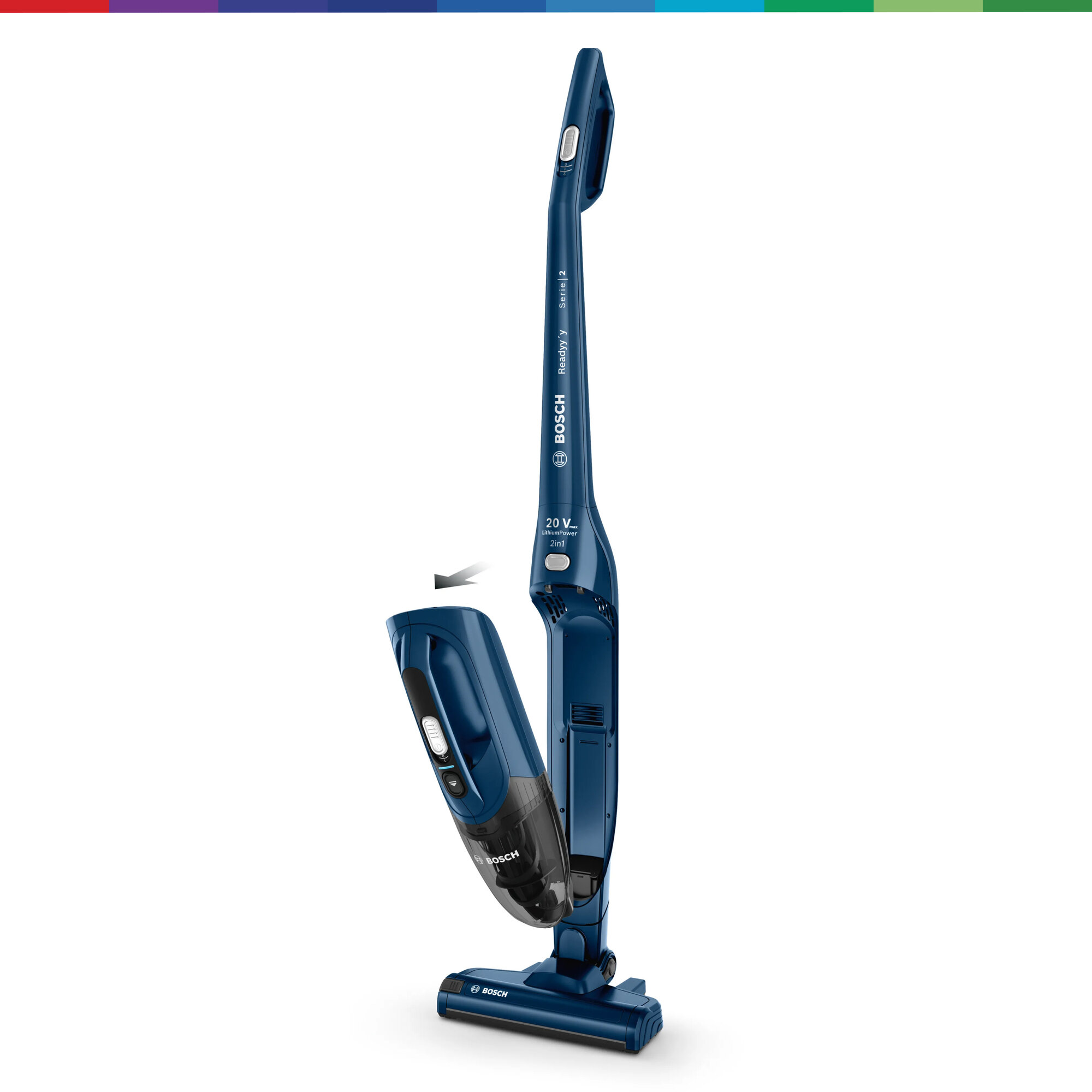 Вертикальный пылесос Bosch Bchf2Mx20 2 в 1 с возможностью вертикальной парковки и турбощеткой AllFloor Brush. Сам валик турбощётки легко вынимается одним нажатие, поэтому при необходимости его очень легко очистить от скопившейся пыли, волос или шерсти. Надежный аккумулятор Li-Ion гарантирует до 45 минут работы, а зарядка занимает около 5 часов. Подходит для различных типов напольных покрытий. Общий вес пылесоса Bosch Bchf2Mx20 2 в 1 составляет 2.5 кг. Информация с сайта производителя. Характеристики: Тип пылесоса: 2 в 1 (вертикальный + ручной) Тип уборки: сухая Тип пылесборника: контейнер Источник питания: аккумулятор Регулятор мощности: на рукоятке Объём пылесборника: 0.4 л Электрощетка в комплекте: да Телескопическая трубка: нет Вертикальная парковка: да Автоматическая смотка шнура: нет Тип аккумулятора в комплекте: Li-Ion Время работы от аккумулятора: 44 мин Пульт управления: нет Голосовое меню на русском языке: нет Программирование графика уборки: нет Дисплей: нет Уровень шума: 81 дБ Цвет: синий Подсветка зоны уборки: нет Габариты: 116х26.5х16.5 см Вес: 2.5 кг Страна производства: Китай Гарантия: 24 мес EAN: 4242005183296