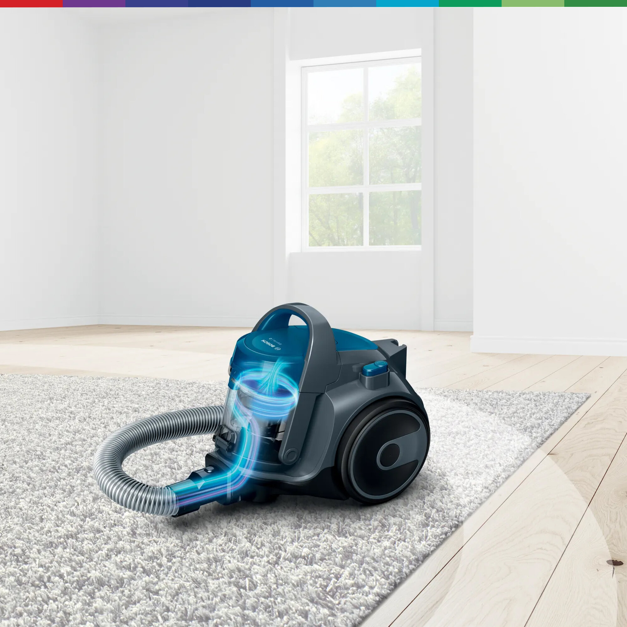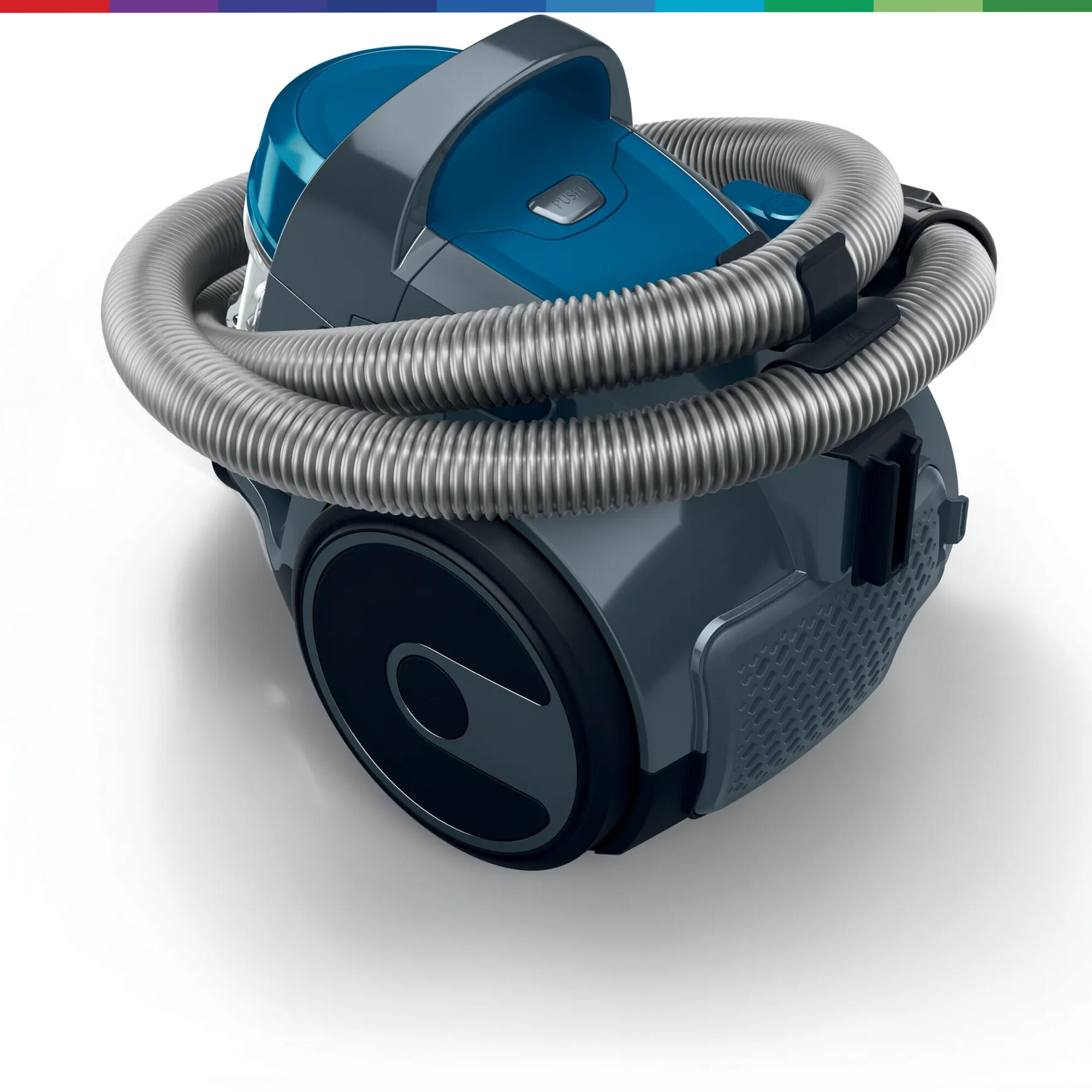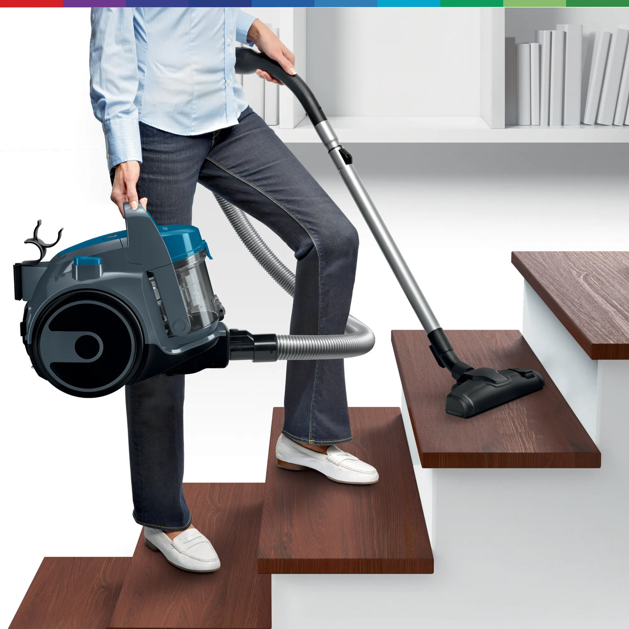 Функциональный и эргономичный дизайн обеспечивает удобство использования и хранения пылесоса. Уборка становится проще благодаря продуманному дизайну и большому объему контейнера для пыли. Мощный, компактный и быстрый. Без мешка. Никаких расходных материалов. Инновационный мотор HiSpin c аэродинамическими лопастями и оптимизированным воздушным потоком с минимальным энергопотреблением для максимального сбора пыли. Высокоэффективная система сепарации пыли. Гигиенический фильтр для чистого воздуха на выходе. Достигает класса очистки B. Компактный размер. Вес: 4.44 кг (без насадок). Лёгкая очистка контейнера. Эргономичная ручка. Объем контейнера для сбора пыли: L. Телескопическая труба. Насадка ковёр-пол. Насадка для мягкой мебели и щелевая насадка. Удобная парковка и хранение прибора. Автоматическая намотка кабеля. 2 больших колеса сзади и 1 ролик. Уровень шума: 78db(A).