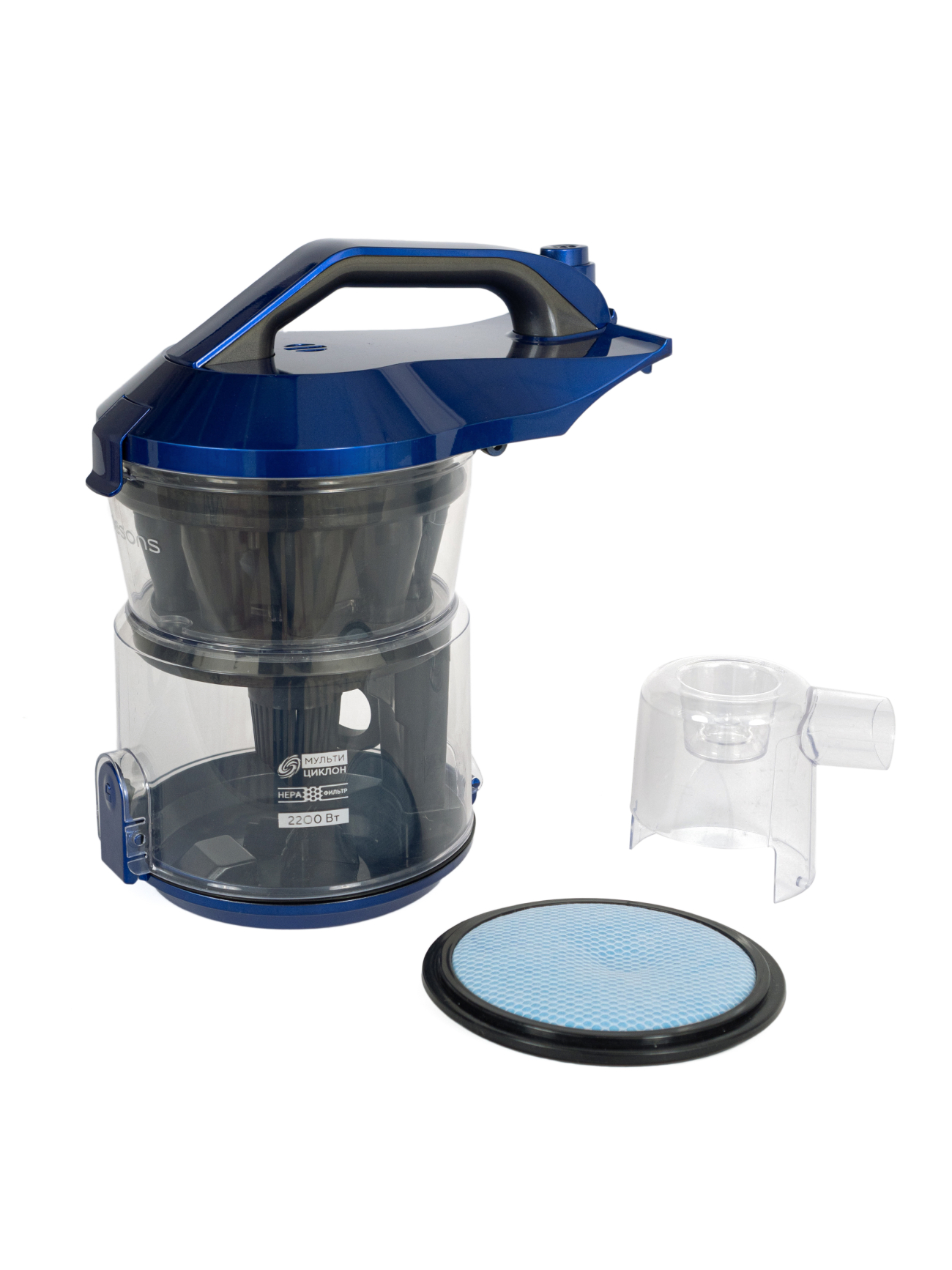Высота: 31,2 см; Глубина: 27,3 см; Работает от сети: да; Тип питания: от бытовой электросети; Ширина: 43 см; Потребляемая мощность: 2200 Вт; Размеры пылесоса (ШxГxВ): 43x27,3x31,2 см; Тип: бытовой пылесос; Вес: 4,9 кг; Мощность всасывания: 350 Вт; Насадки в комплекте: Универсальная, Щелевая насадка, Для мебели; Уборка: сухая; Тип уборки: сухая; Труба всасывания: телескопическая; Тип пылесборника: контейнер; Цвет корпуса: синий; Объем пылесборника: 2 л; Пылесборник: 2 л; Фильтр тонкой очистки: HEPA; Комплектация: Пылесос с установленными фильтрами и контейнером-пылесборником - 1 шт. Гибкий шланг - 1 шт. Металлическая телескопическая трубка - 1 шт. Универсальная двухпозиционная щетка «ковер-пол» - 1 шт. Щелевая насадка - 1 шт. Насадка для обивки ; Уровень шума: 78 дБ; Автоматическое сматывание шнура: есть; Длина сетевого шнура: 5.5 м; Дополнительные функции: Мультициклон, автоматическая смотка шнура