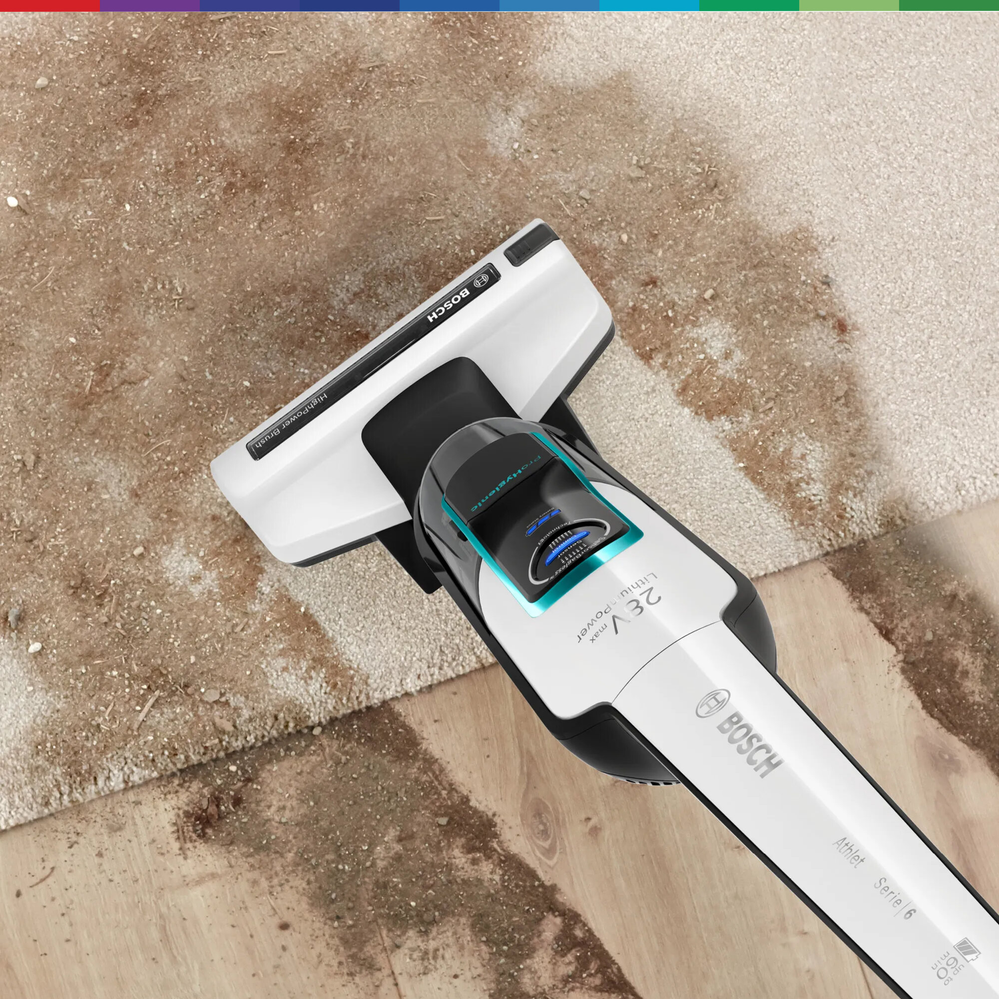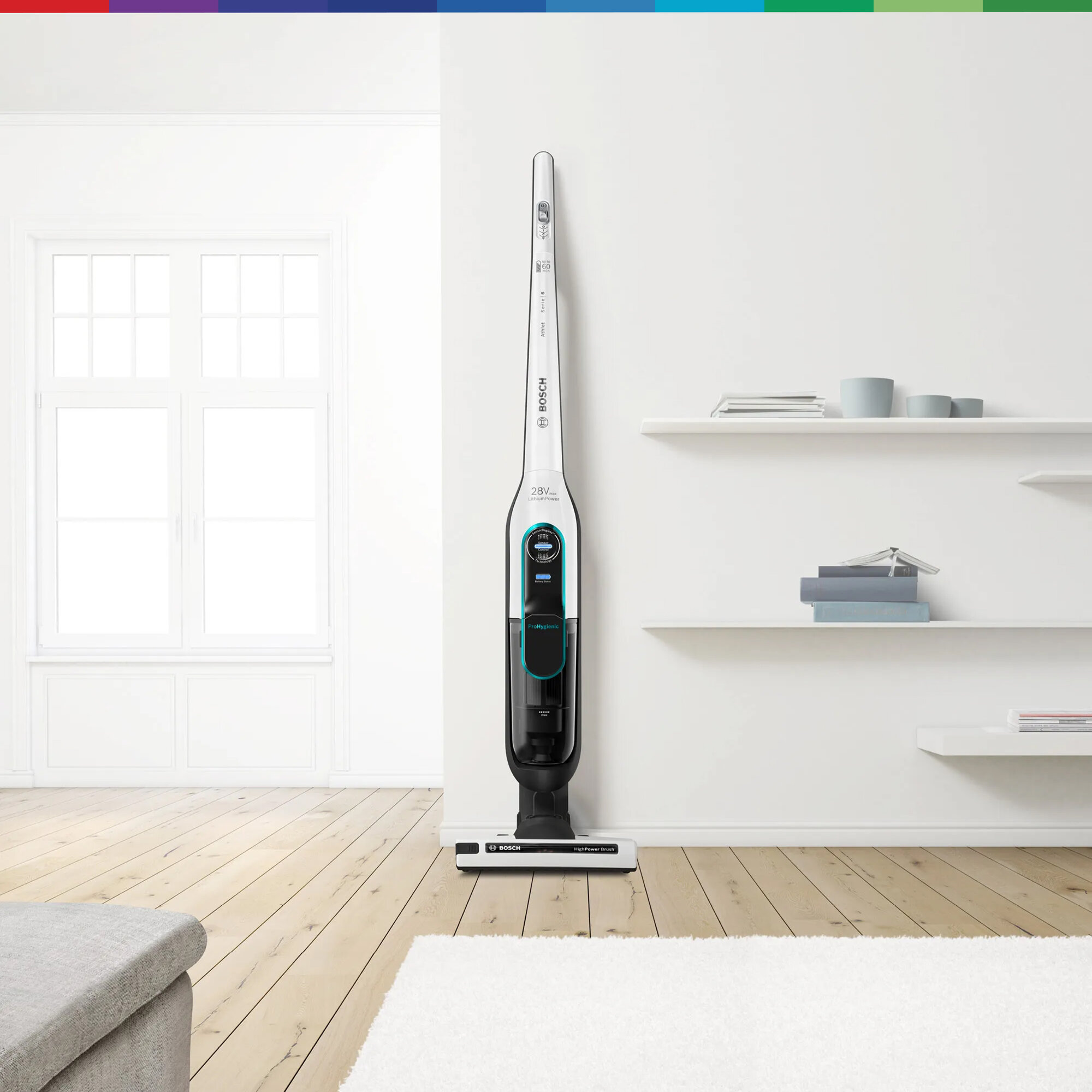 Пылесос Bosch BCH86HYG1 Serie 6 выполнен в стильном белом цвете, что делает его не только функциональным, но и эстетически приятным дополнением к интерьеру вашего дома.