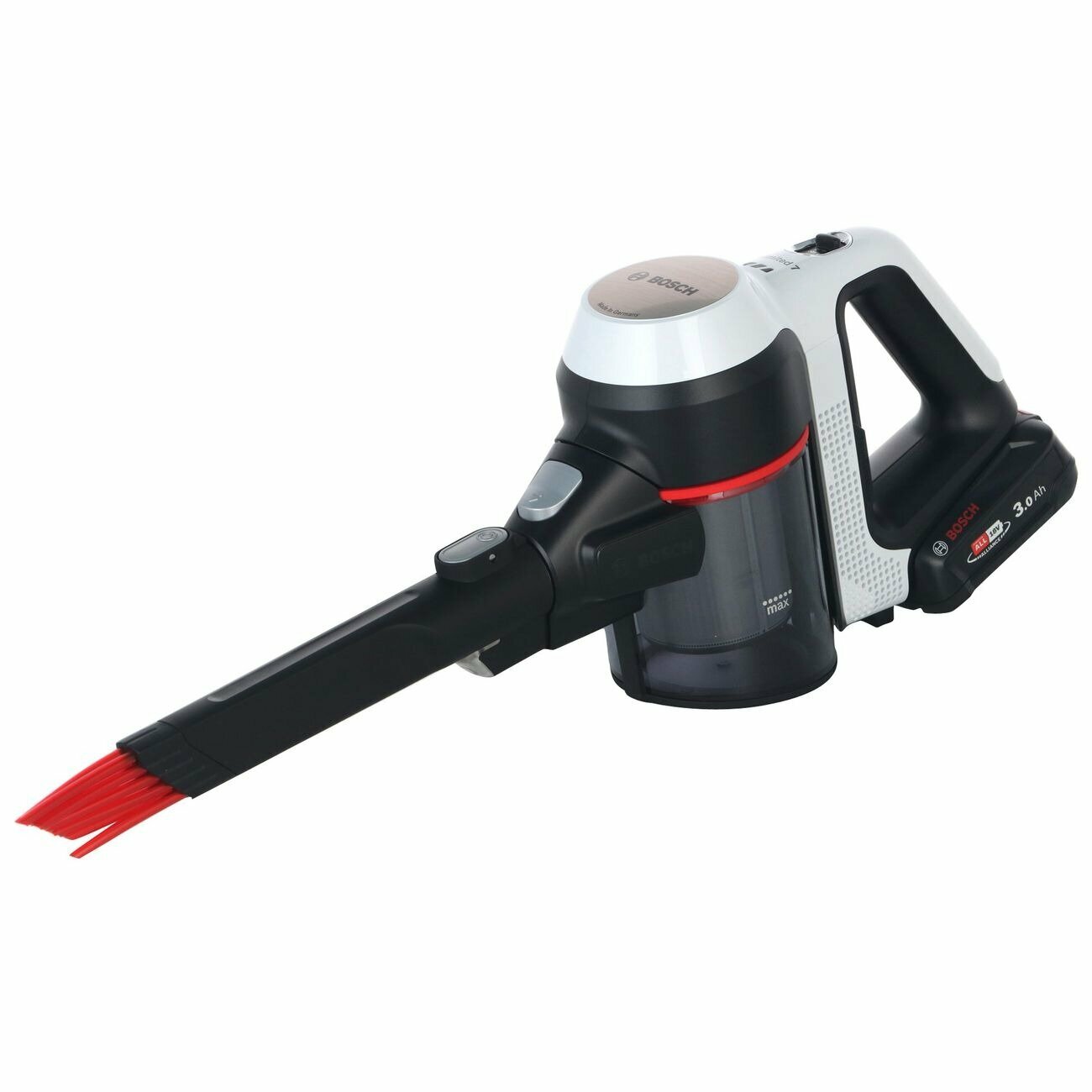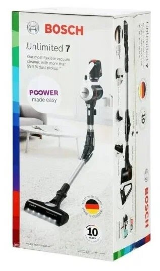 BOSCH Unlimited 7 BCS711XXL Наиболее важные функции Тип: Вертикальный Функции пылесоса: Работа в режиме Турбо, Работа в режиме Эко Тип резервуара: Контейнер Цвет: белый Вес [кг]: 2,9 кг Прочее: изогнутая на 90° трубка для легкой уборки под низкой мебелью, щетка со светодиодной подсветкой Время зарядки [ч]: 5 ч Индикатор заряда батареи: Да ЭКО / Турбо время работы: 40 мин / 10 мин Емкость мешка/бака [л]: 0,3 л Наслаждайтесь увеличенным на 33% временем автономной работы и рабочим диапазоном до 100 кв. м. С эффективным и долговечным аккумулятором Bosch Power for All емкостью 3,0 Ач даже самые сложные задачи по уборке станут легкими. Литий-ионный аккумулятор сменный и имеет защиту от перегрева, перегрузки, саморазряда и эффекта памяти. Кроме того, он обеспечивает на 33 % больше времени работы и высокую производительность. Это позволяет убирать до 100 квадратных метров на одном заряде аккумулятора⁸ — не делая перерывов в уборке и не беспокоясь о длительной подзарядке. Электрическая щетка со светодиодной подсветкой. Наслаждайтесь лучшими результатами уборки на всех типах полов и поверхностей, даже в самых темных местах. Благодаря мощной электрической щетке вы получите эффективность очистки более 99,9%. Вместе со встроенной светодиодной подсветкой вы увидите грязь и пыль даже в труднодоступных местах, например, за мебелью или в темных углах. Кроме того, вы собираете на 30 % больше пыли и грязи при уборке ковров. Это позволит вам чувствовать себя комфортно в чистом доме в кратчайшие сроки. Мощный и легкий двигатель производства Германии. Бесщеточный двигатель TurboSpin не оставляет никаких компромиссов в производительности. Он разработан и изготовлен компанией Bosch и прошел множество испытаний, чтобы обеспечить его долговечность. Более того, этот 3-фазный двигатель с цифровым управлением отличается высокой эффективностью, на 31 % легче и на 21 % быстрее, развивая скорость до 66 000 об/мин, что обеспечивает простоту эксплуатации и впечатляющую производительность уборки в любое время. Дополнительная информация и технические характеристики Эффективность Щетка AllFloor DynamicPower со светодиодной подсветкой: одна мощная щетка для интенсивной уборки всех типов полов. Мотор TurboSpin: сделано в Германии; с 10-летней гарантией. Увеличьте время работы: съемный аккумулятор позволяет увеличить время работы, когда это необходимо. В комплекте: 1 сменный аккумулятор Power For All Alliance. Power For All Alliance: съемный аккумулятор совместим со многими моделями Bosch (зеленая линия) и другими брендами. Время работы одной батареи 3,0 Ач: До 40 минут в экономичном режиме без электрической щетки До 30 минут в экономичном режиме с электрической щеткой До 15 минут в автоматическом режиме с электрической щеткой До 10 минут в режиме Turbo с электрической щеткой Интуитивно понятный 3-ступенчатый выбор режима для любых требований: Эко-режим: увеличенное время работы для более длительной уборки. Автоматический режим: лучшее решение с точки зрения времени работы и эффективности с автоматической регулировкой уровня мощности. Турбо-режим: максимальная эффективность для оптимальных результатов уборки. Автоматический режим: электрическая щетка регулирует уровень мощности в зависимости от типа очищаемой поверхности: ковер или твердый пол. Лучшее решение с точки зрения времени работы и производительности в зависимости от того, что необходимо для 