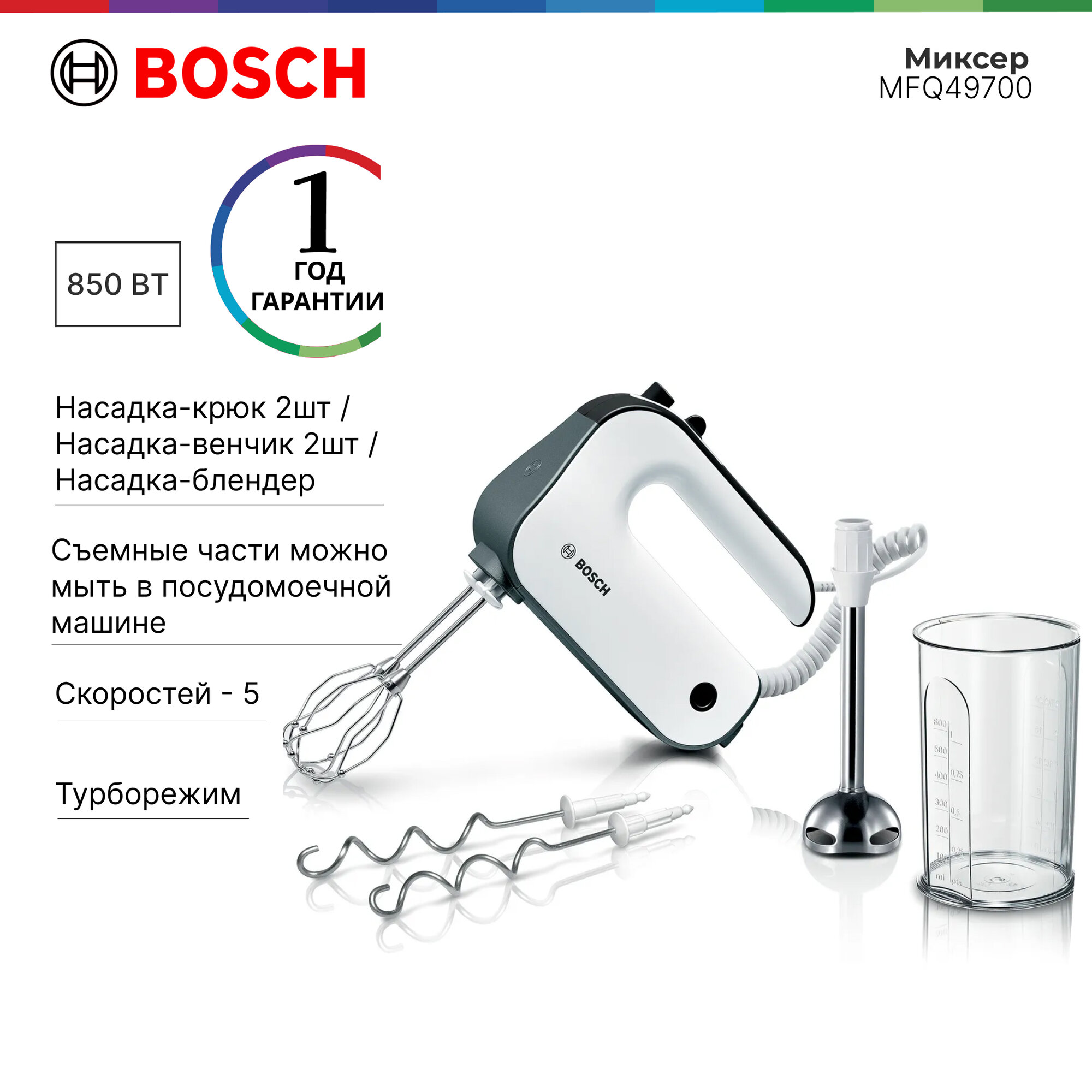 Ручной смеситель Bosch Styline MFQ49700, 5 уровней, 2 венчика из нержавеющей стали и крюка для теста, спиральный кабель, стержень для смешивания из нержавеющей стали, 850 Вт, белый/темно-серебристый