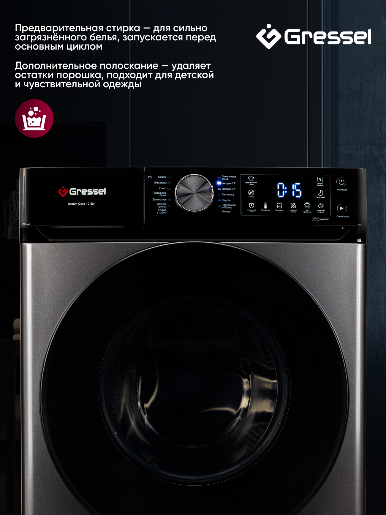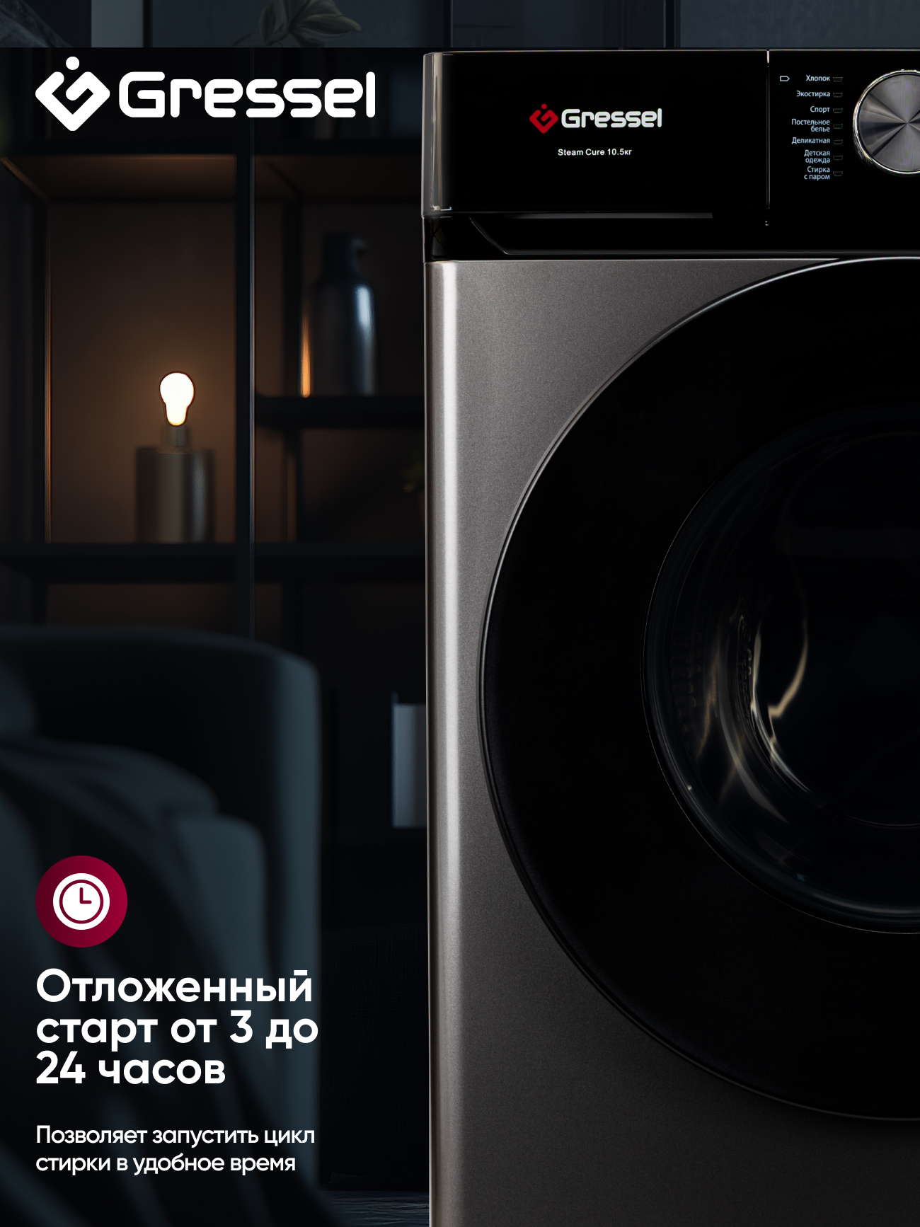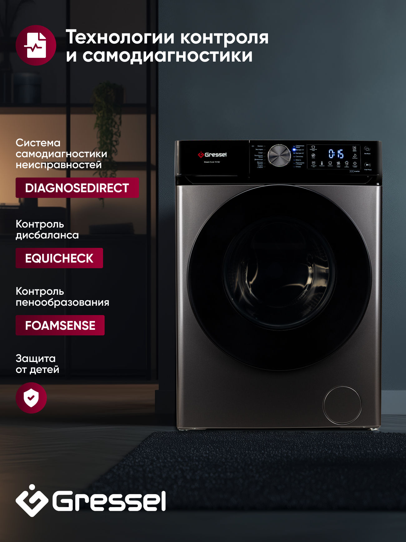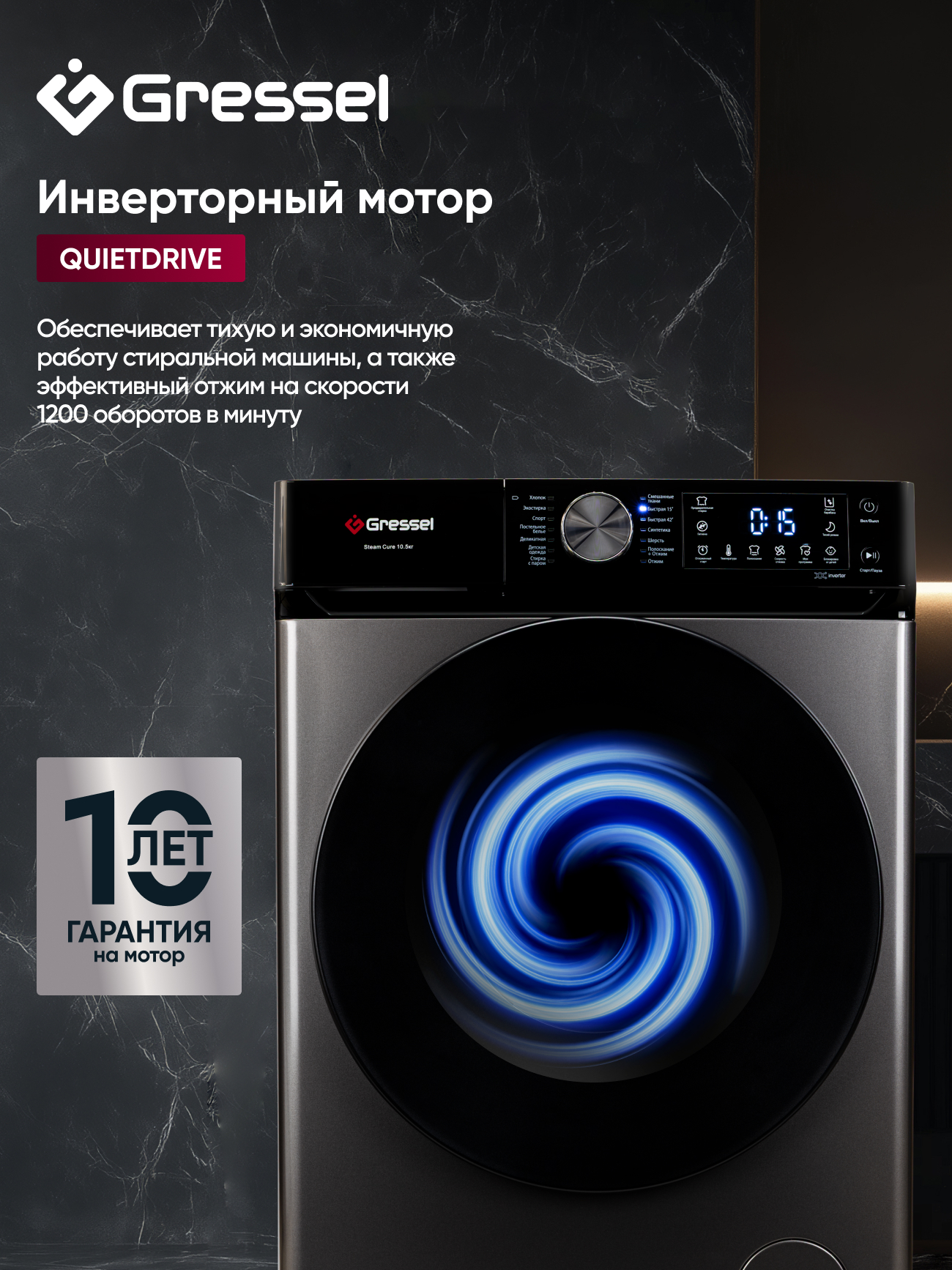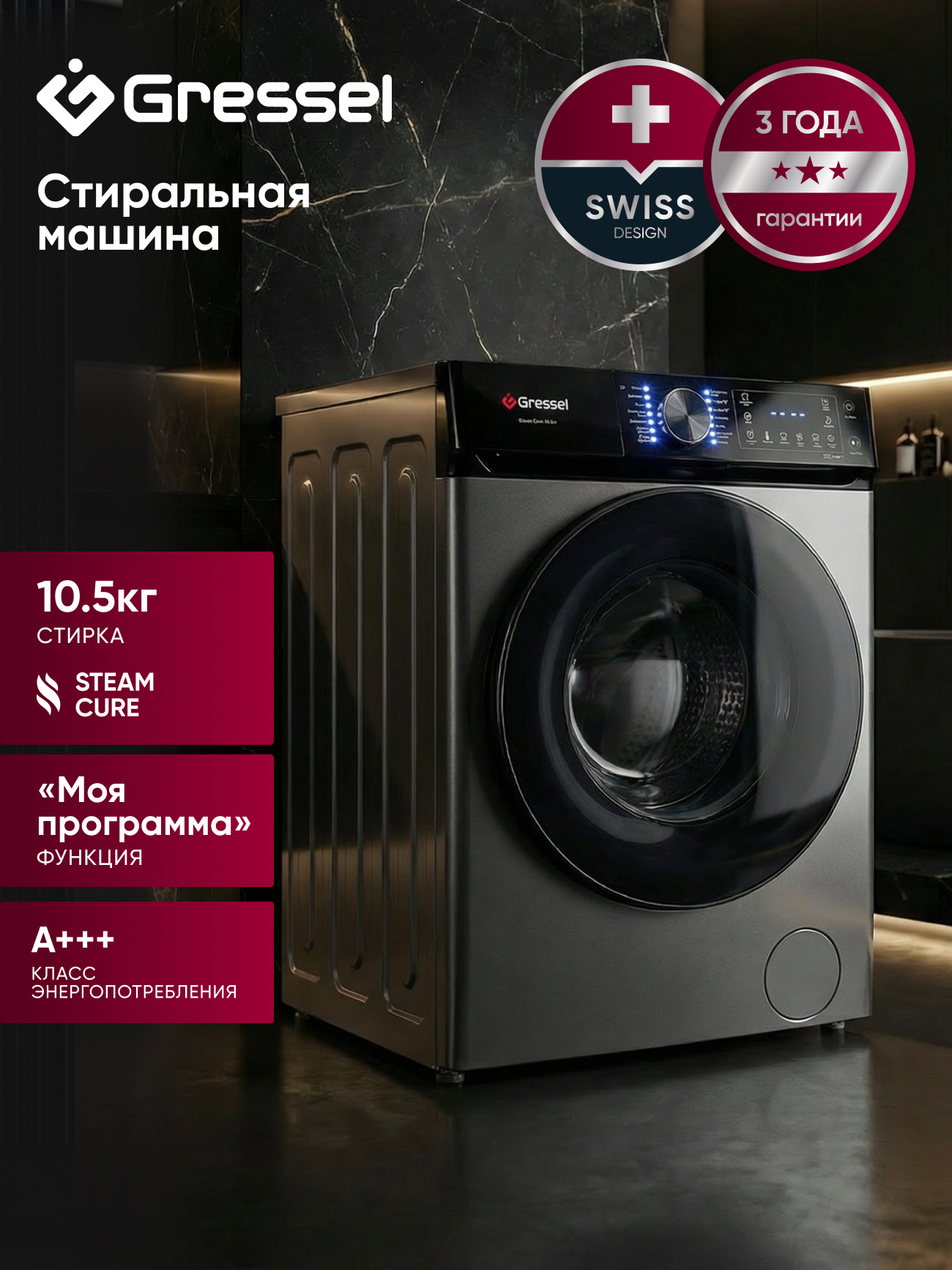 Стиральная машина 10,5кг Gressel UBC310, 14 программ, функция моя программа, класс энергопотребления А+++, отложенный старт, цвет серый