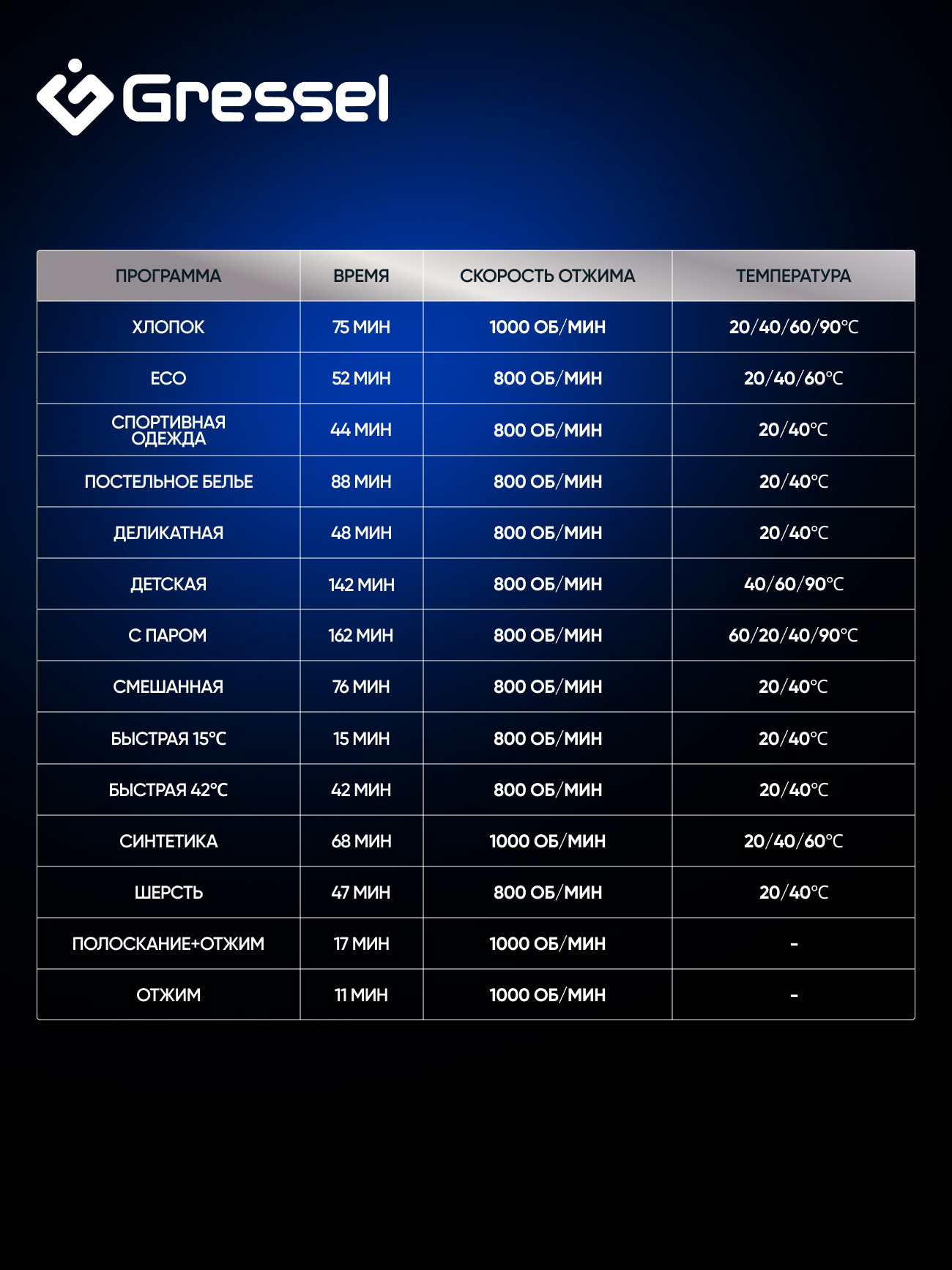 Хлопок; Экостирка; Спорт; Постельное белье; Деликатная; Десткая одежда; Стирка с паром; Смешанные ткани; Быстрая 15; Быстрая 42; Синтетика; Шерсть; Полоскание+Отжим; Отжим
