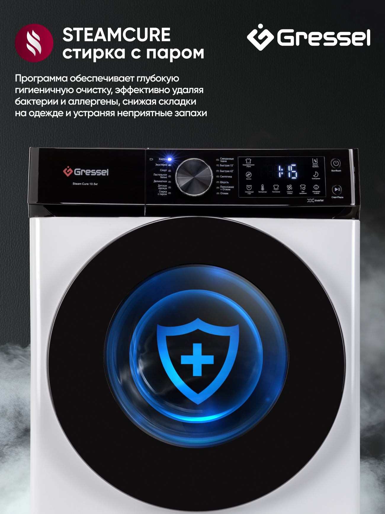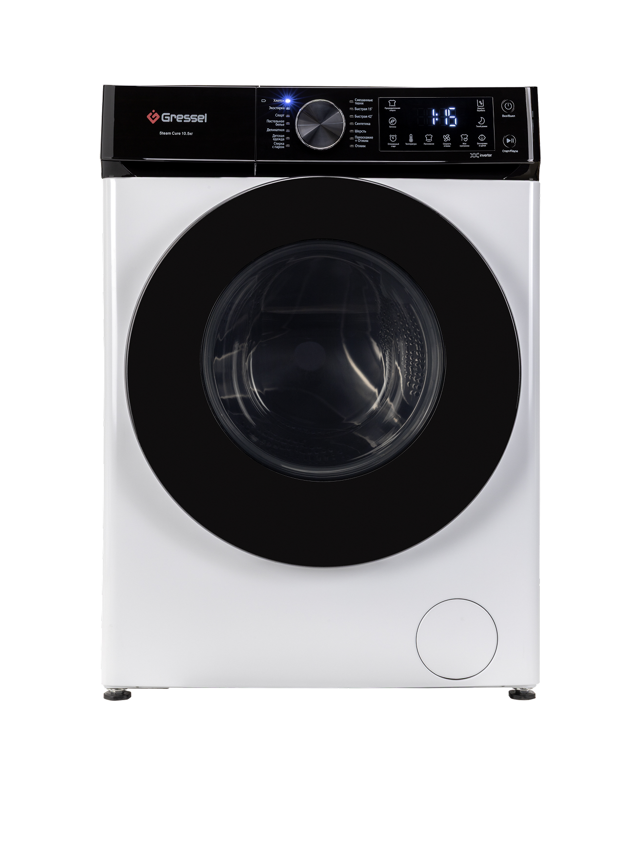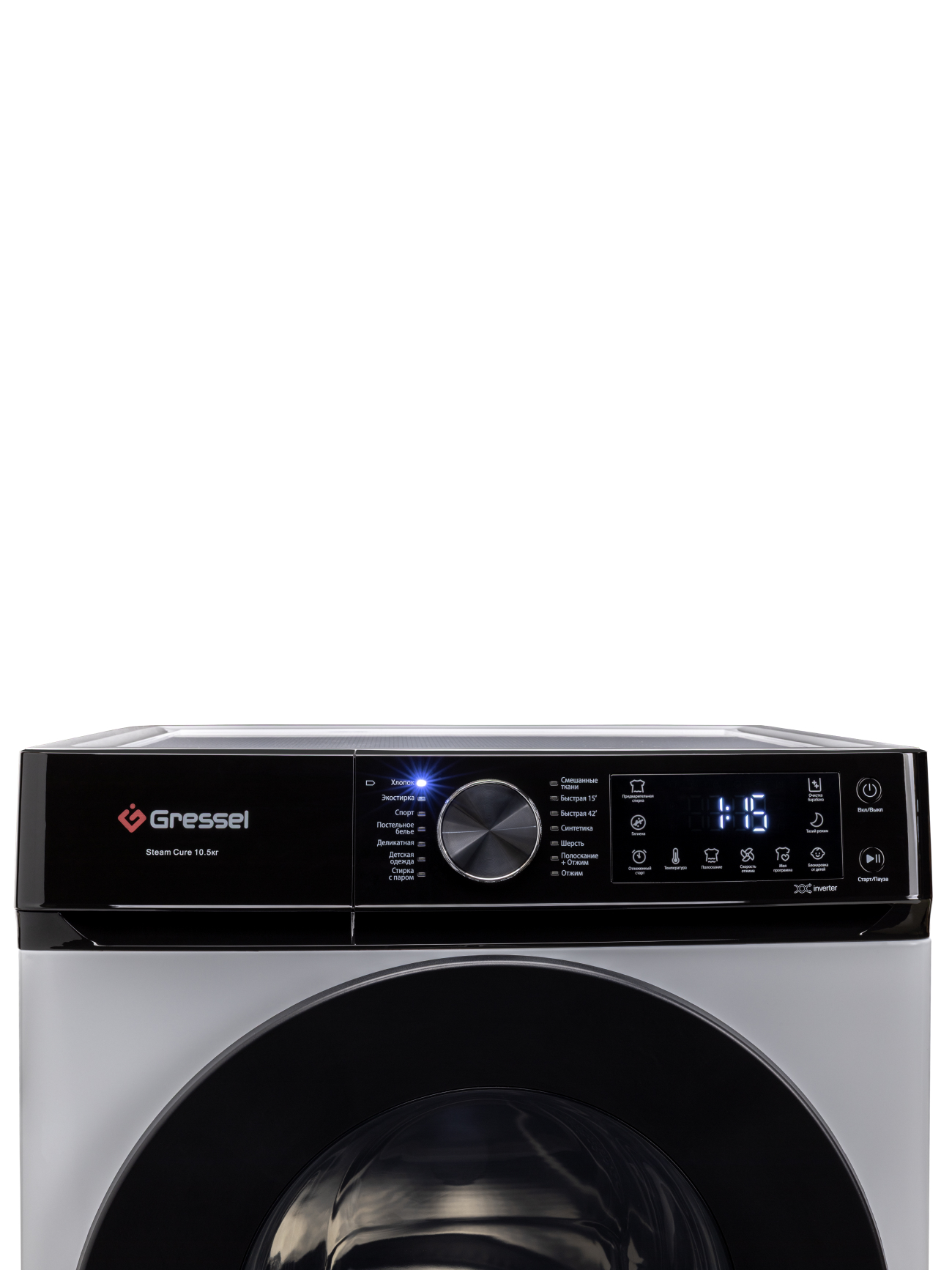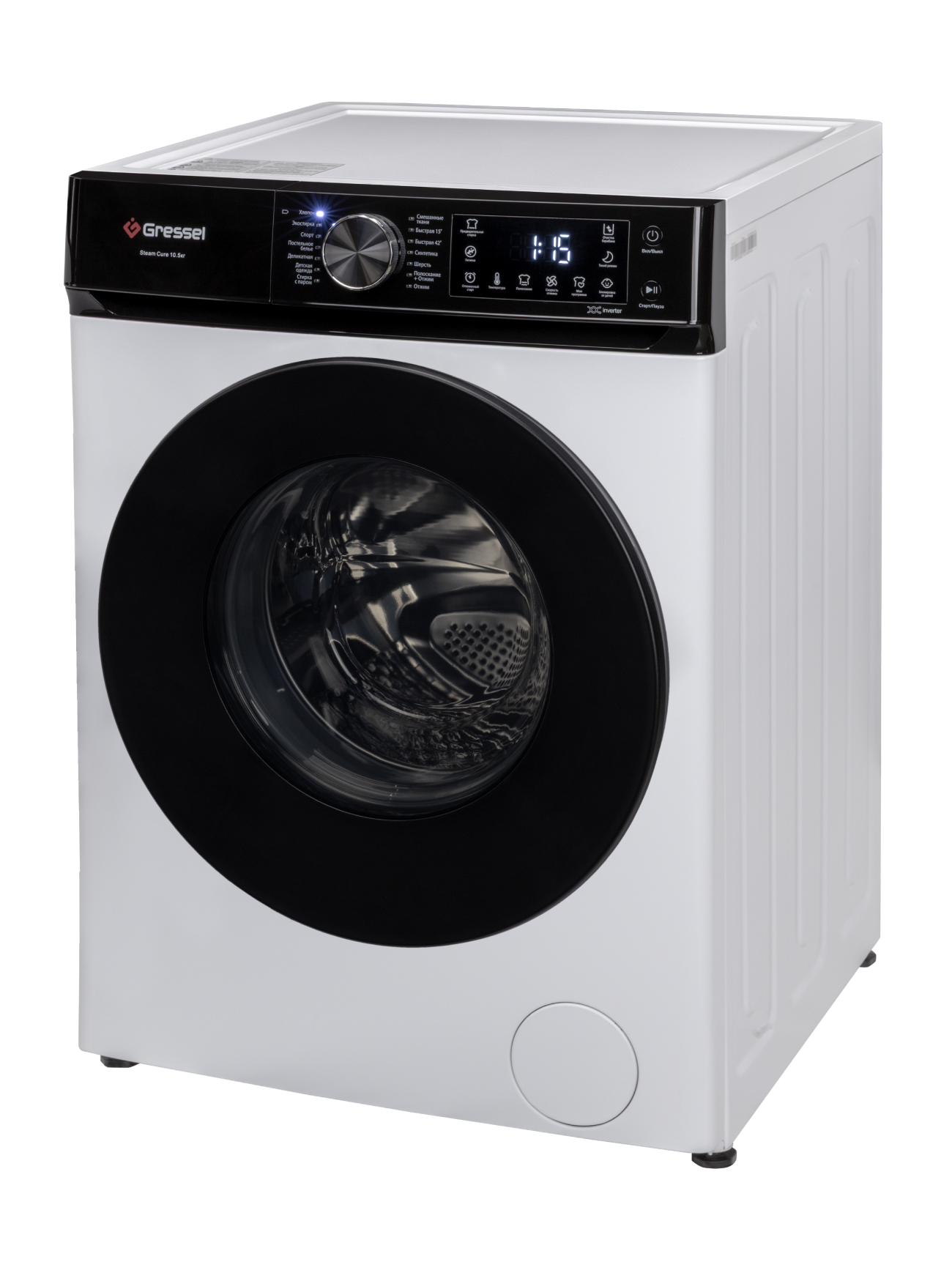 Хлопок; Экостирка; Спорт; Постельное белье; Деликатная; Десткая одежда; Стирка с паром; Смешанные ткани; Быстрая 15; Быстрая 42; Синтетика; Шерсть; Полоскание+Отжим; Отжим