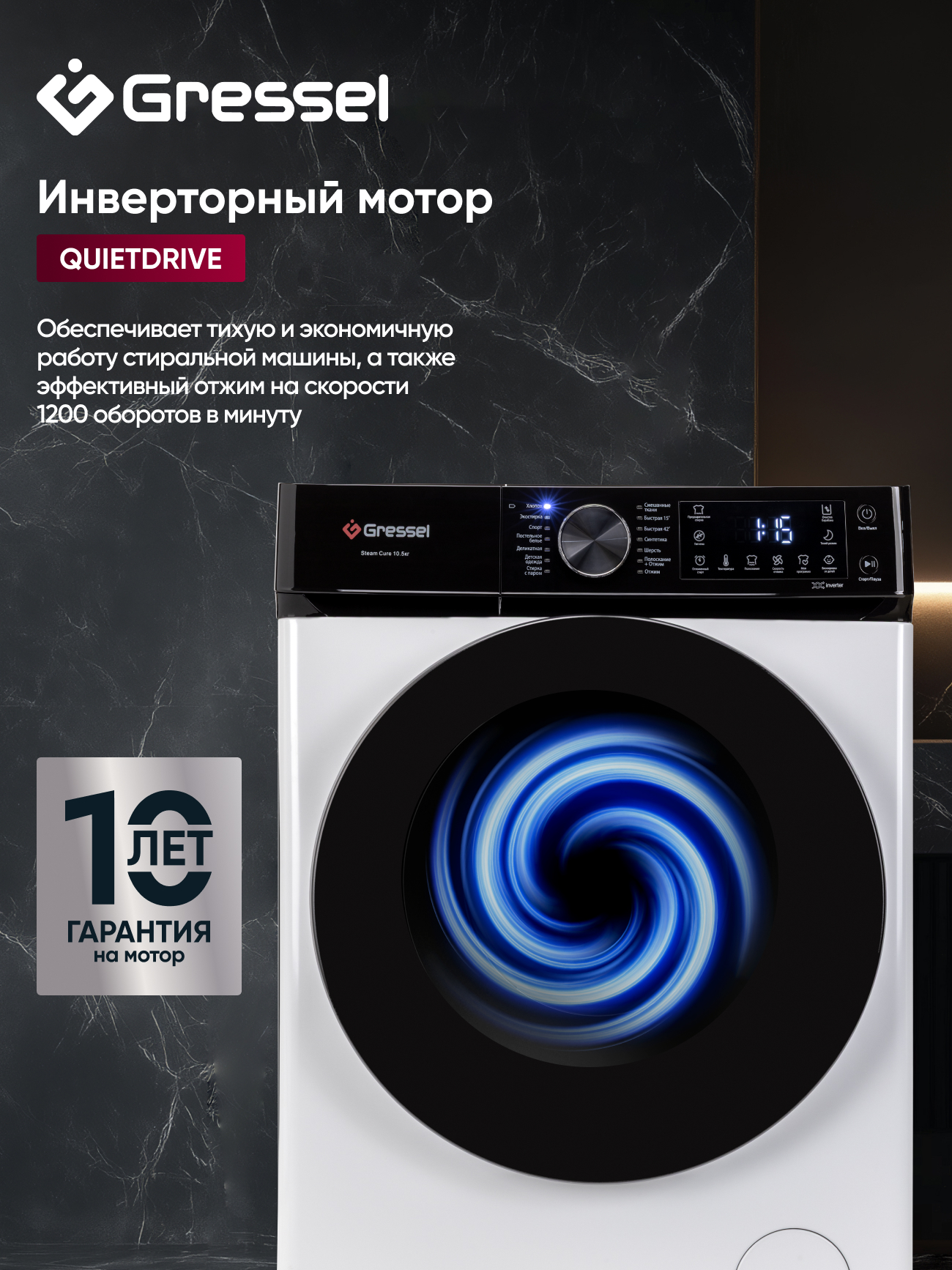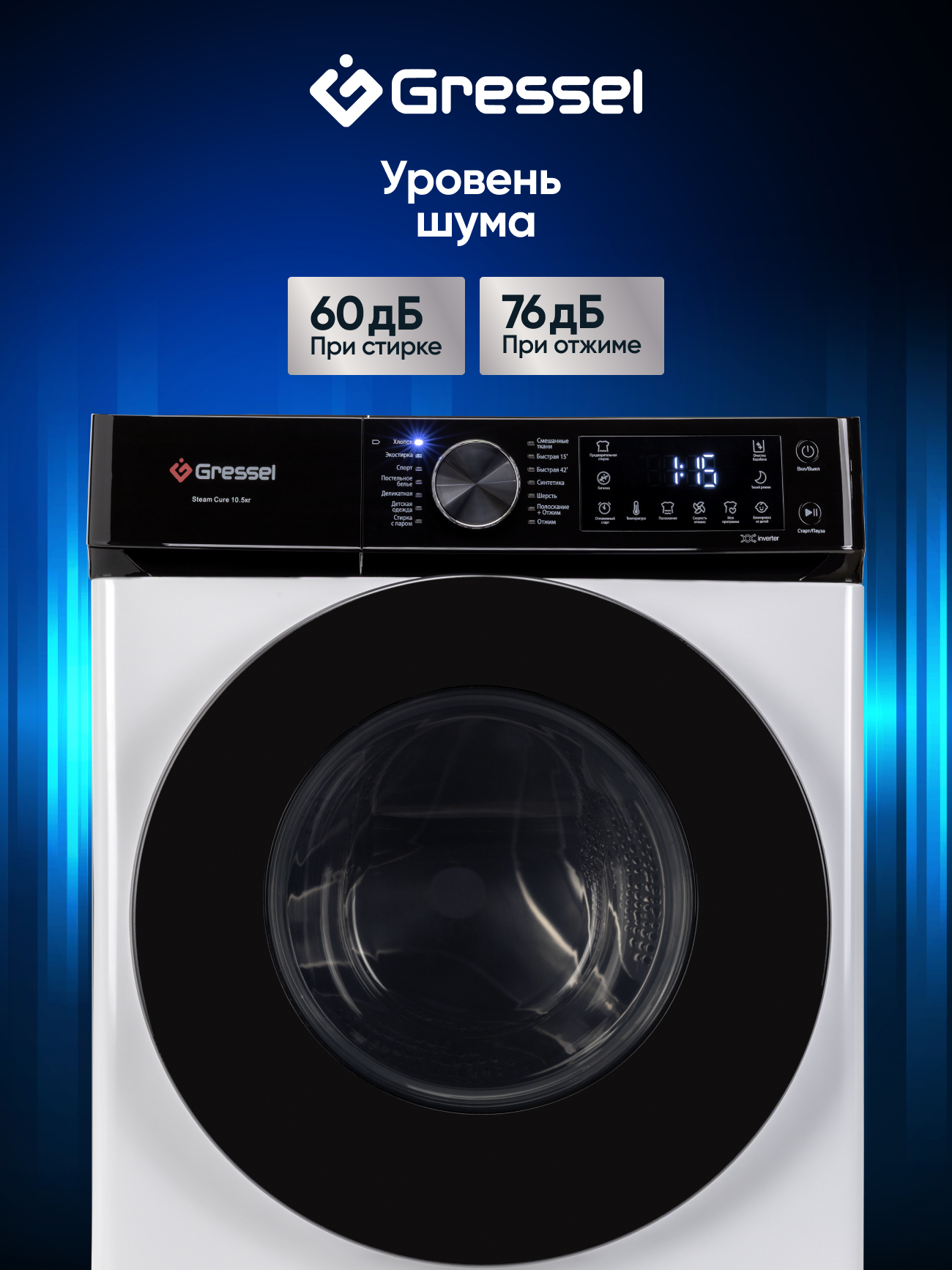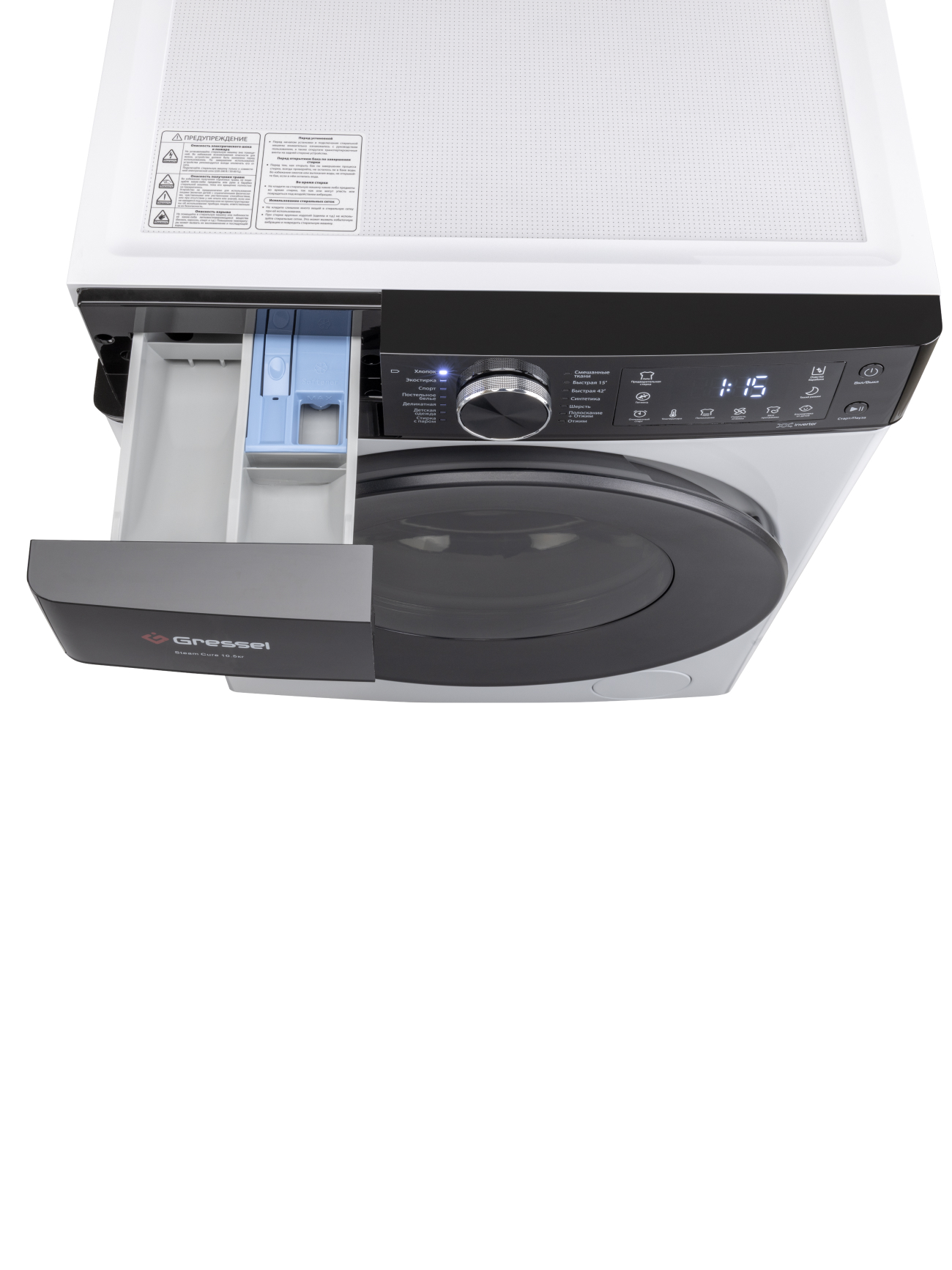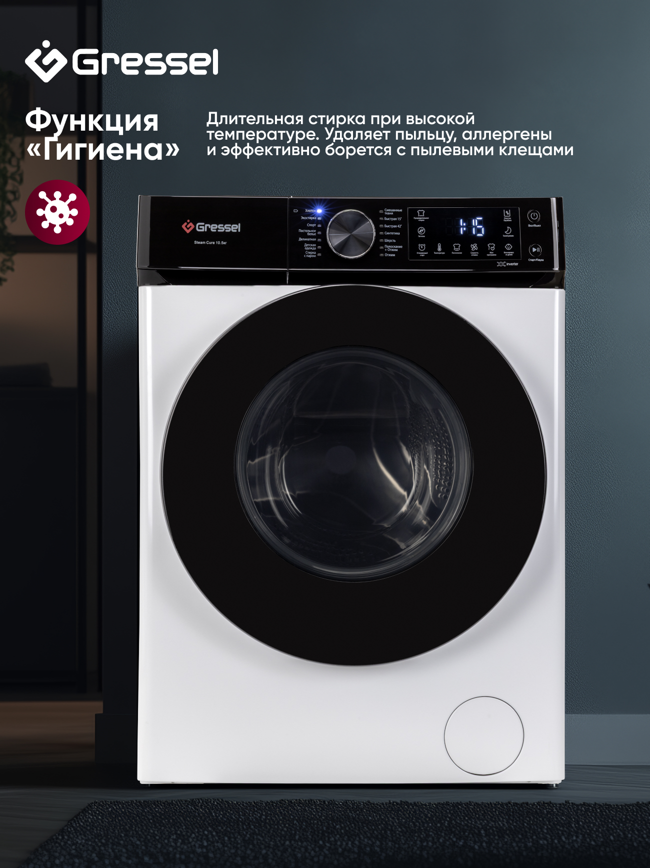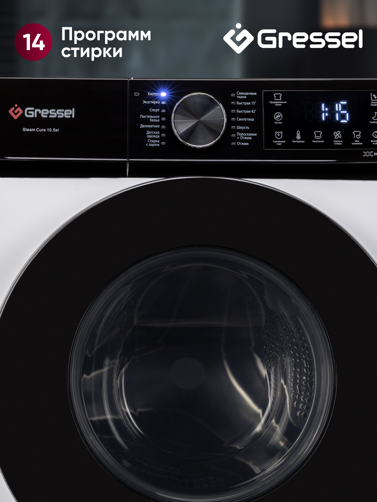 Хлопок; Экостирка; Спорт; Постельное белье; Деликатная; Десткая одежда; Стирка с паром; Смешанные ткани; Быстрая 15; Быстрая 42; Синтетика; Шерсть; Полоскание+Отжим; Отжим