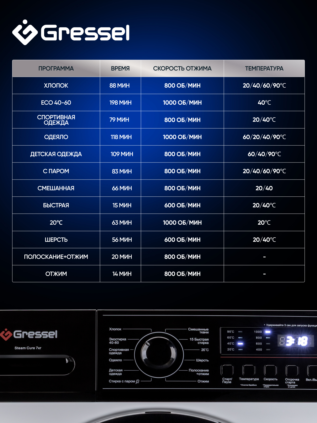 Хлопок; Экостирка 40-60; Спортивная одежда; Одеяло; Детская одежда; Стирка с паром; Отжим; Полоскание+Отжим; Шерсть; 20 С; 15 Быстрая стирка; Смешанные ткани