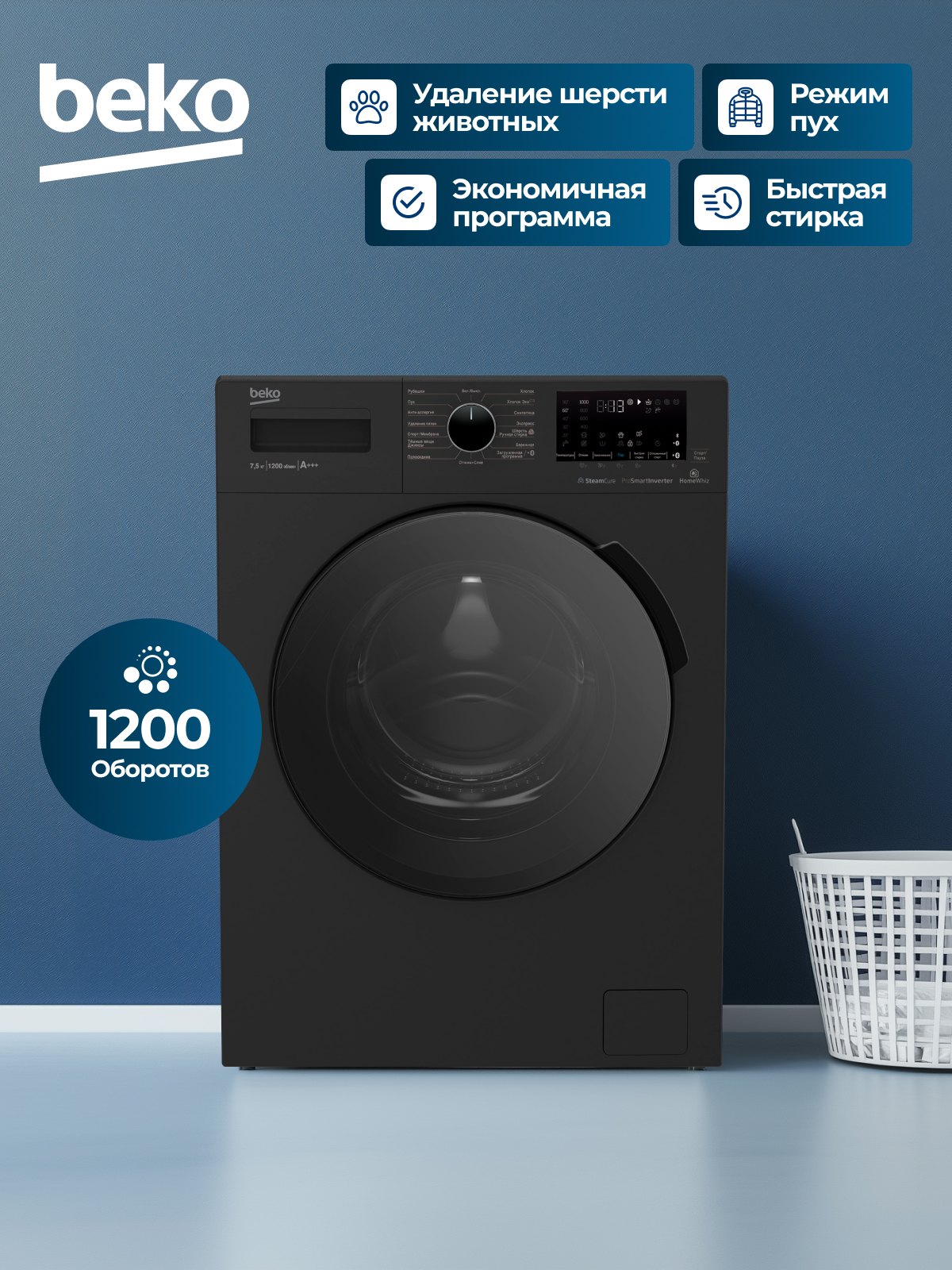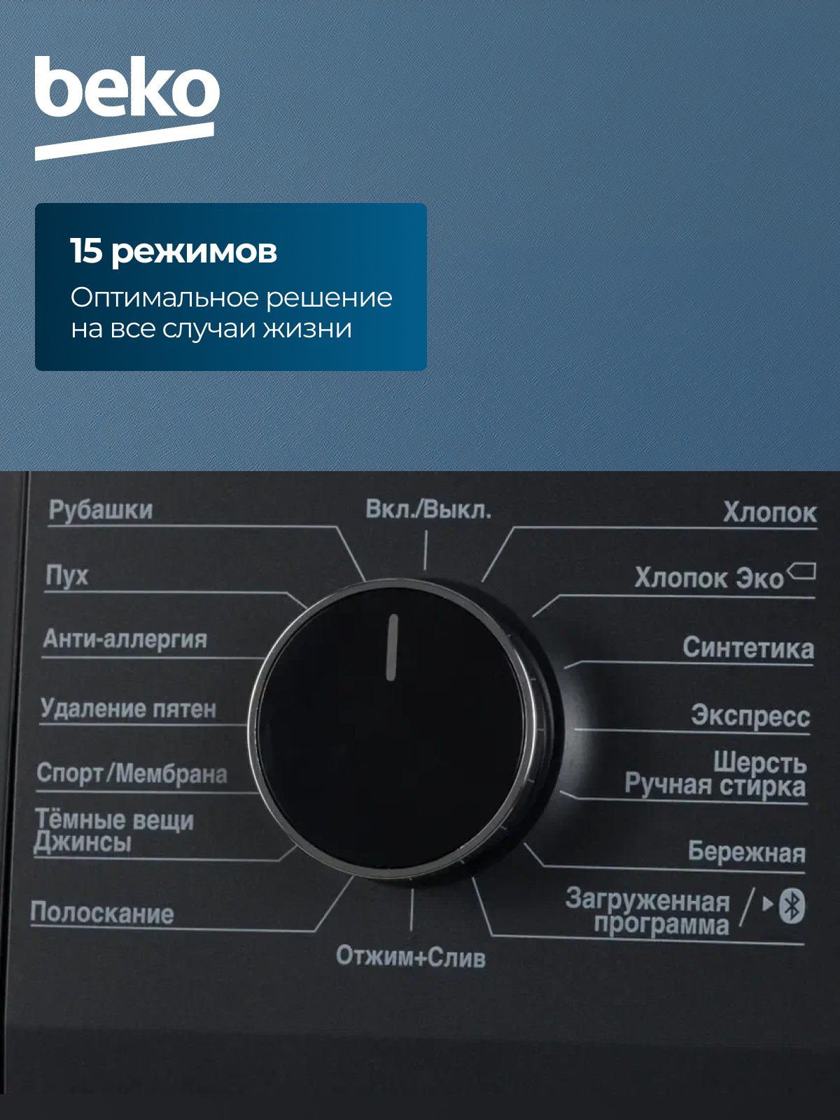 Быстрая стирка;Сушка: Хлопок;Удаление пятен;Стирка изделий из синтетики;Стирка изделий из джинсовой ткани;Стирка спортивной одежды;Стирка пуховых вещей;Отжим;Полоскание;Замачивание