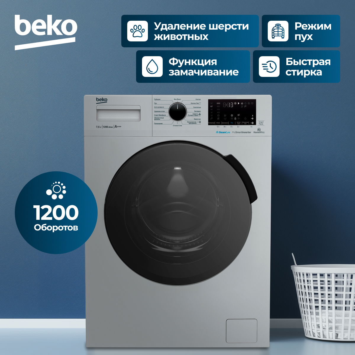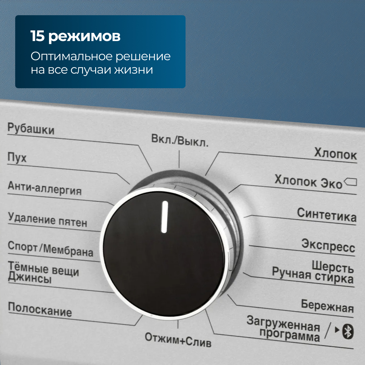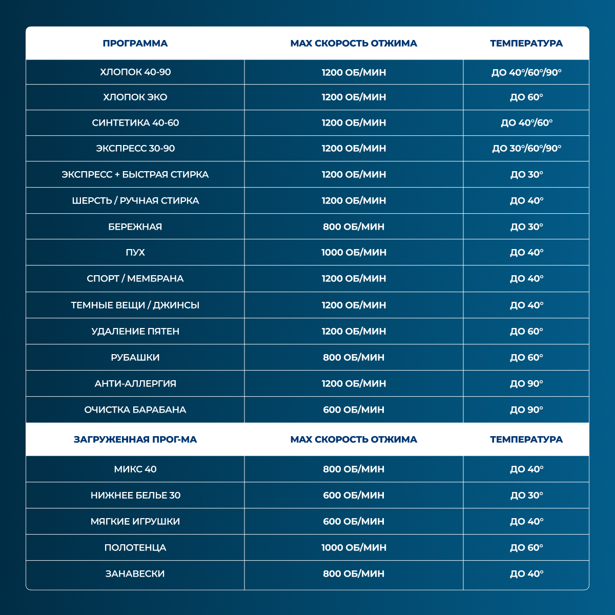 Быстрая стирка;Удаление пятен;Сушка: Хлопок;Стирка изделий из синтетики;Стирка изделий из джинсовой ткани;Стирка спортивной одежды;Стирка пуховых вещей;Отжим;Полоскание;Замачивание