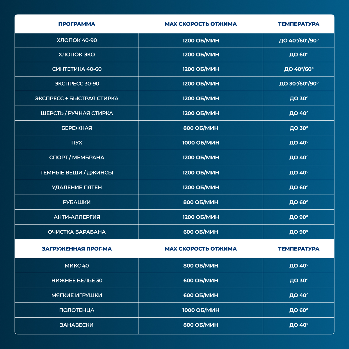Быстрая стирка;Сушка: Хлопок;Удаление пятен;Стирка изделий из синтетики;Стирка изделий из джинсовой ткани;Стирка спортивной одежды;Стирка пуховых вещей;Отжим;Полоскание;Замачивание
