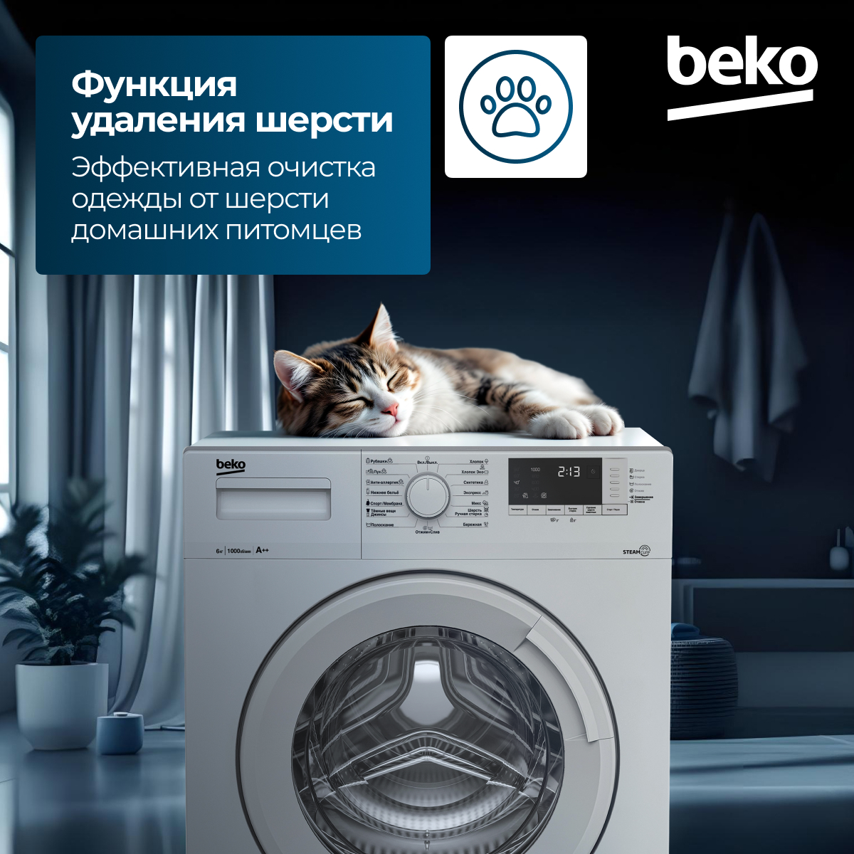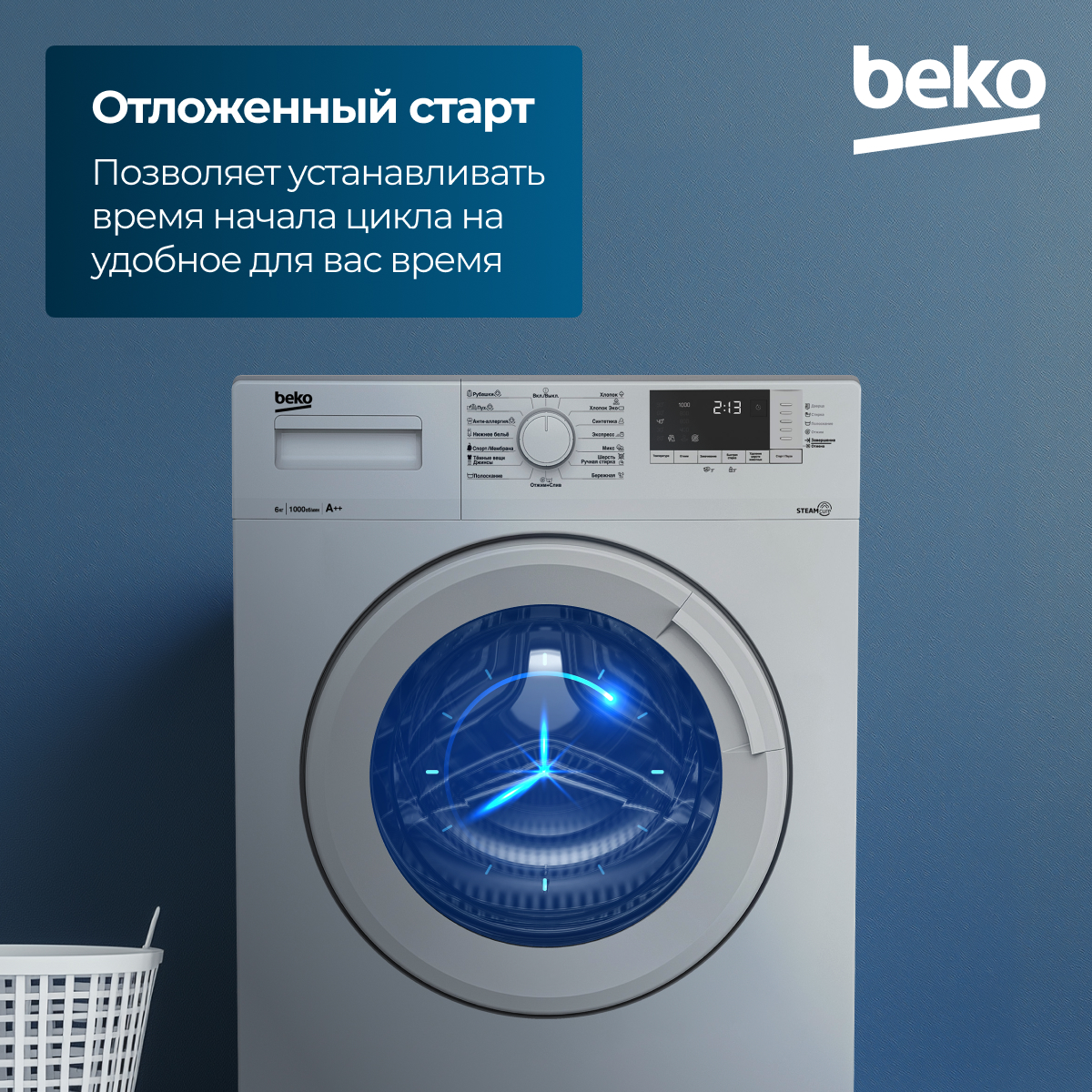 Fast+, Замачивание, Отсрочка запуска, Плавная регулировка скорости отжима, Технология обработки паром SteamCure, Экстра полоскание, Электронный контроль дисбаланса