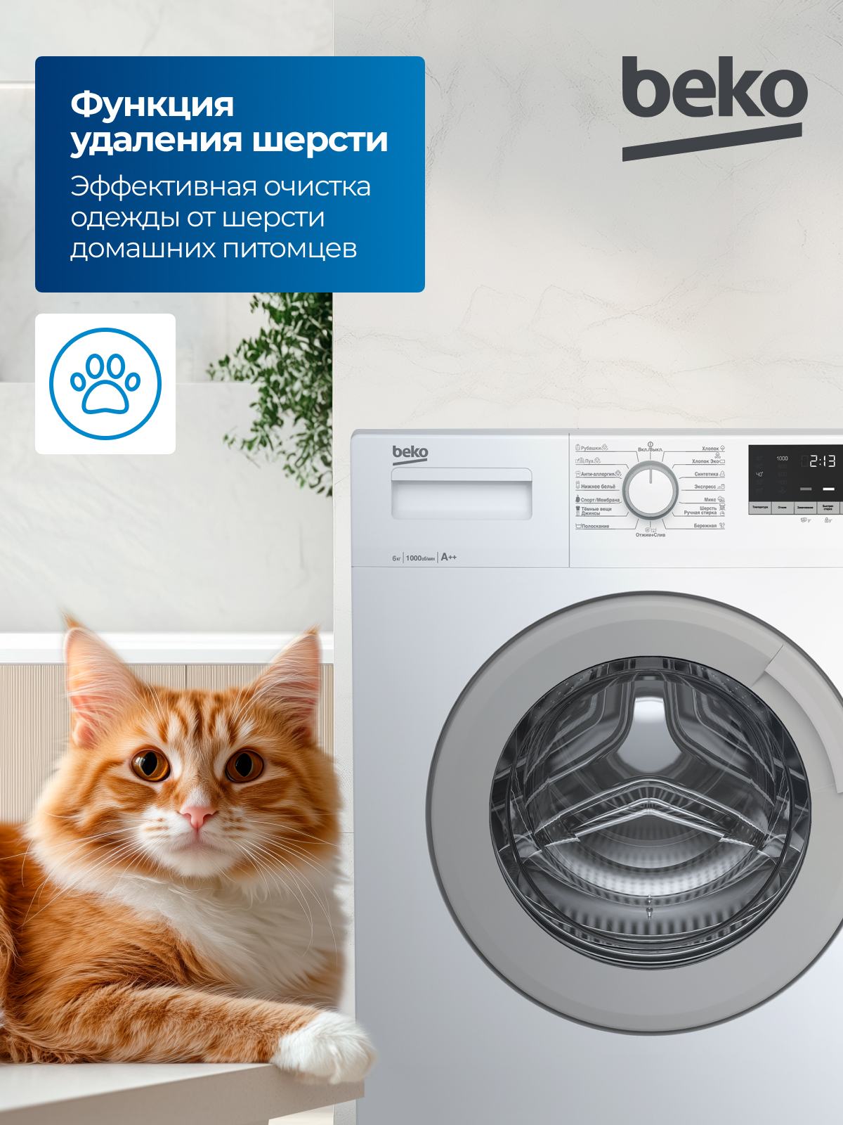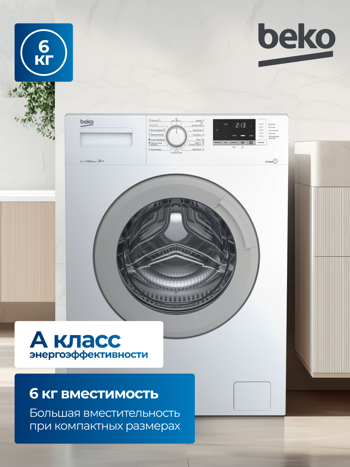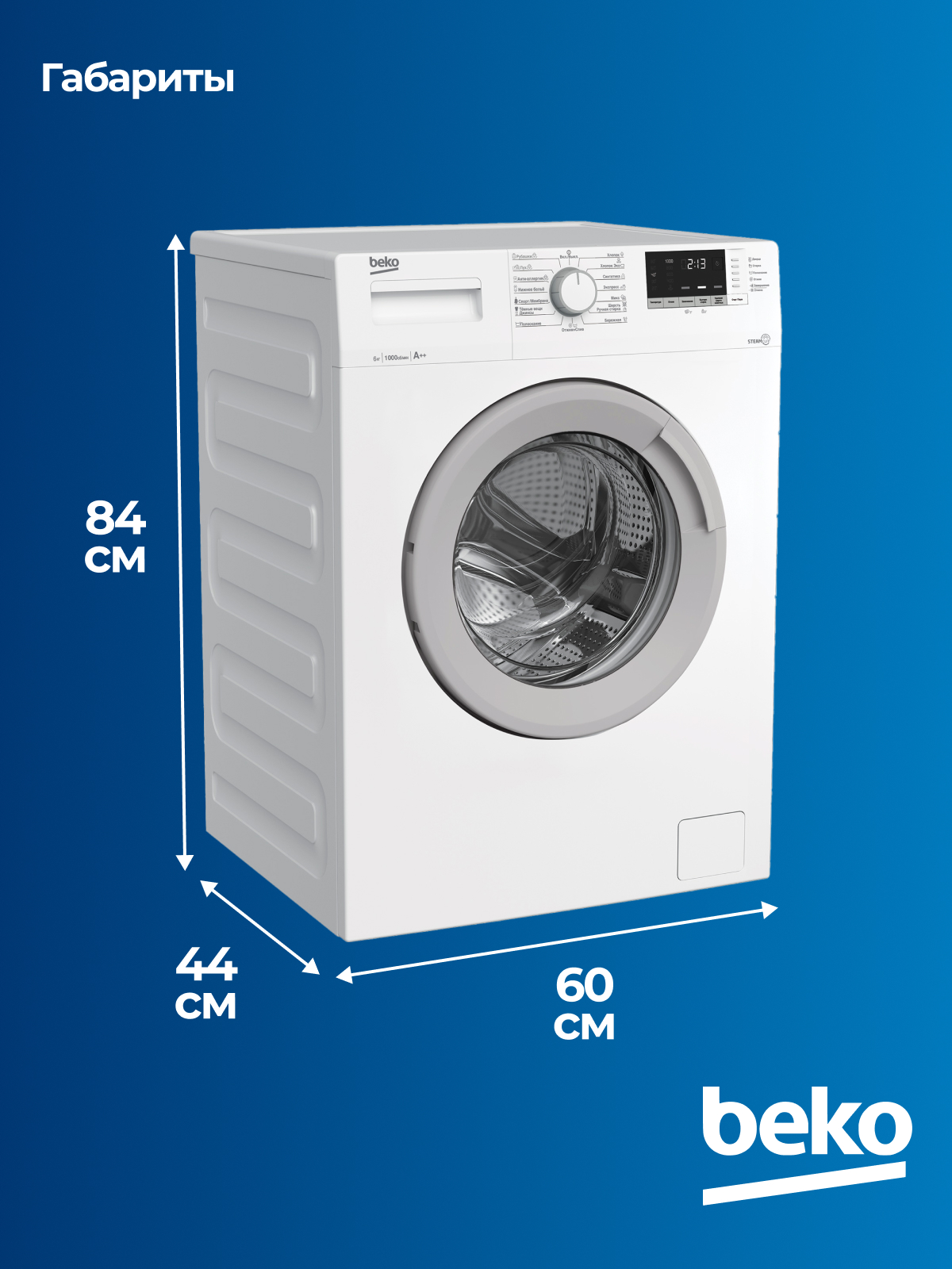 BEKO WSDN63512ZSW с фронтальной загрузкой за один цикл расходует до 45 л воды. Для выбора программы используется поворотная большая ручка. Также для управления функциями используются кнопки, расположенные под дисплеем: они позволяют изменять температуру нагрева воды, активировать замачивание, включать быструю стирку и удаление шерсти животных. Информативный дисплей и система индикаторов обеспечивают более комфортную настройку прибора и позволяют следить за его состоянием.