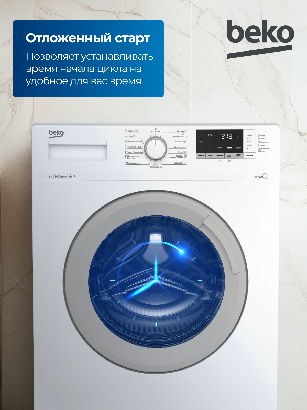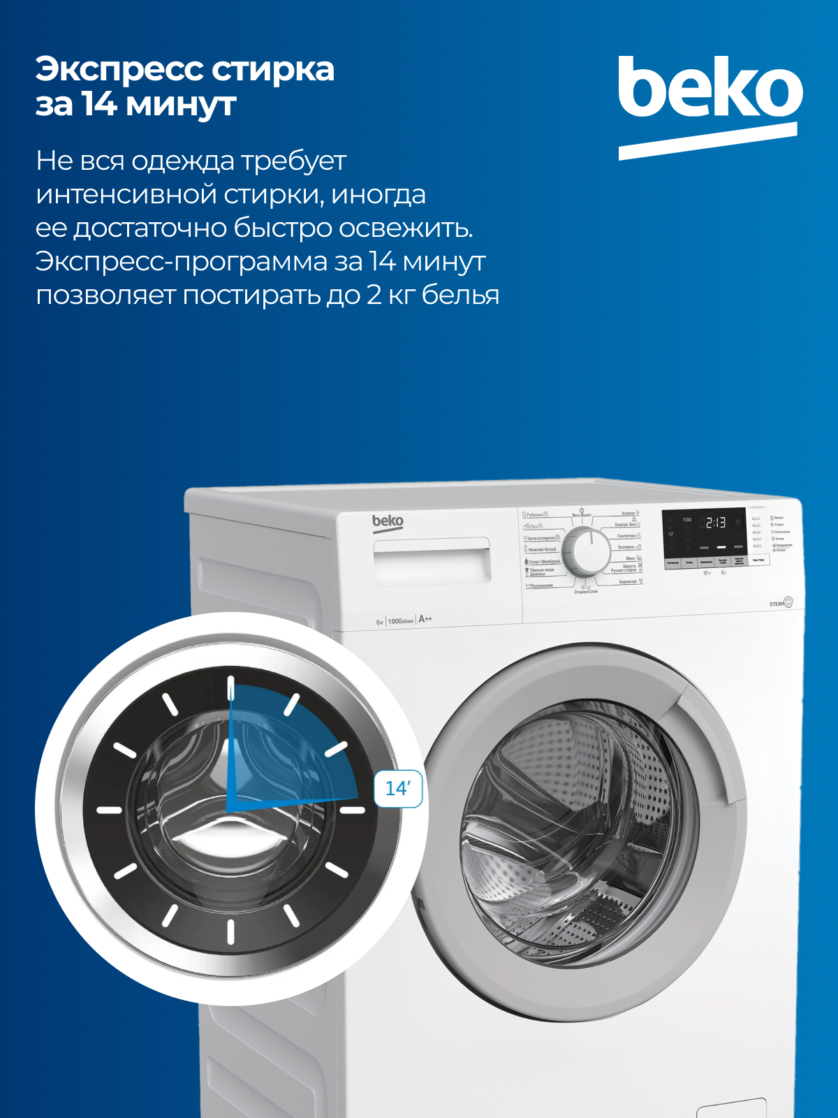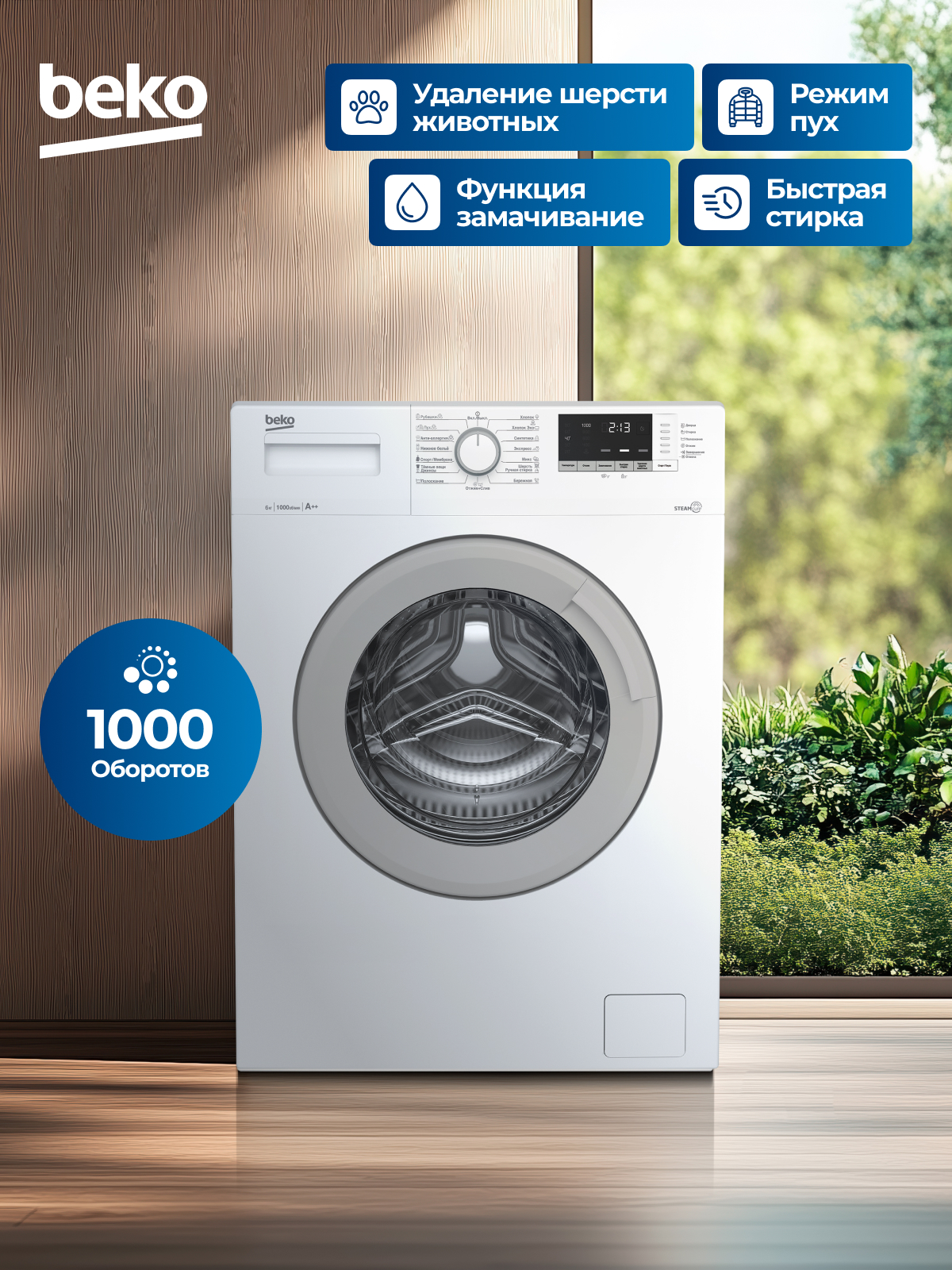 BEKO WSDN63512ZSW с фронтальной загрузкой за один цикл расходует до 45 л воды. Для выбора программы используется поворотная большая ручка. Также для управления функциями используются кнопки, расположенные под дисплеем: они позволяют изменять температуру нагрева воды, активировать замачивание, включать быструю стирку и удаление шерсти животных. Информативный дисплей и система индикаторов обеспечивают более комфортную настройку прибора и позволяют следить за его состоянием.