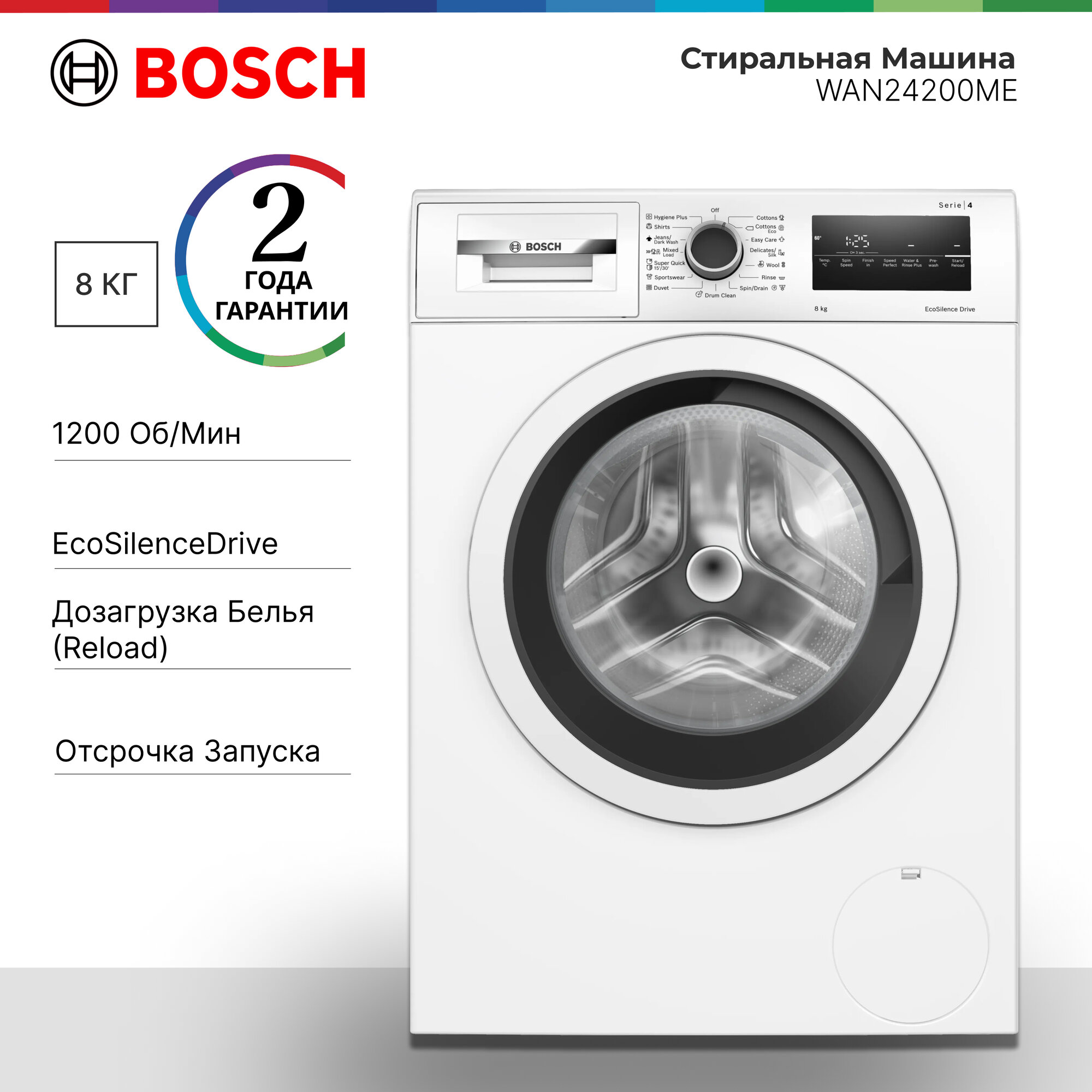 • Большой дисплей для отображения прогресса выполнения программы, температуры, скорости отжима, оставшегося времени, отложенного на 24 ч старта и рекомендацией по загрузке