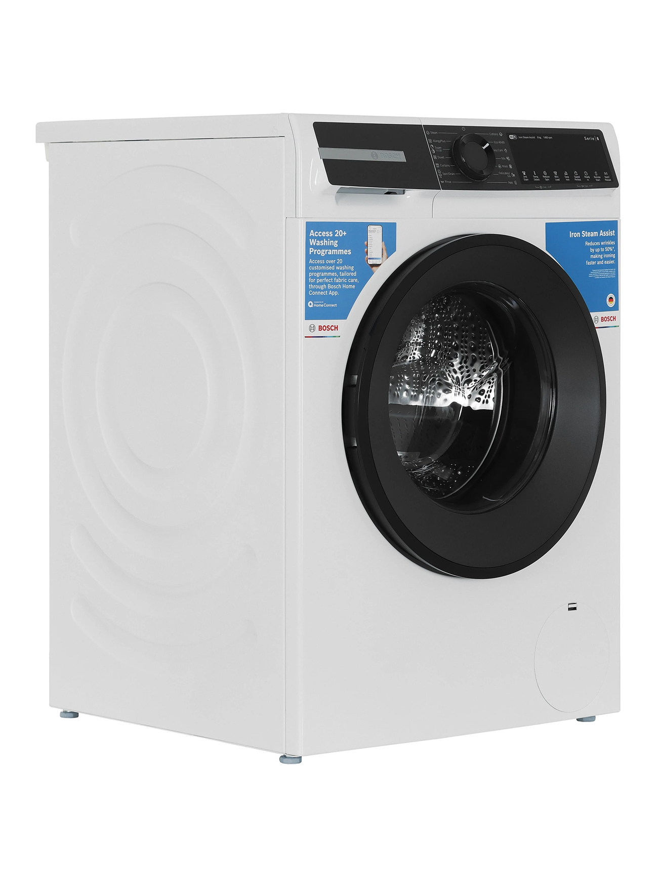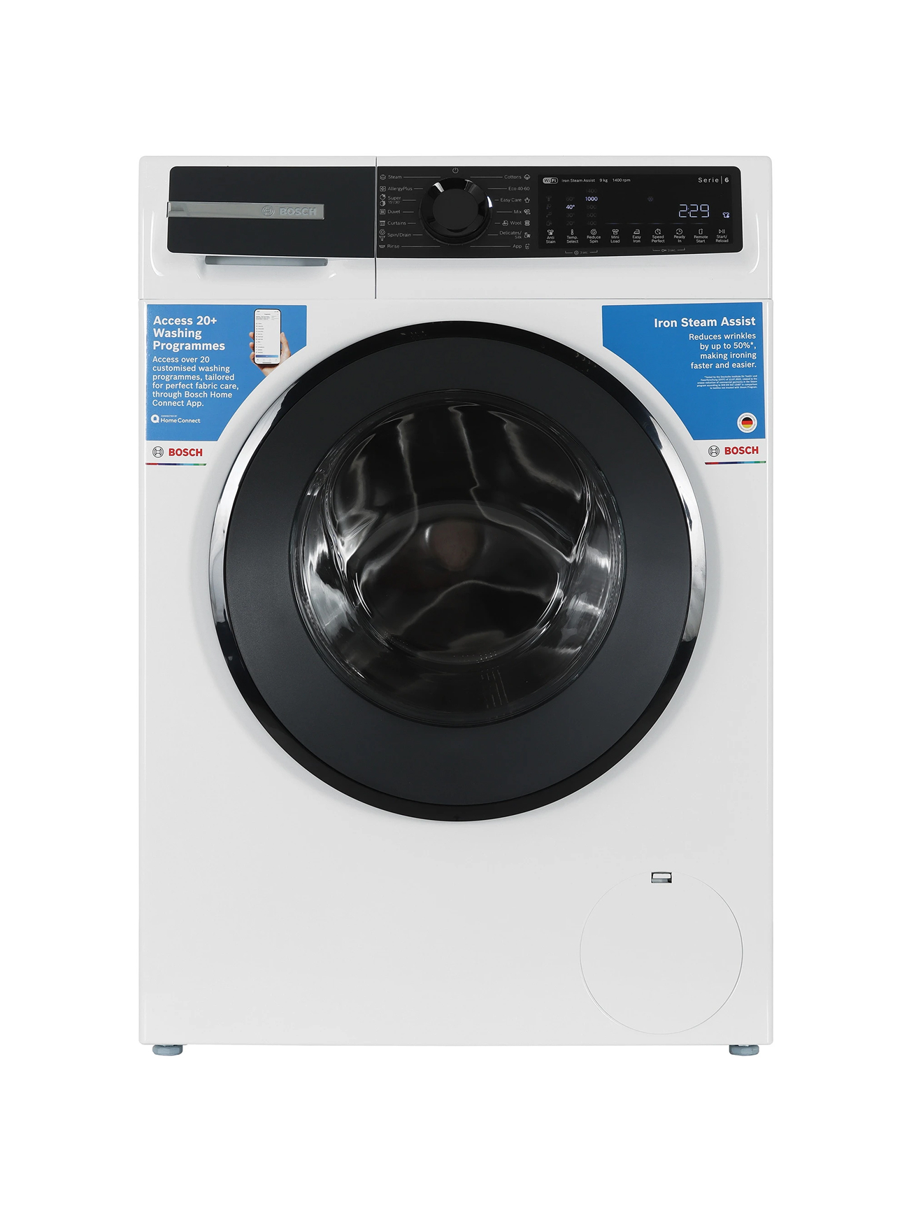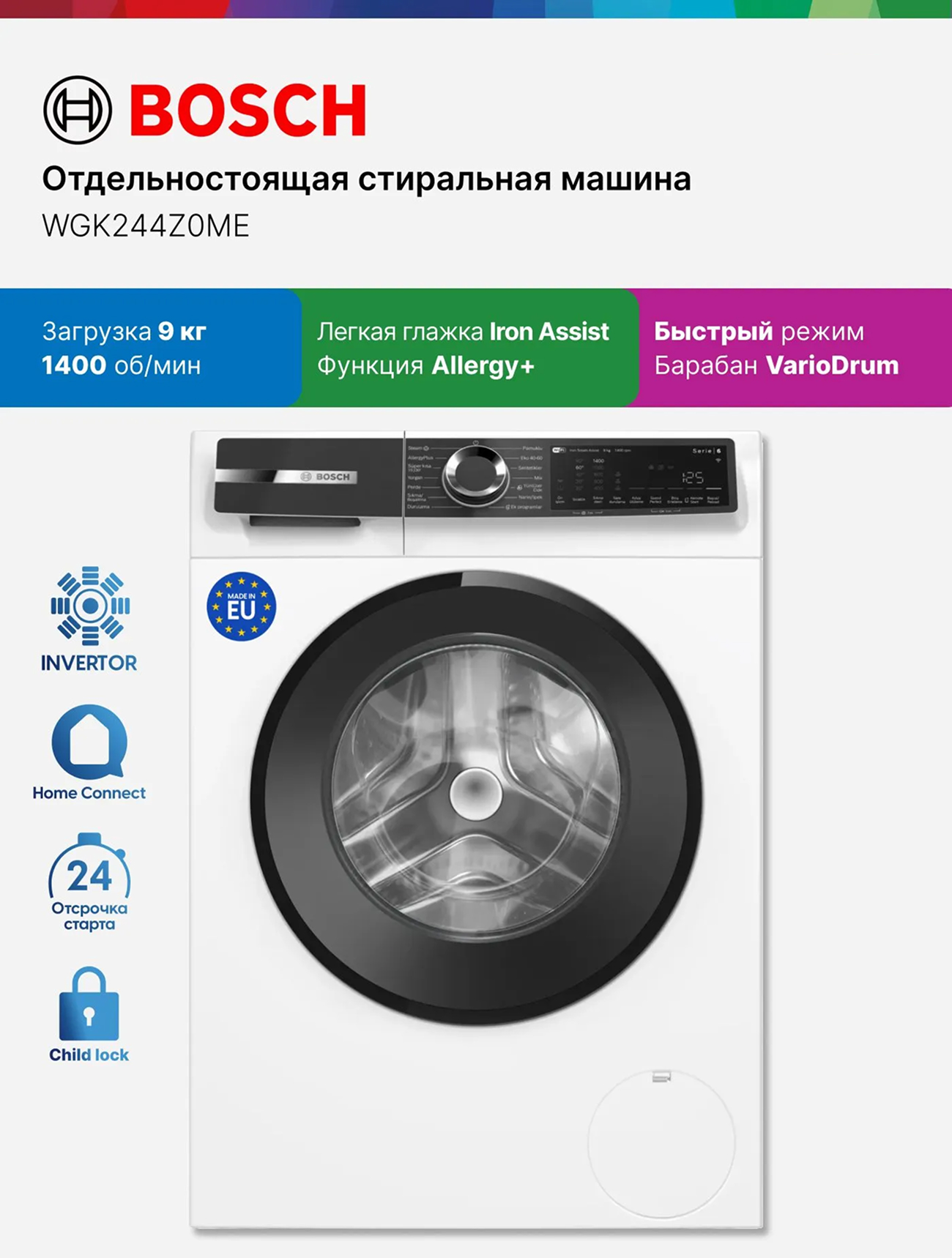 Bosch Стиральная машина WGK244Z0ME, Serie 6, 9 кг, 14 программ, 1400 об/мин, инверторный двигатель, барабан VarioDrum, технология ActiveWater, режим SpeedPerfect, функция Iron Assist, белая