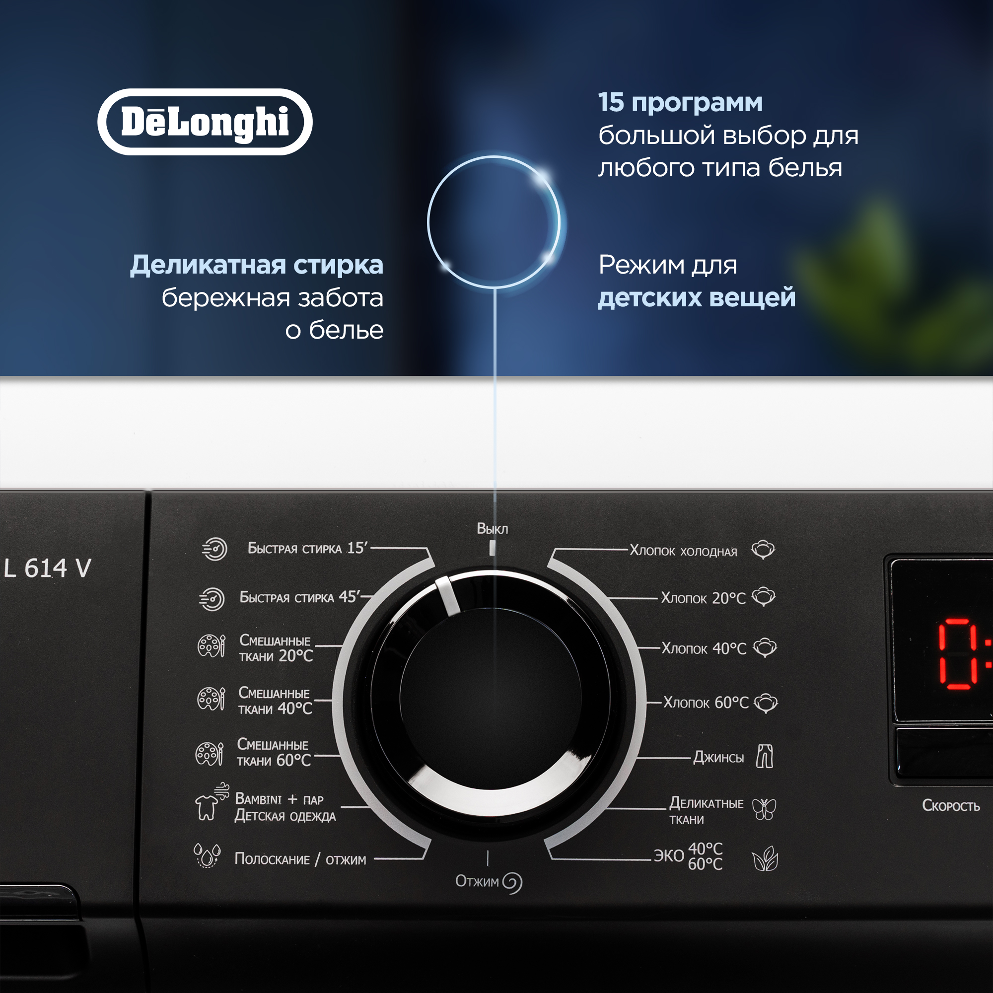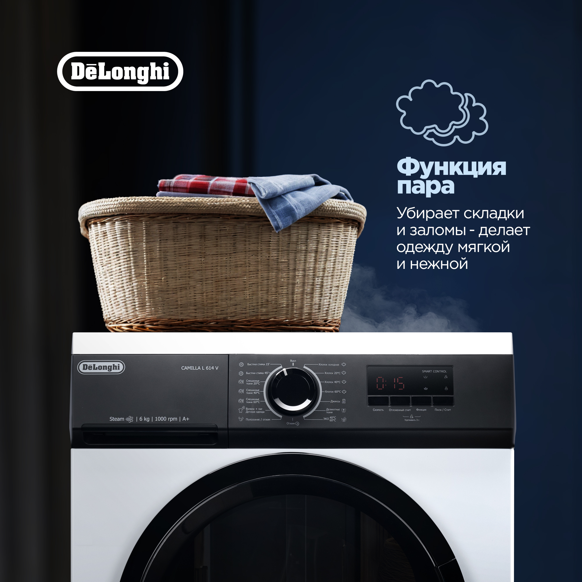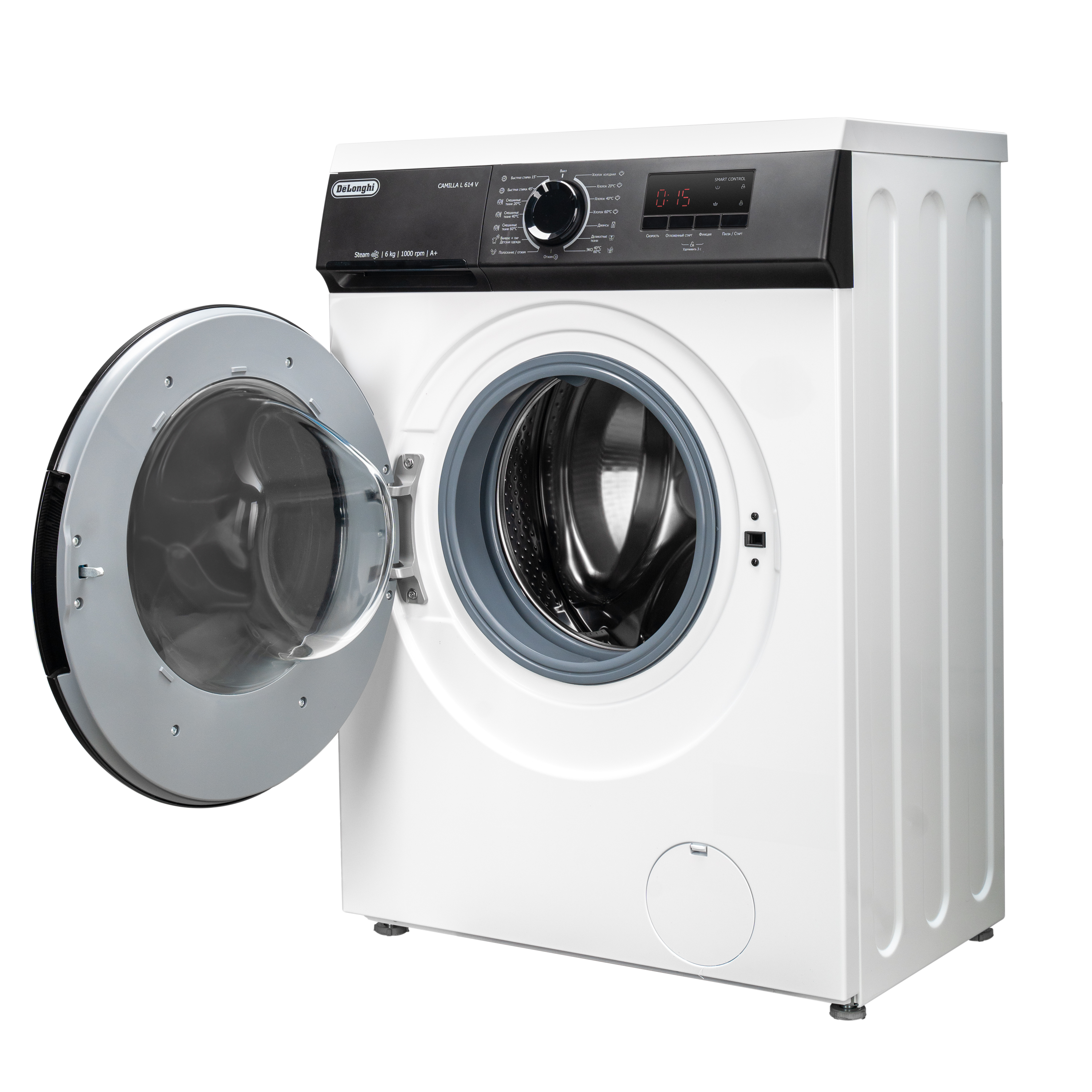 Стиральная машина DeLonghi CAMILLA L 614 V имеет 15 программ для ухода за детскими вещами, джинсами, постельным бельем, текстильными изделиями из цветных тканей. Функция подачи пара обеспечивает обработку одежды для удаления микроорганизмов, аллергенов, неприятных запахов, складок. Скорость отжима и температуру можно устанавливать самостоятельно в зависимости от типа материала, степени загрязнения для бережного очищения. Отсрочка запуска позволяет выполнять стирку в период действия сниженных тарифов на электрическую энергию или для завершения программы к определенному моменту. Стиральная машина DeLonghi CAMILLA L 614 V при обнаружении дисбаланса активирует вращение барабана в обратном направлении. Это обеспечивает равномерное распределение вещей и эффективный отжим без вибрации. Специальная система запускает дополнительное полоскание в случае излишнего пенообразования для удаления моющего средства. Модель имеет селектор выбора программ, кнопки настроек и LED-дисплей. Функция Bambino Controle позволяет заблокировать панель управления для предотвращения случайных нажатий детьми.
