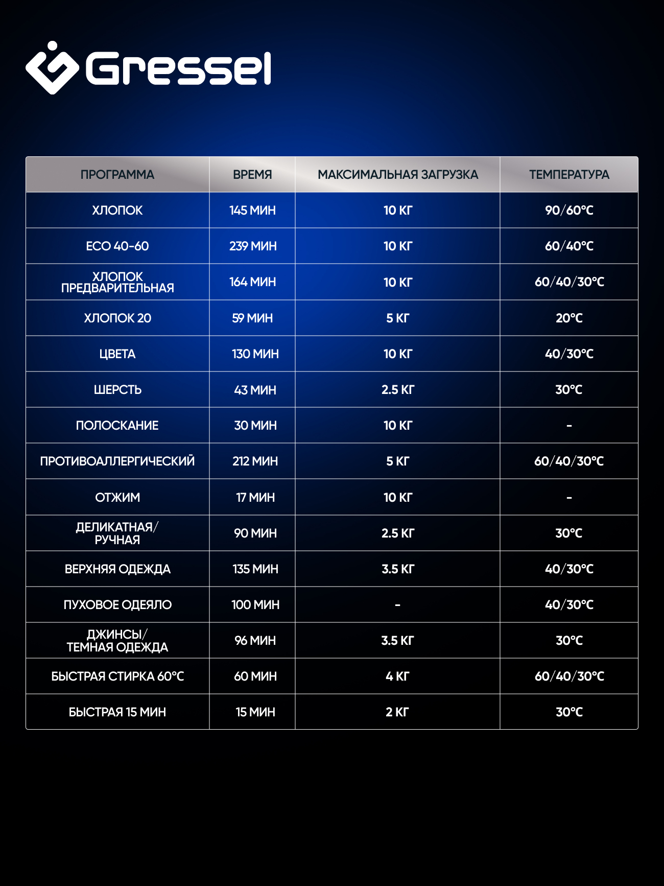 Быстрая 15'; Быстрая 60'; Хлопок; Эко 40-60; Предварительная стирка; Хлопок 20 С; Цветное белье; Шерсть; Полоскание; Джинсы; Пуховое одеяло; Спортивная одежда; Ручная стирка; Отжим/Слив; Антиаллергия