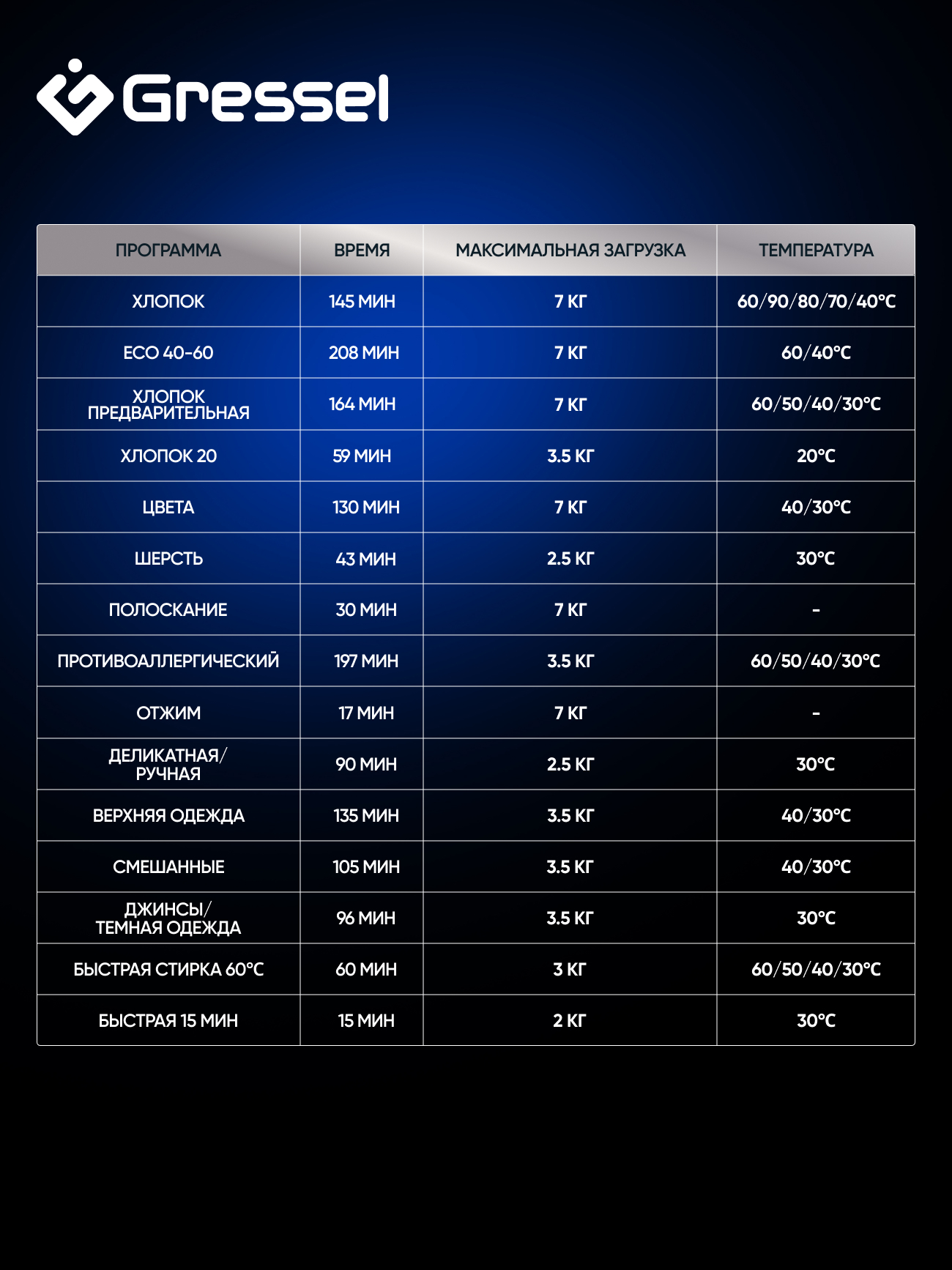 Быстрая 15'; Быстрая 60'; Хлопок; Эко 40-60; Предварительная стирка; Хлопок 20 С; Цветное белье; Шерсть; Полоскание; Джинсы; Пуховое одеяло; Спортивная одежда; Ручная стирка; Отжим/Слив; Антиаллергия