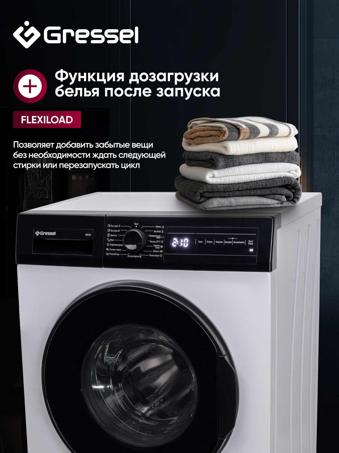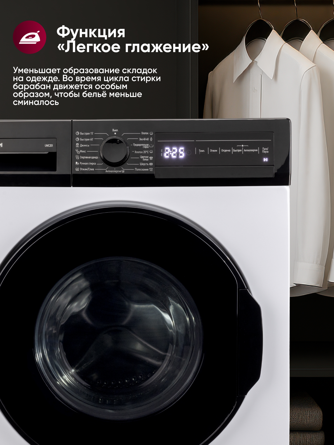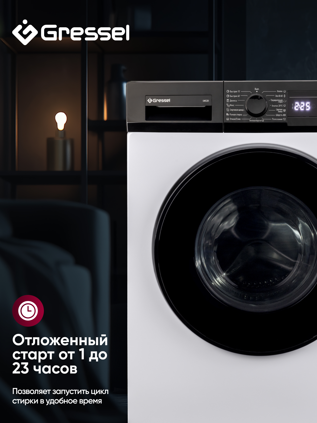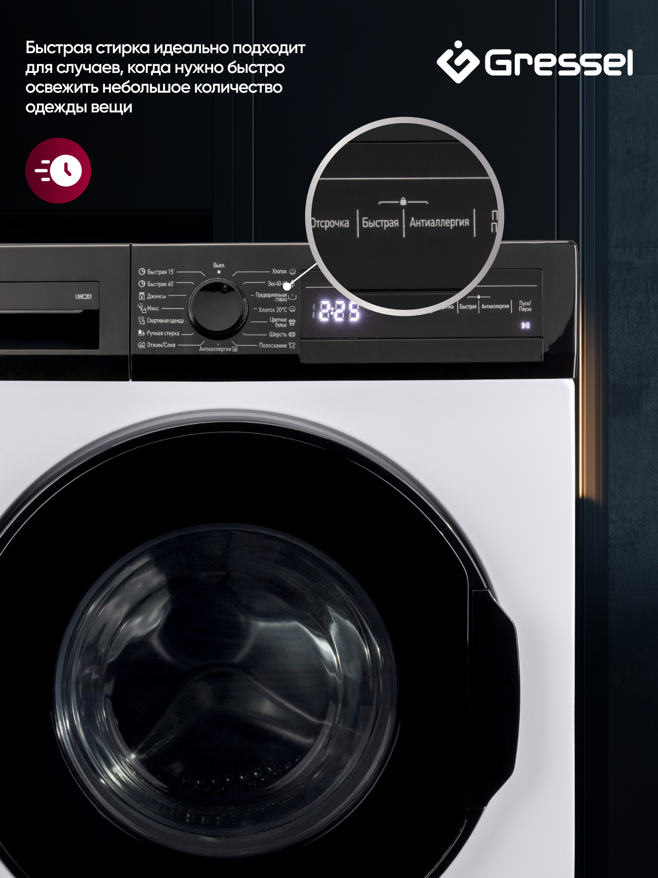 Несмотря на высокую производительность, машина остаётся энергоэффективной — класс A и потребление энергии 2,13 кВтч на цикл. Сенсорная панель с цифровым дисплеем показывает текущий режим и время до завершения, а белый корпус придаёт модели современный и лаконичный вид. Gressel UWC201 — это надёжность, компактность и функциональность в одном стильном решении.