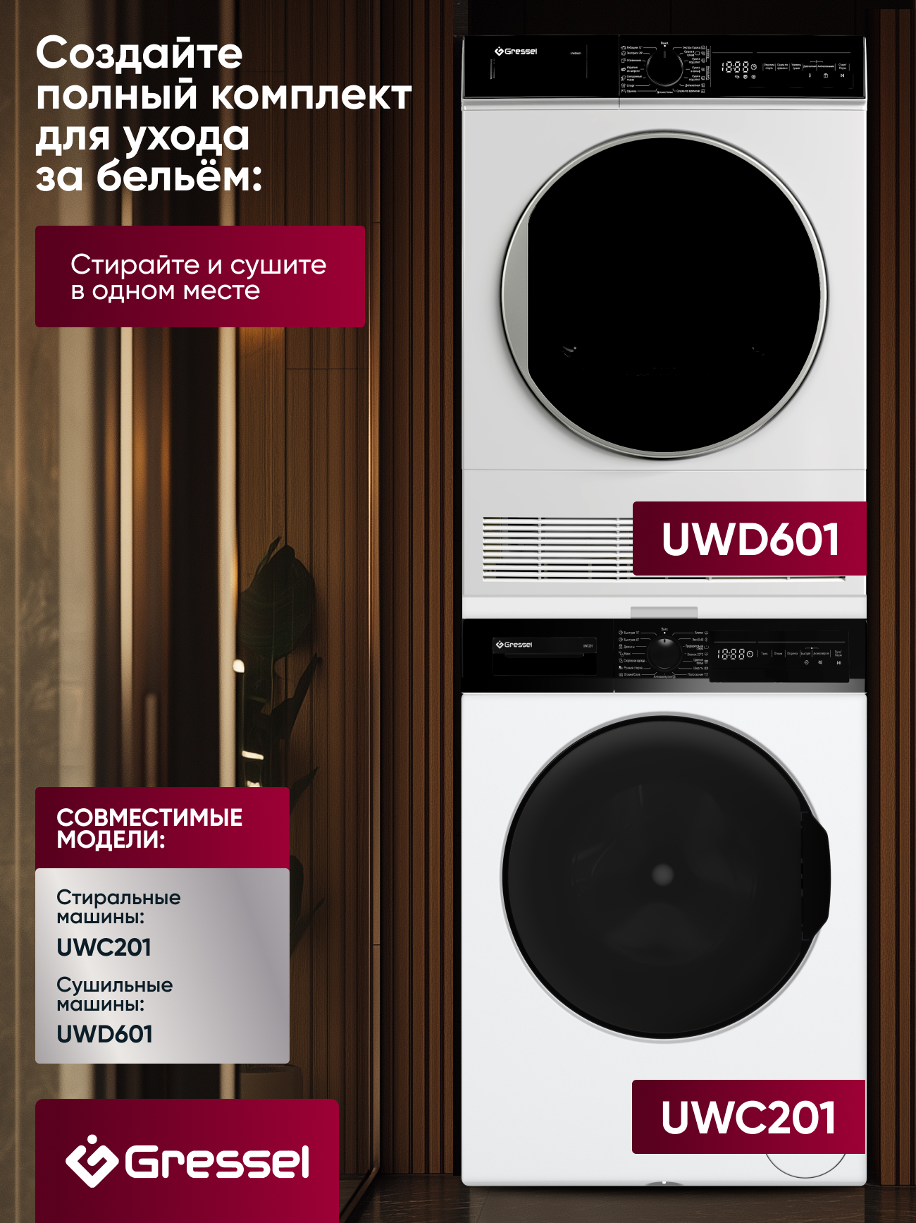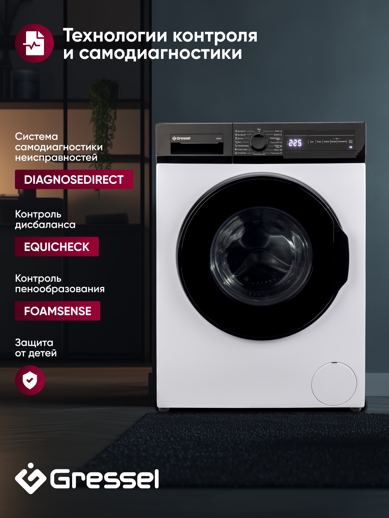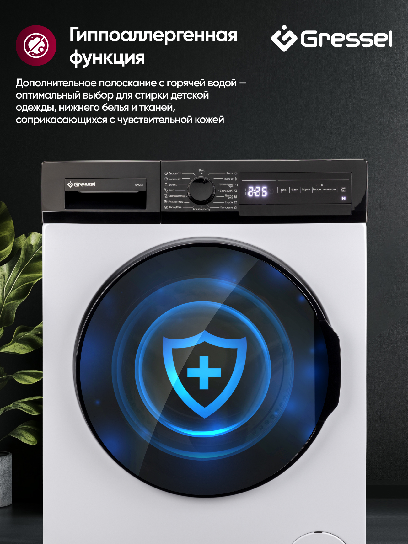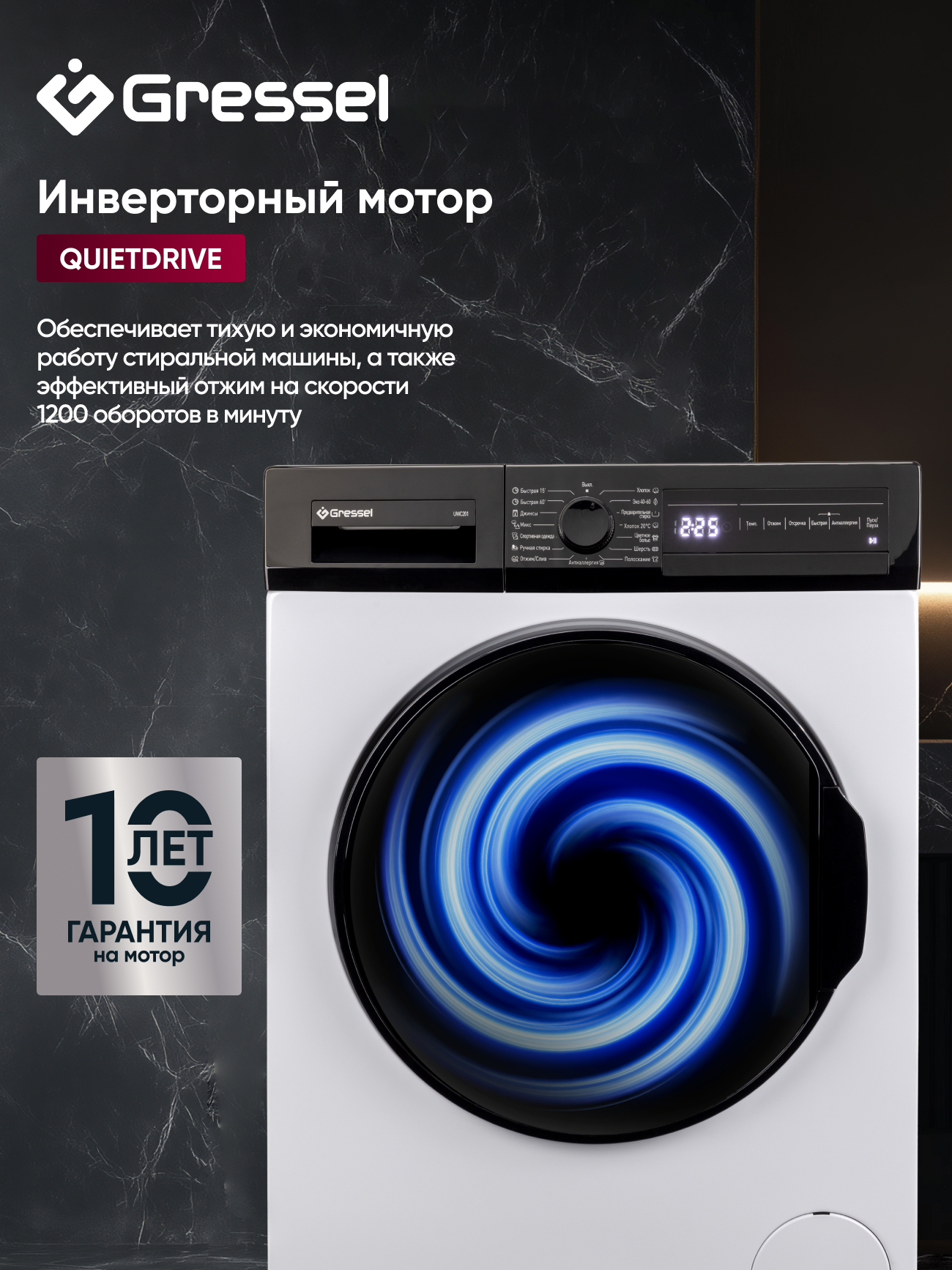 Стиральная машина Gressel UWC201 — компактная и умная модель с современным инверторным двигателем, которая подойдёт для повседневного использования в любых условиях. При глубине всего 49,7 см она вмещает до 7 кг белья, сохраняя эффективность и функциональность полноразмерной техники. Это особенно важно для небольших ванных комнат, где каждый сантиметр пространства на счету. Барабан с сотовой поверхностью объёмом 45 литров бережно обращается с тканью — от тонких рубашек до плотных джинсов или одеял.