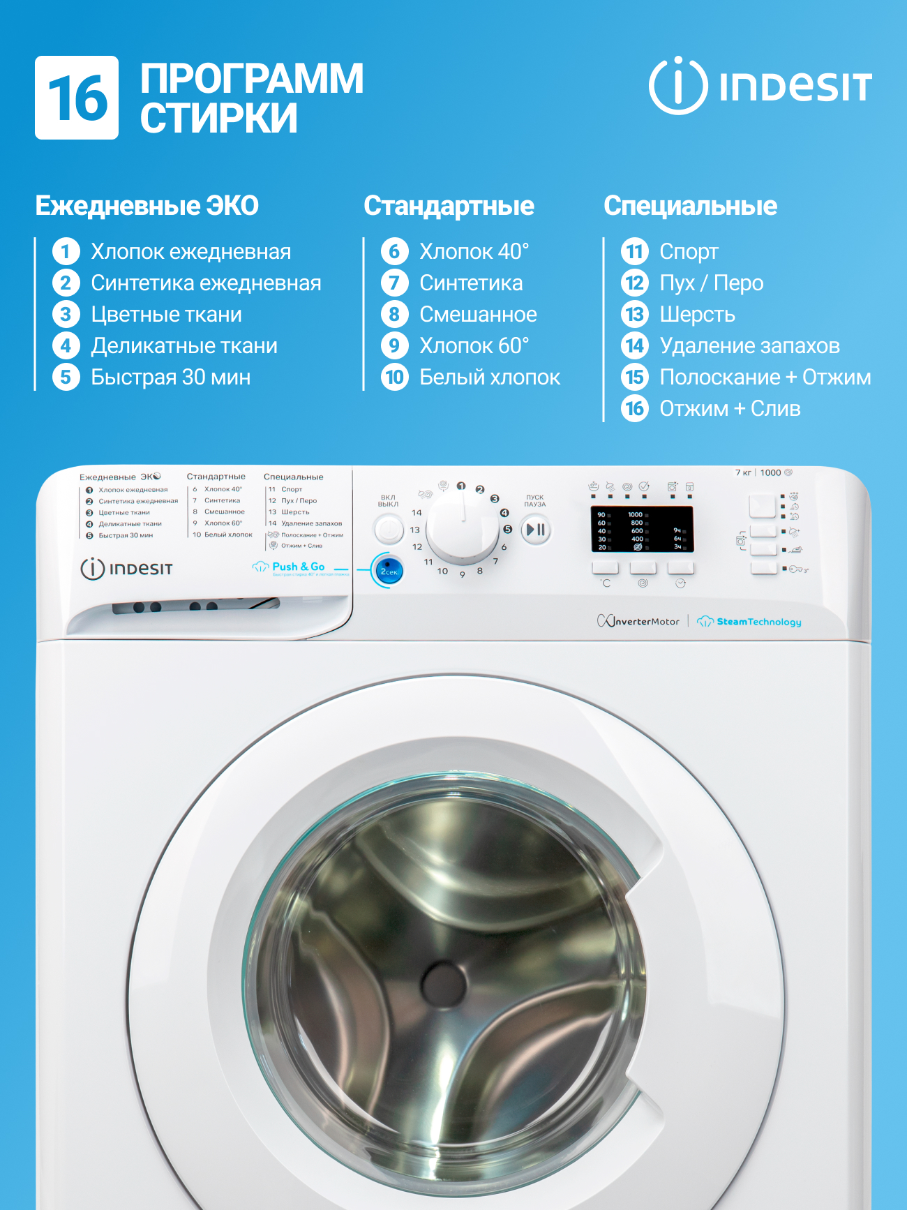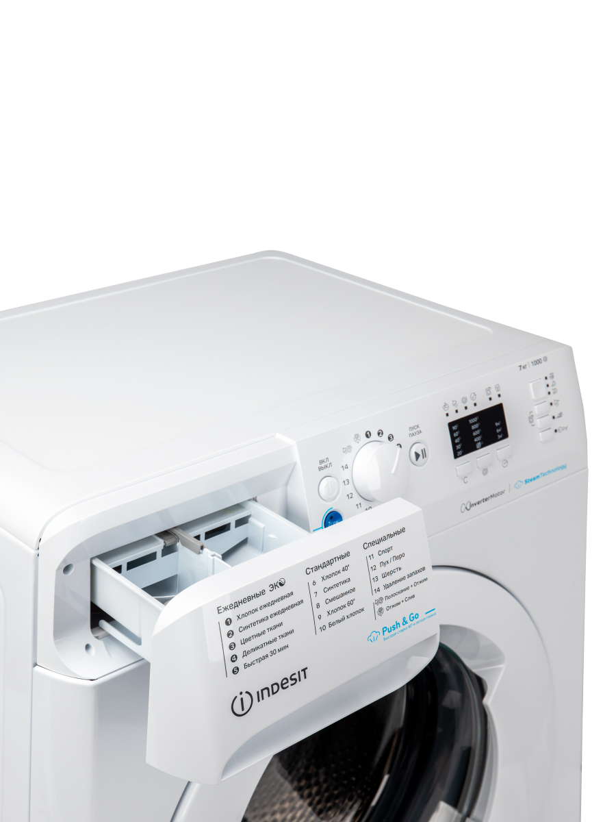 Инверторный мотор и LED-дисплей делают использование машины удобным и тихим. С 12 программами стирки, включая режимы для различных типов тканей, вы сможете легко подобрать нужный режим для любой одежды. Функции Push&Go Steam и отложенного запуска добавляют гибкости в планирование стирки.