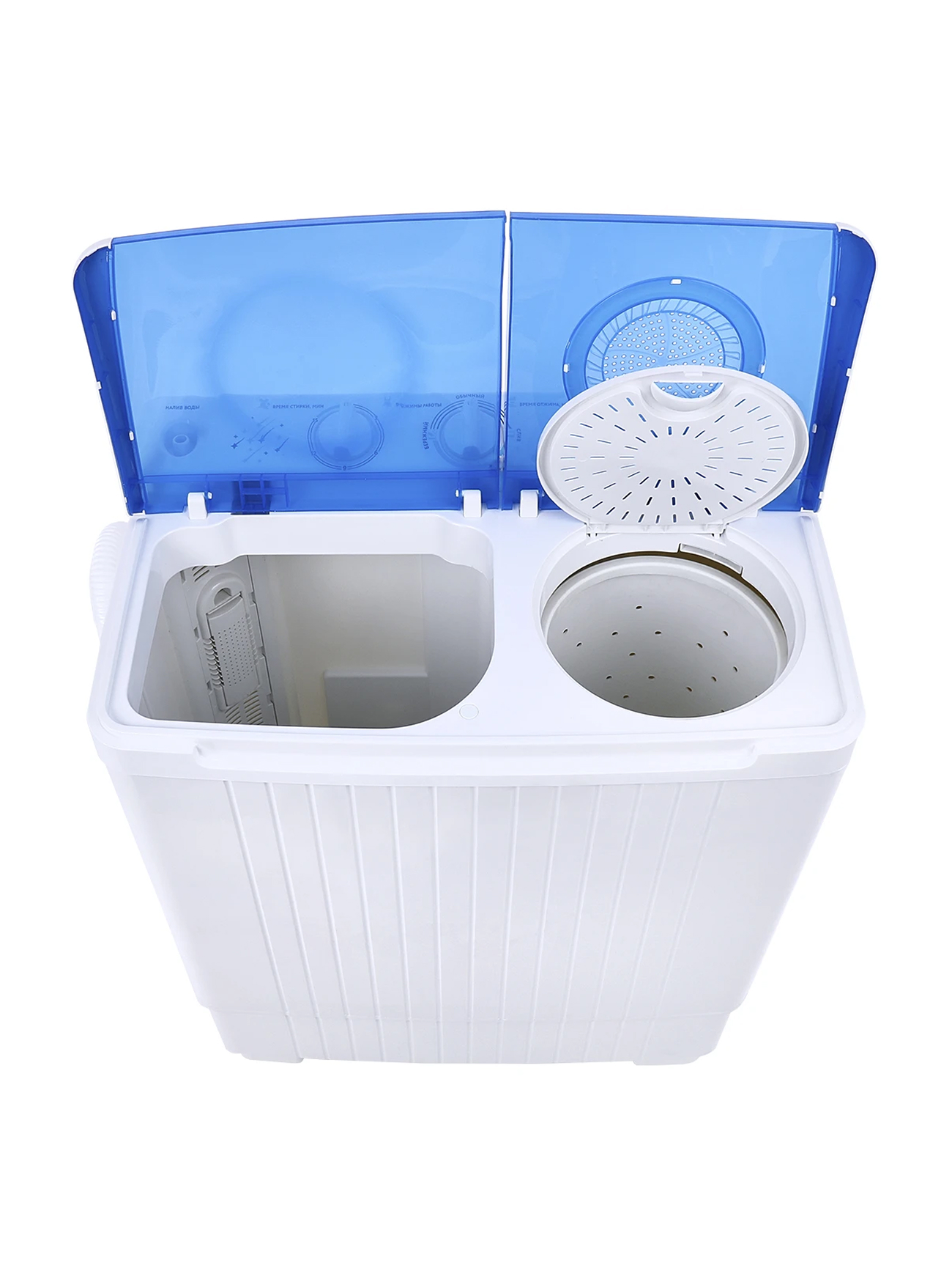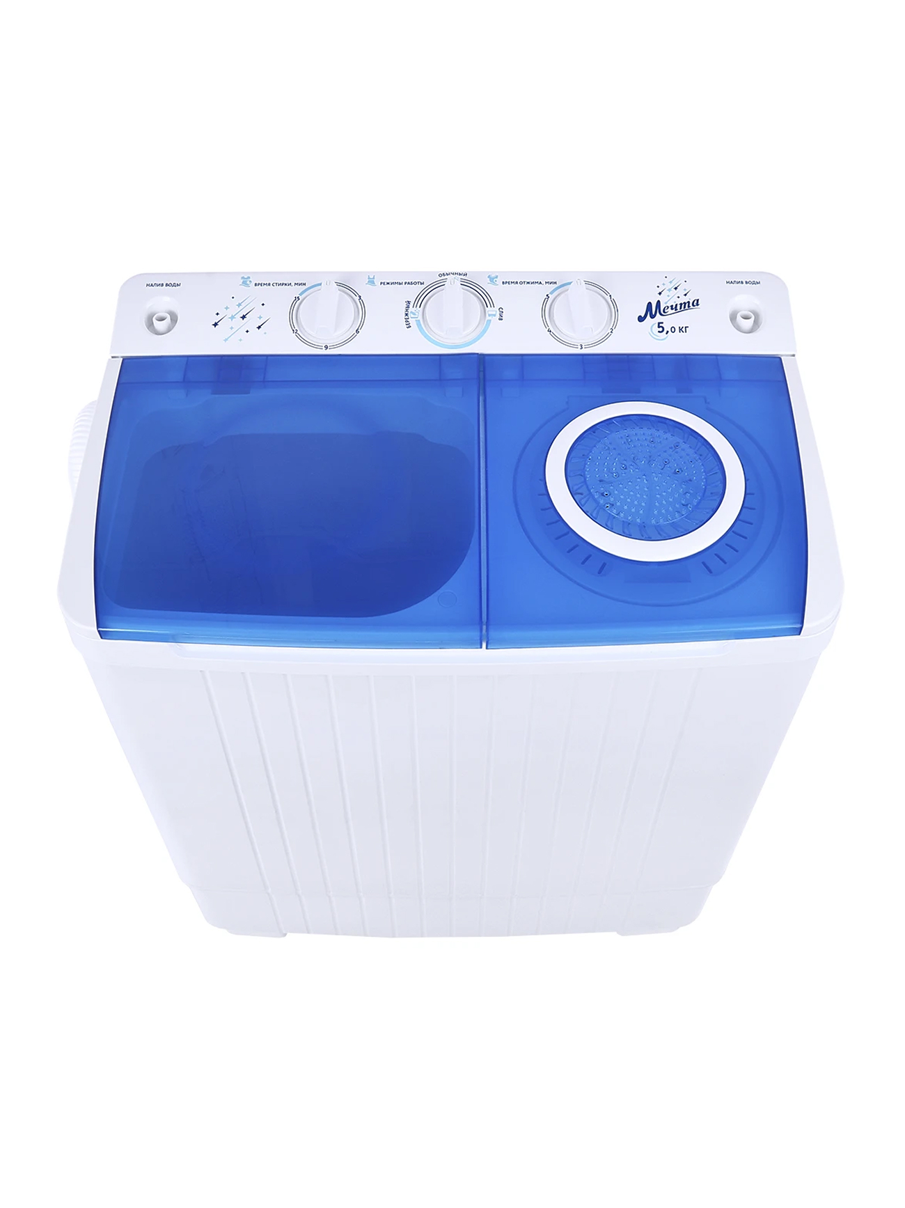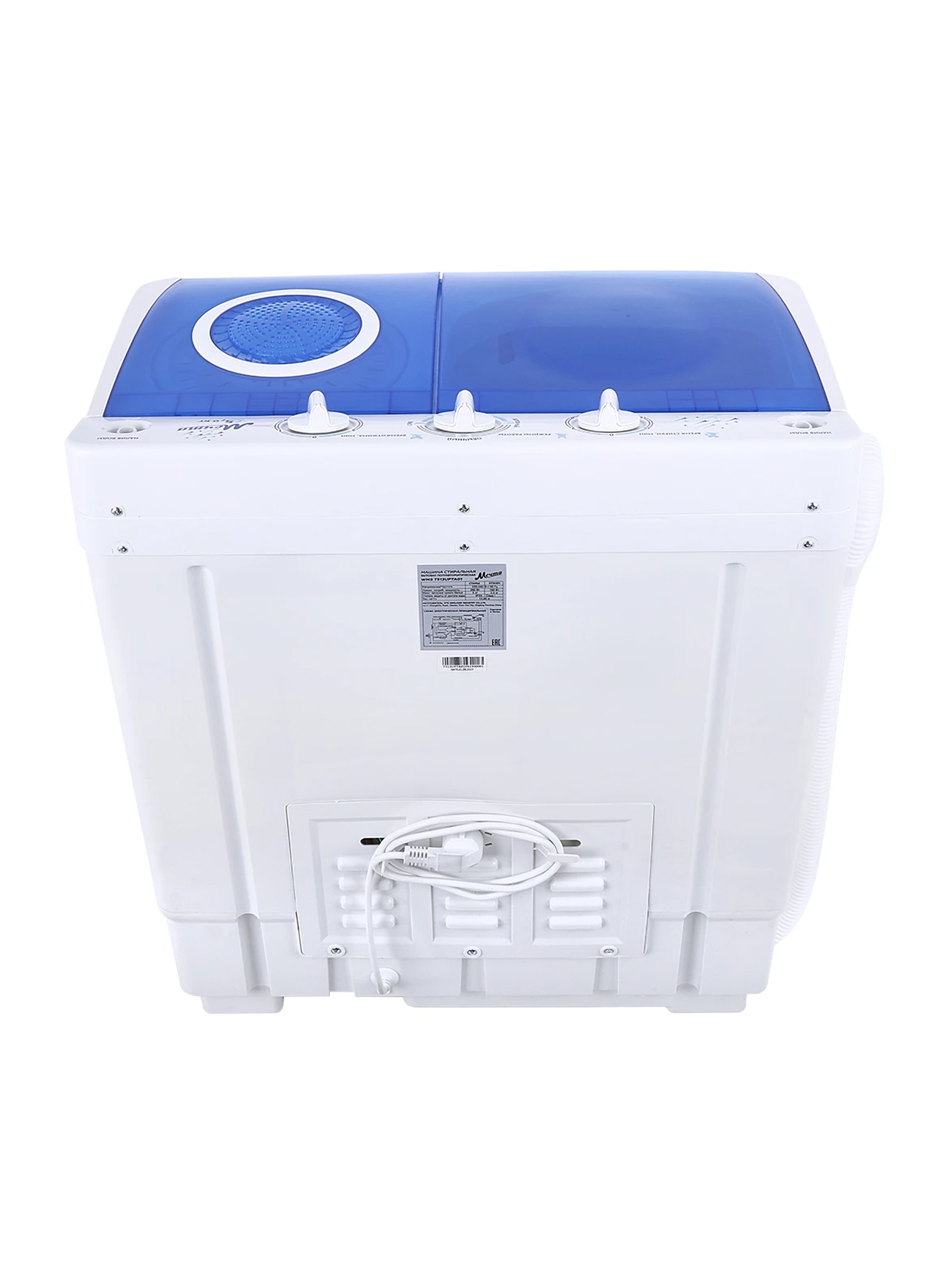 Система TornadoDry (воздушная сушка белья)! Загрузка для стирки 5кг; загрузка для отжима 3,5кг; помпа; мощность мотора (стирка/отжим) 280/160Вт; отжим 1350 об/мин; таймер стирки до 15 мин; таймер отжима до 5 мин; габариты изделия 660х390х765 мм; вес 13,85 кг